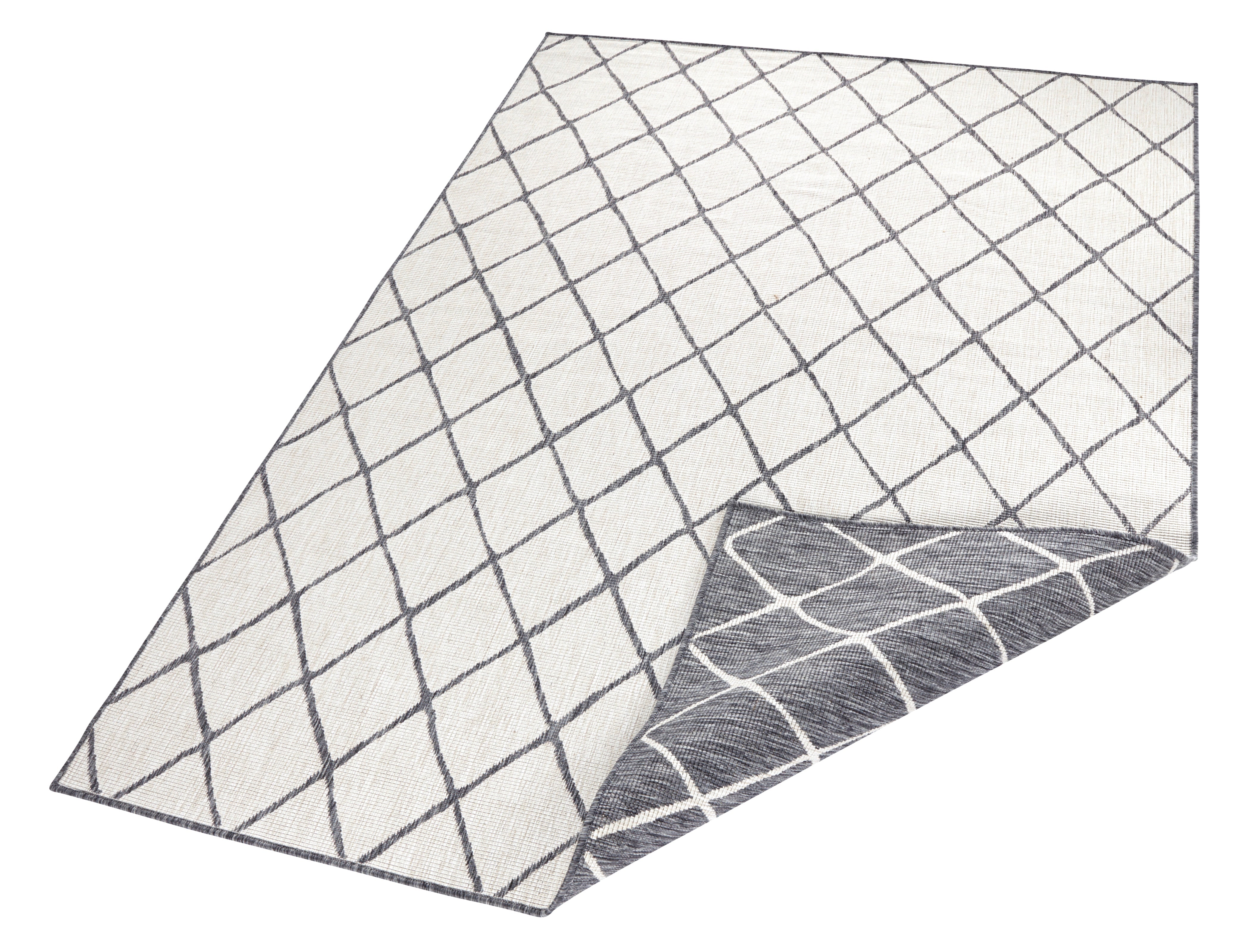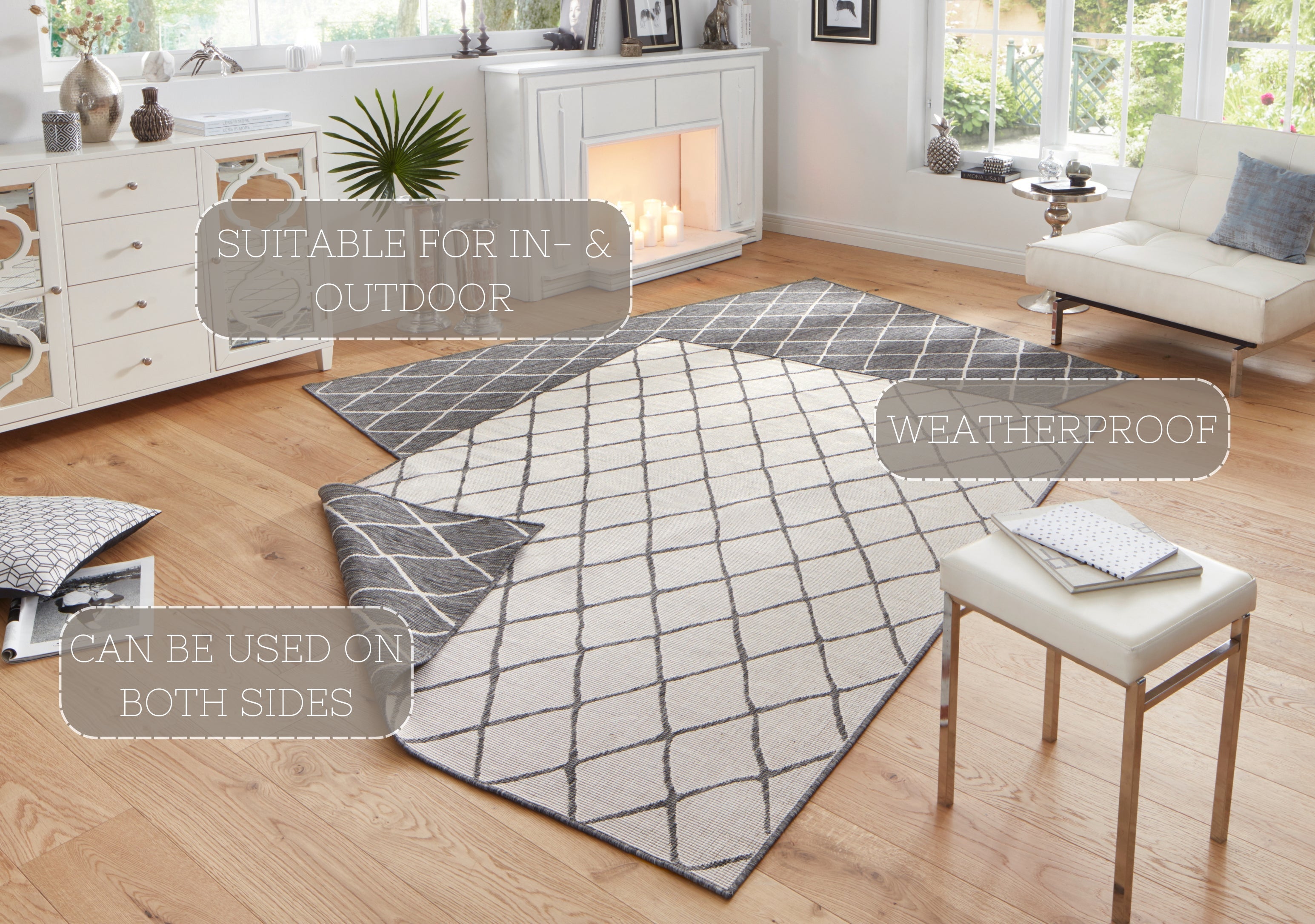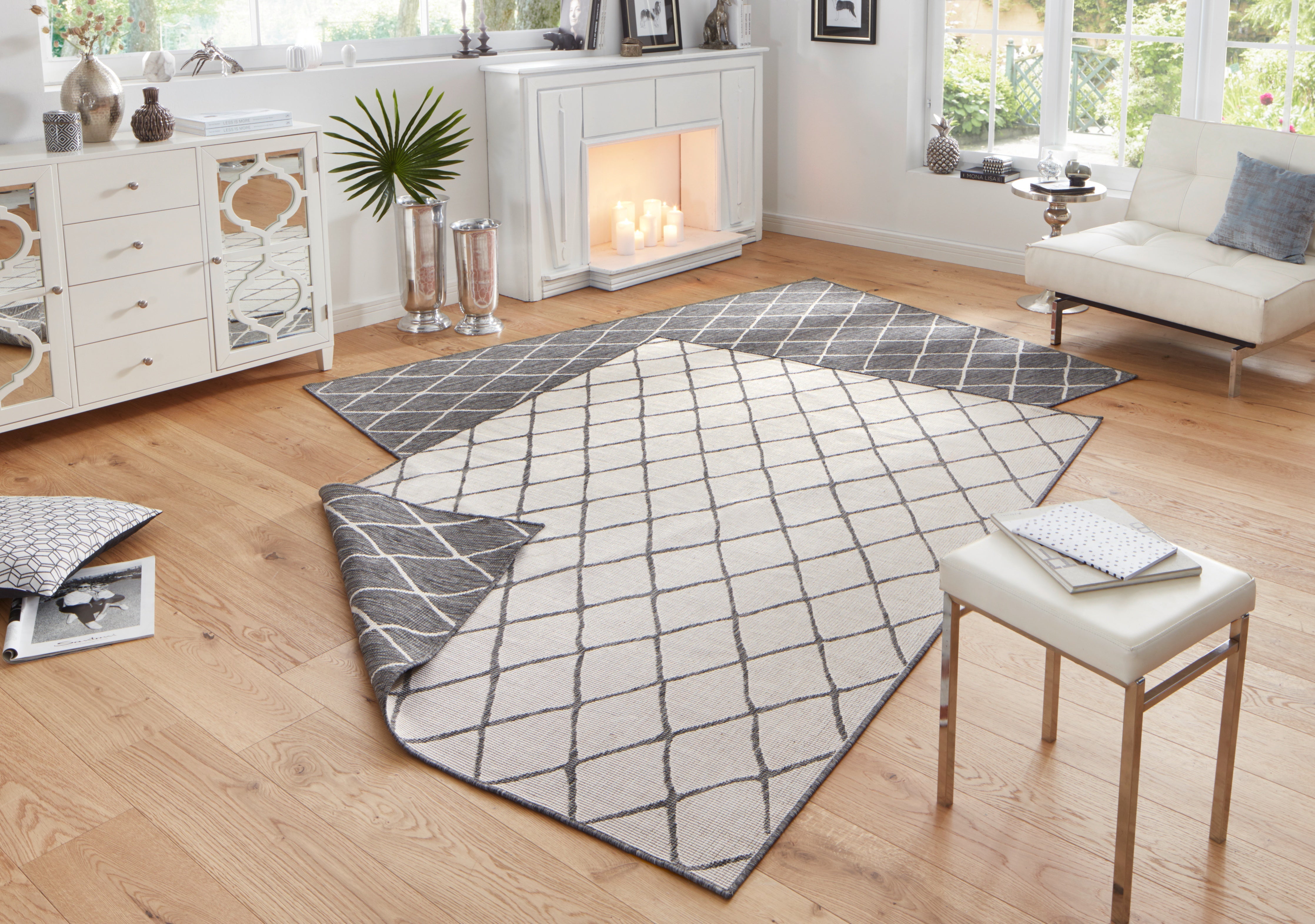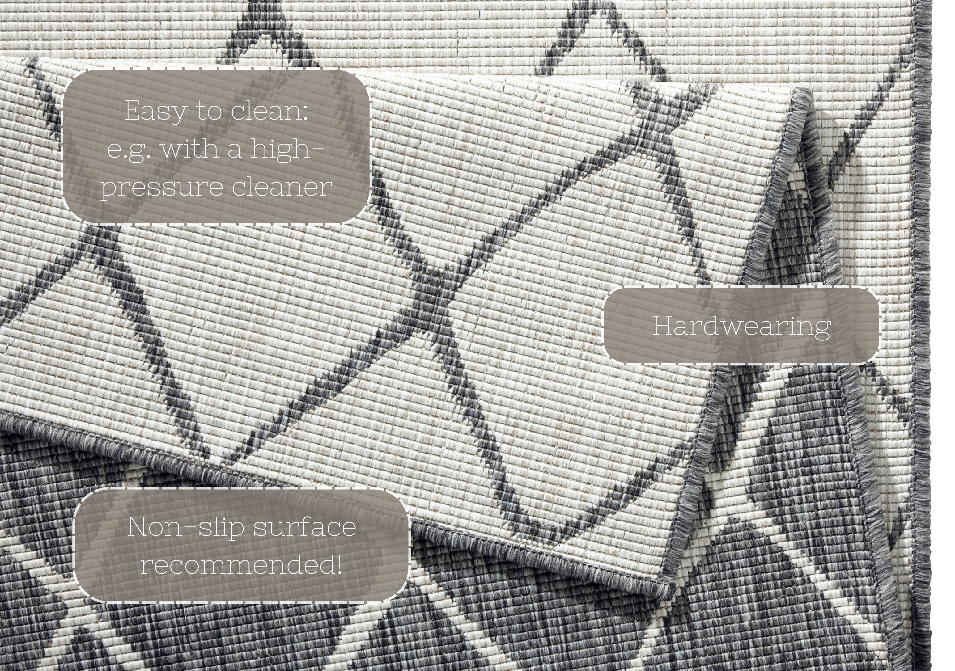 Twin tæppets vendbare design med et moderne geometrisk mønster giver dig mulighed for at variere udtrykket efter behov. Det er nemt at rengøre og passer perfekt til alle gulvtyper, inklusive gulvvarme. Den robuste polypropylen bagside sikrer stabilitet og forhindrer tæppet i at glide. Den lave luvhøjde på 0,5 mm giver en behagelig og fast fornemmelse under fødderne.