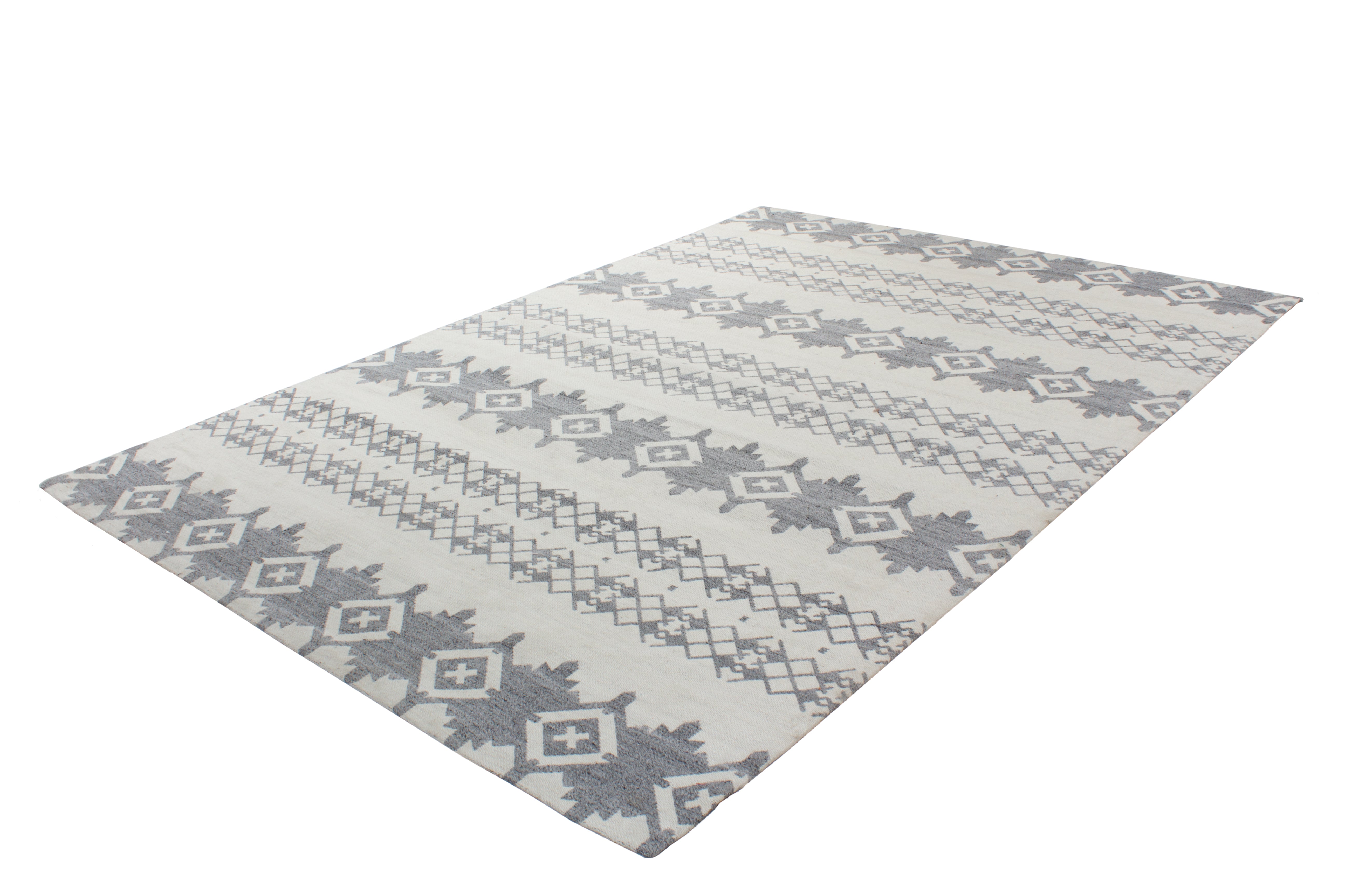 Med sine enkle og lyse farver passer dette tæppe ind i ethvert interiør. Dette fladluvede tæppe ser godt ud på både lyse og mørke gulve. Den bløde blanding af uld og viskose føles meget behagelig under fødderne og lover glæden ved at gå barfodet. Forskellige størrelser, farver og mønstre på dette tæppe giver dig mulighed for at finde den rigtige mulighed for dig. Uanset om det er moderne eller klassisk, rustikt eller tidløst - dette håndlavede tæppe vil passe til din indretning! Placer denne model med bomuldsbagside i din stue eller soveværelse og tilfør et strejf af hygge. De smukke jacquardmønstre på tæpperne er iøjnefaldende i forskellige arrangementer og former, enten individuelt eller i kombination. Mønstre, farver og størrelser kan variere en smule på grund af håndværksprocessen.