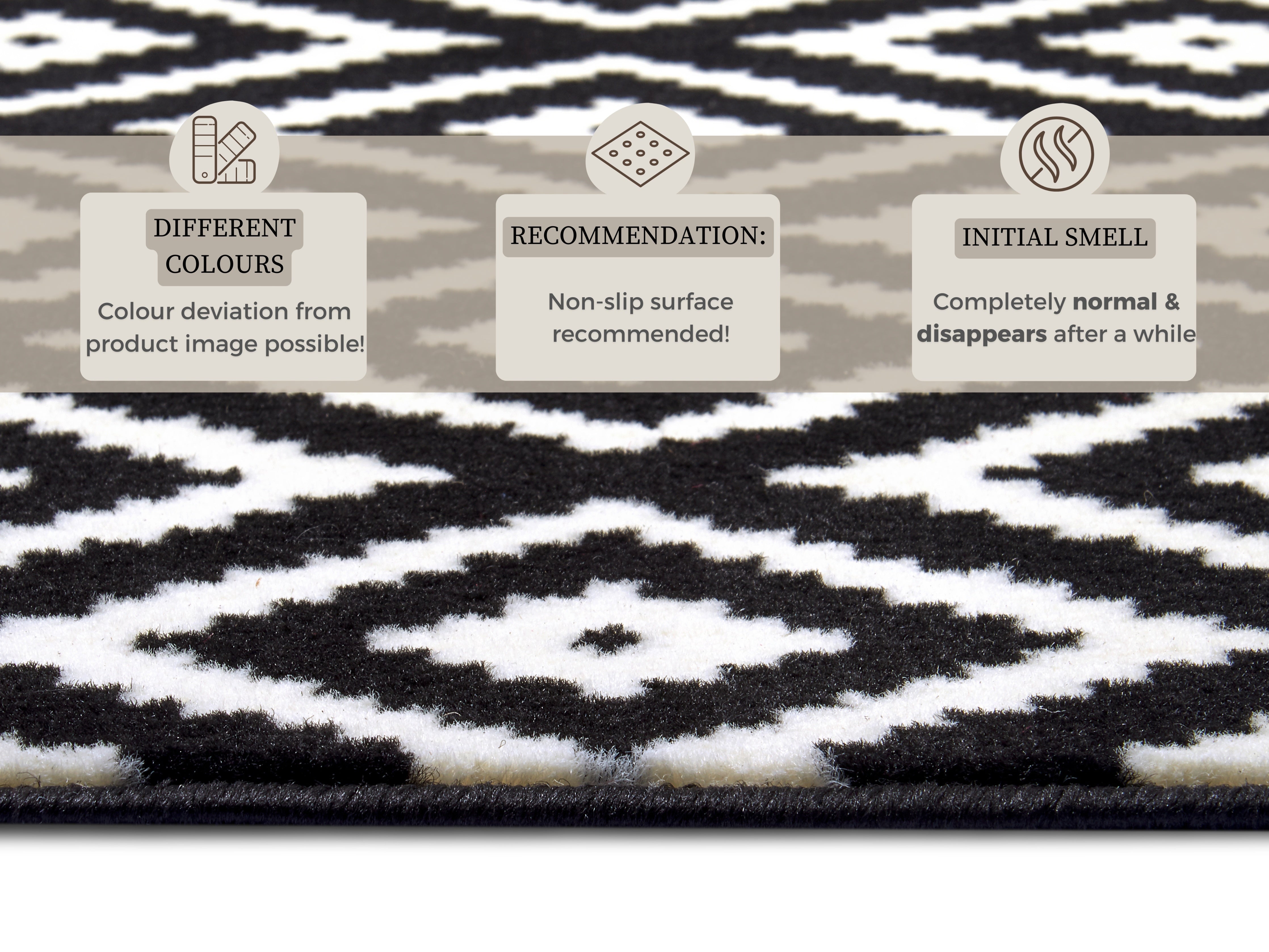 Vær opmærksom på, at nye tæpper kan have en midlertidig lugt ved udpakning, som stammer fra produktionen og indpakningen. Dette er normalt og aftager typisk inden for 1–2 uger efter udpakning, især ved god udluftning. Denne lugt betragtes ikke som en produktfejl.