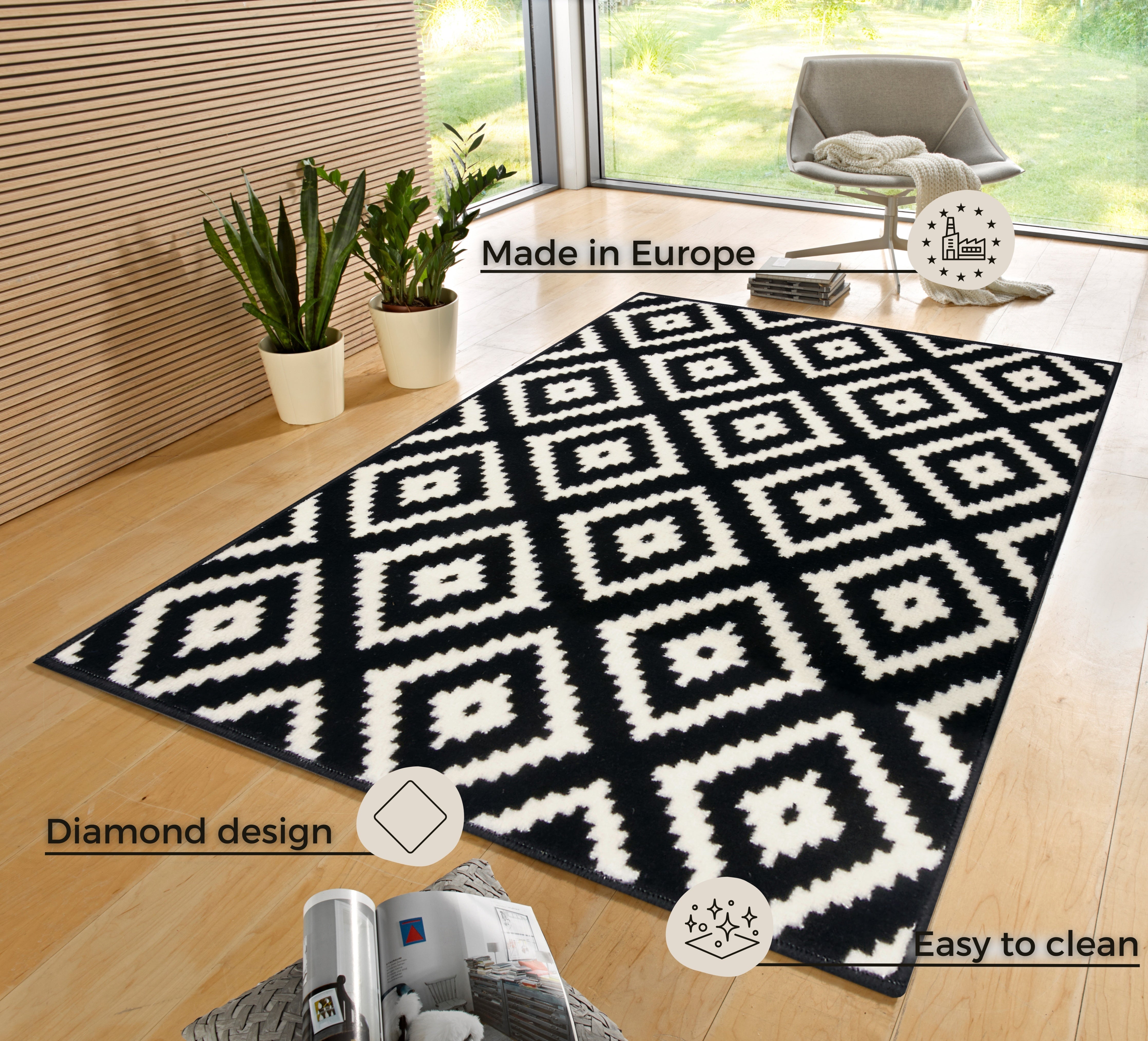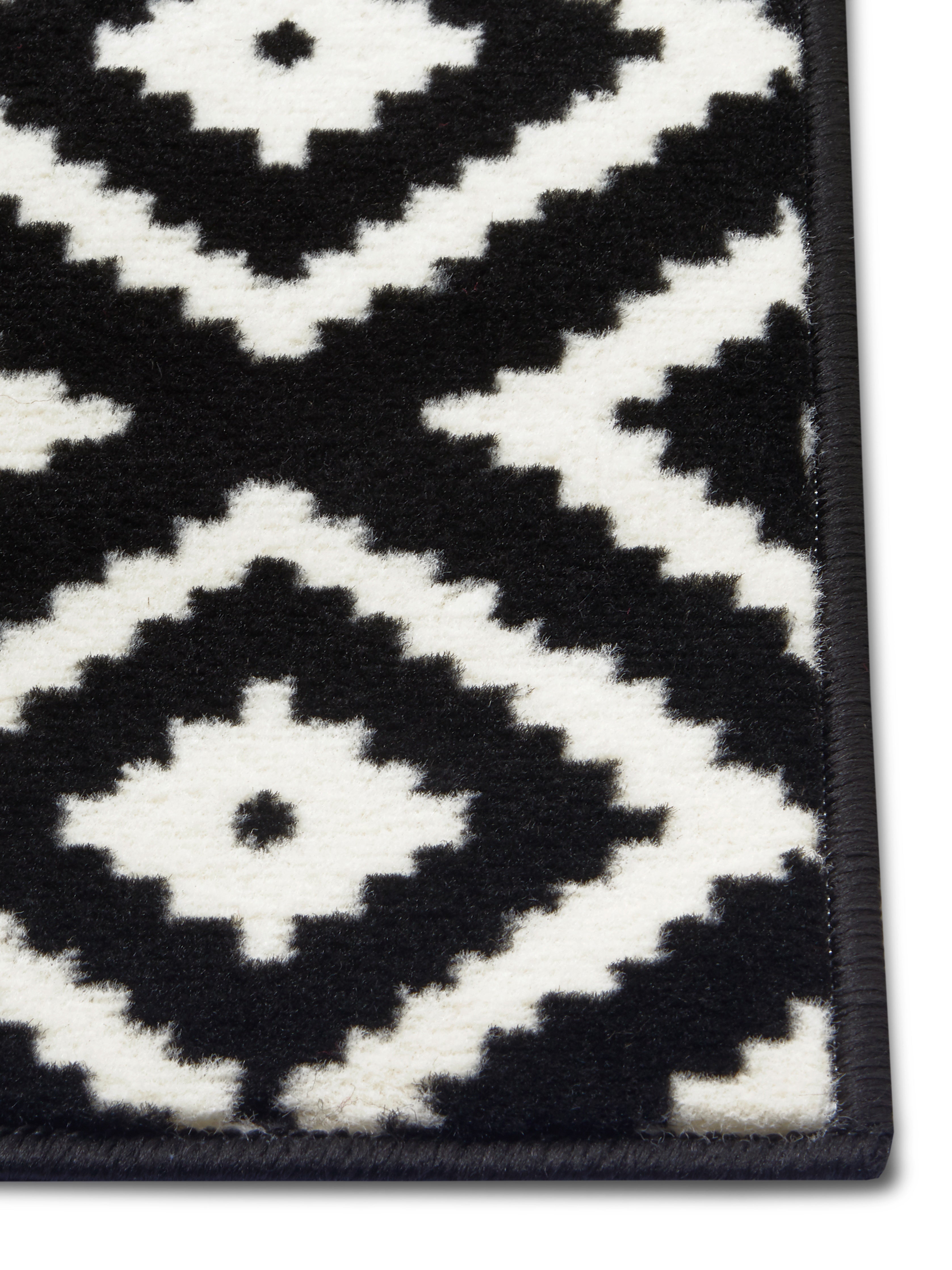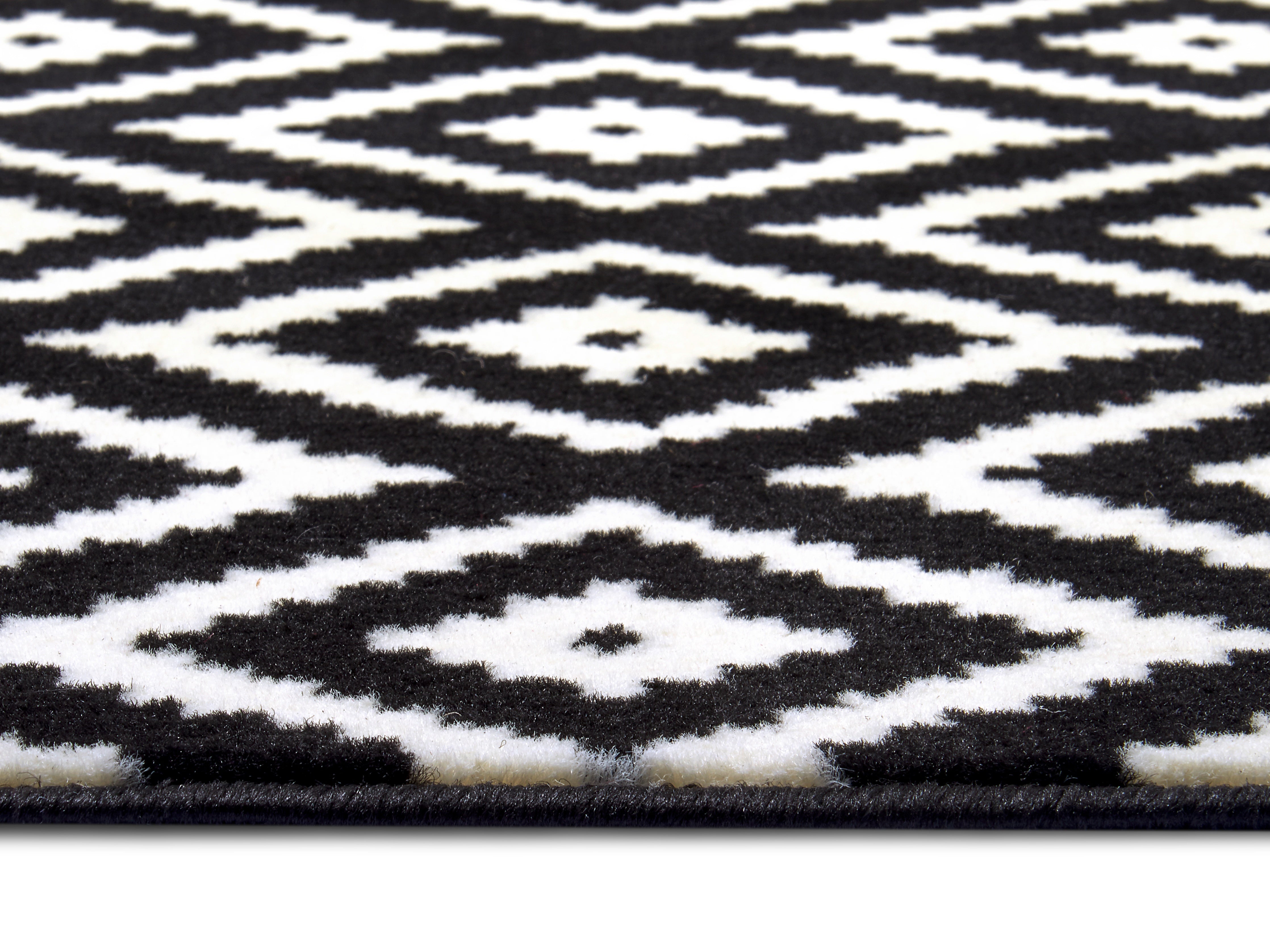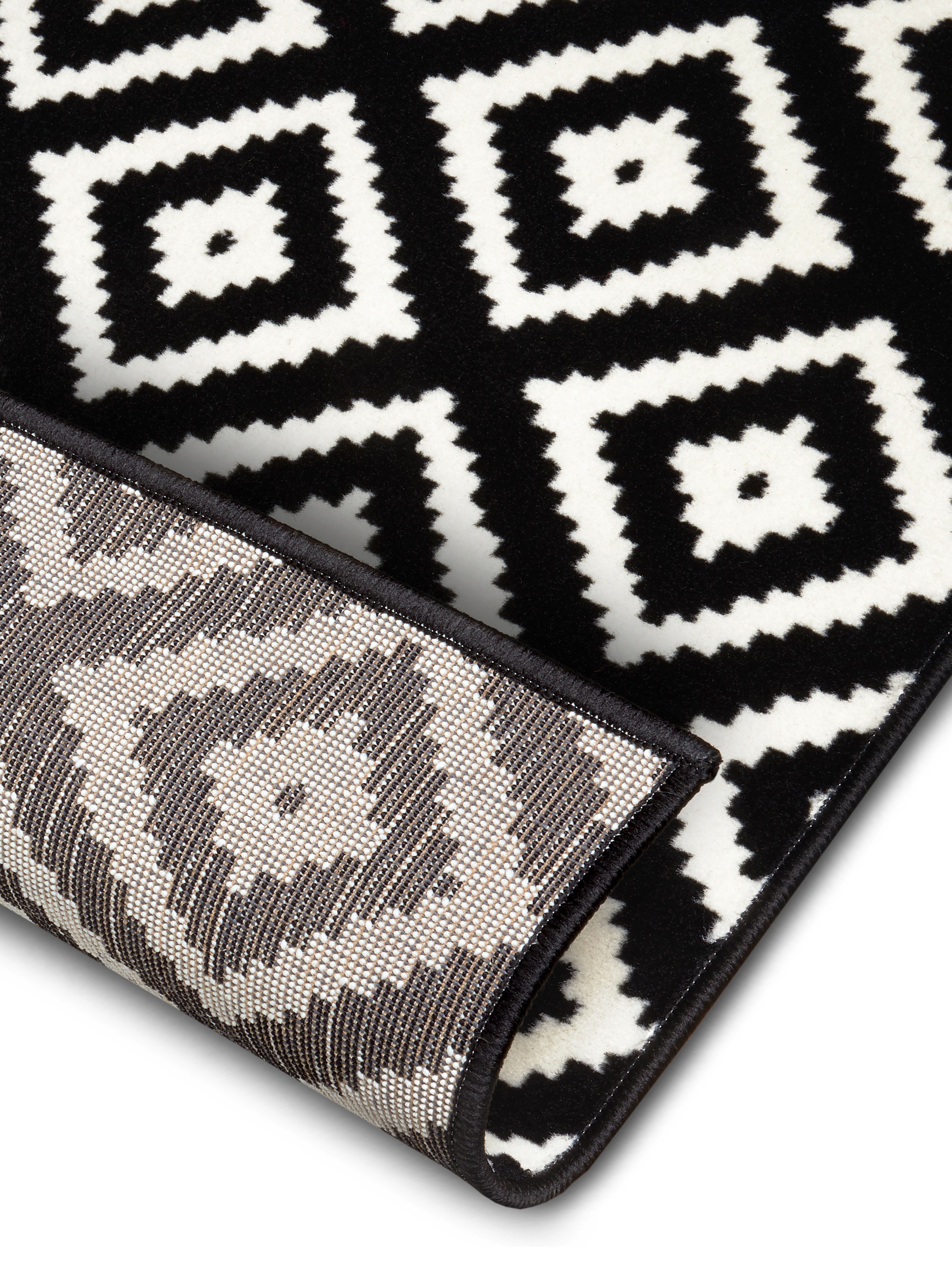Hamla tæppets moderne rombedesign i sort og creme passer perfekt ind i enhver indretning og komplimenterer både trægulve, klinker og gulvvarme. Den robuste jutebagside giver tæppet stabilitet og forhindrer det i at glide, mens den farvematchede overlock kantning på alle sider fuldender det stilrene look og sikrer lang holdbarhed. Tæppets slidstærke polypropylenfibre gør det utroligt nemt at rengøre og vedligeholde, så du kan nyde dets skønhed i mange år.