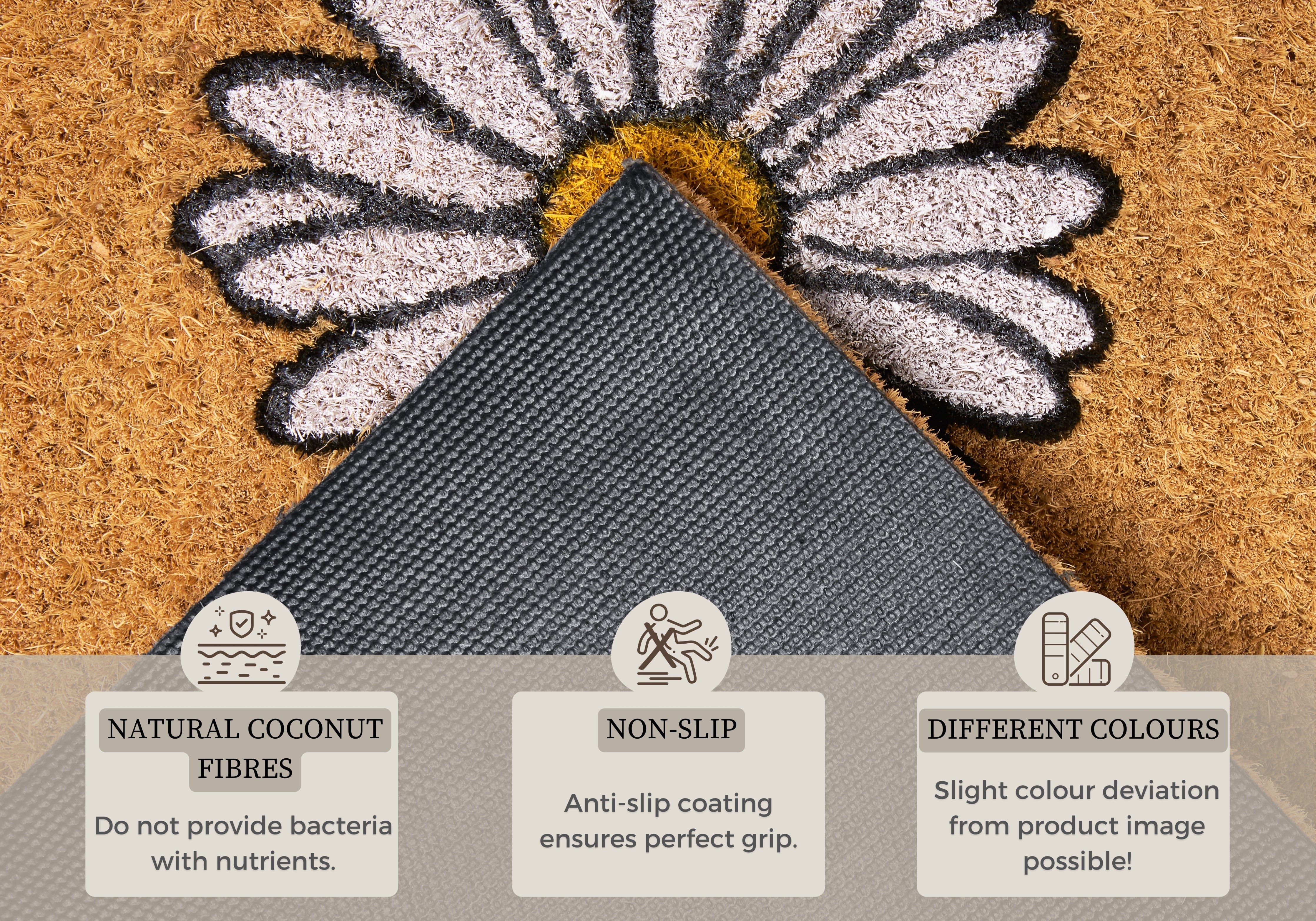 Kokos Måtte er ikke kun smuk, men også utrolig praktisk. Den skridsikre PVC-bagside sørger for, at måtten bliver liggende, hvor den skal, og beskytter samtidig dit gulv mod slid. Kokosfibrene er naturligt resistente over for bakterier, da de ikke giver næring til bakterievækst. Snavs og bakterier forbliver dermed på måtten og transporteres ikke ind i boligen. Måtten er egnet til både indendørs og beskyttet udendørs brug, hvilket gør den til en alsidig løsning til din entré, terrasse eller altan.
