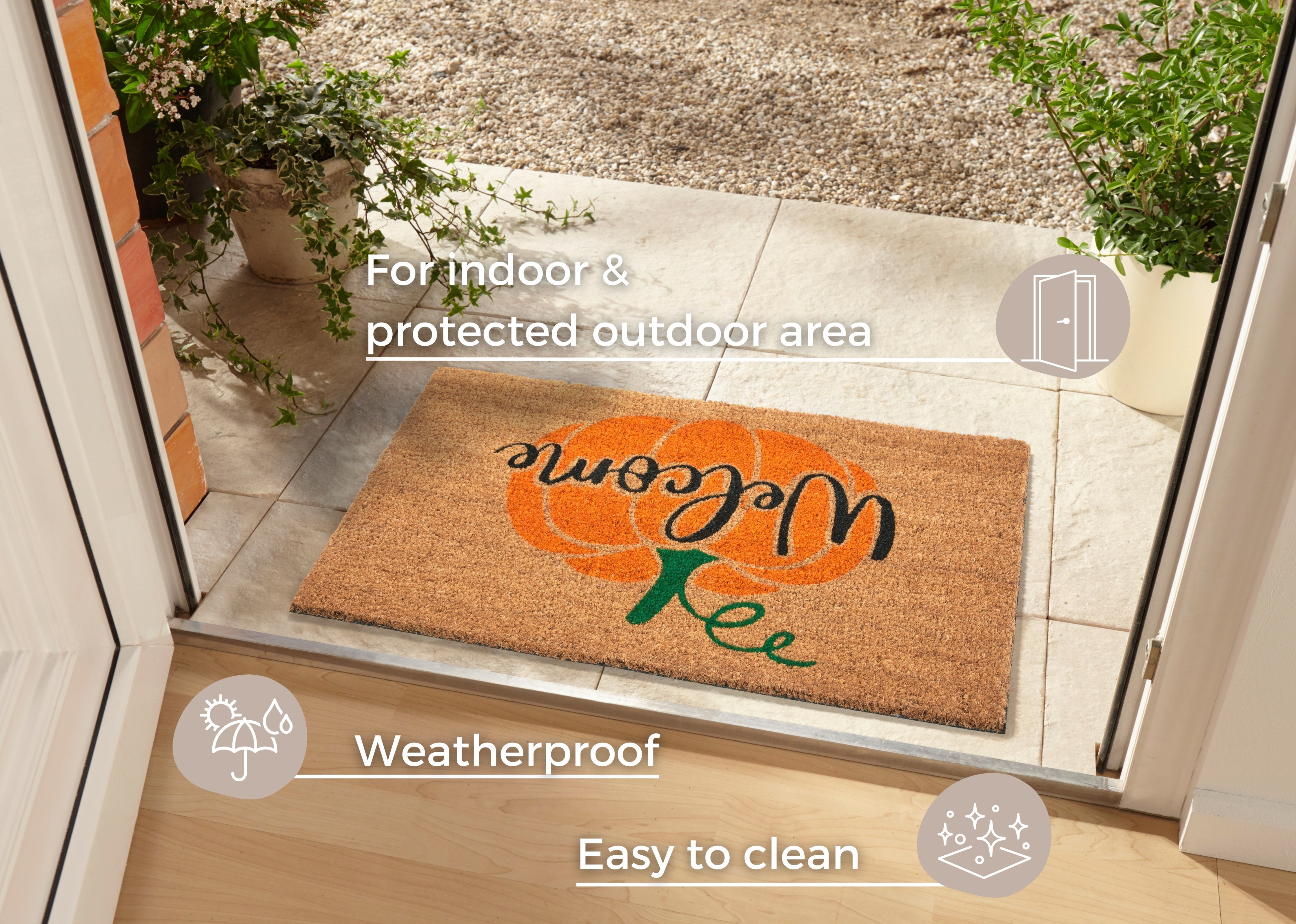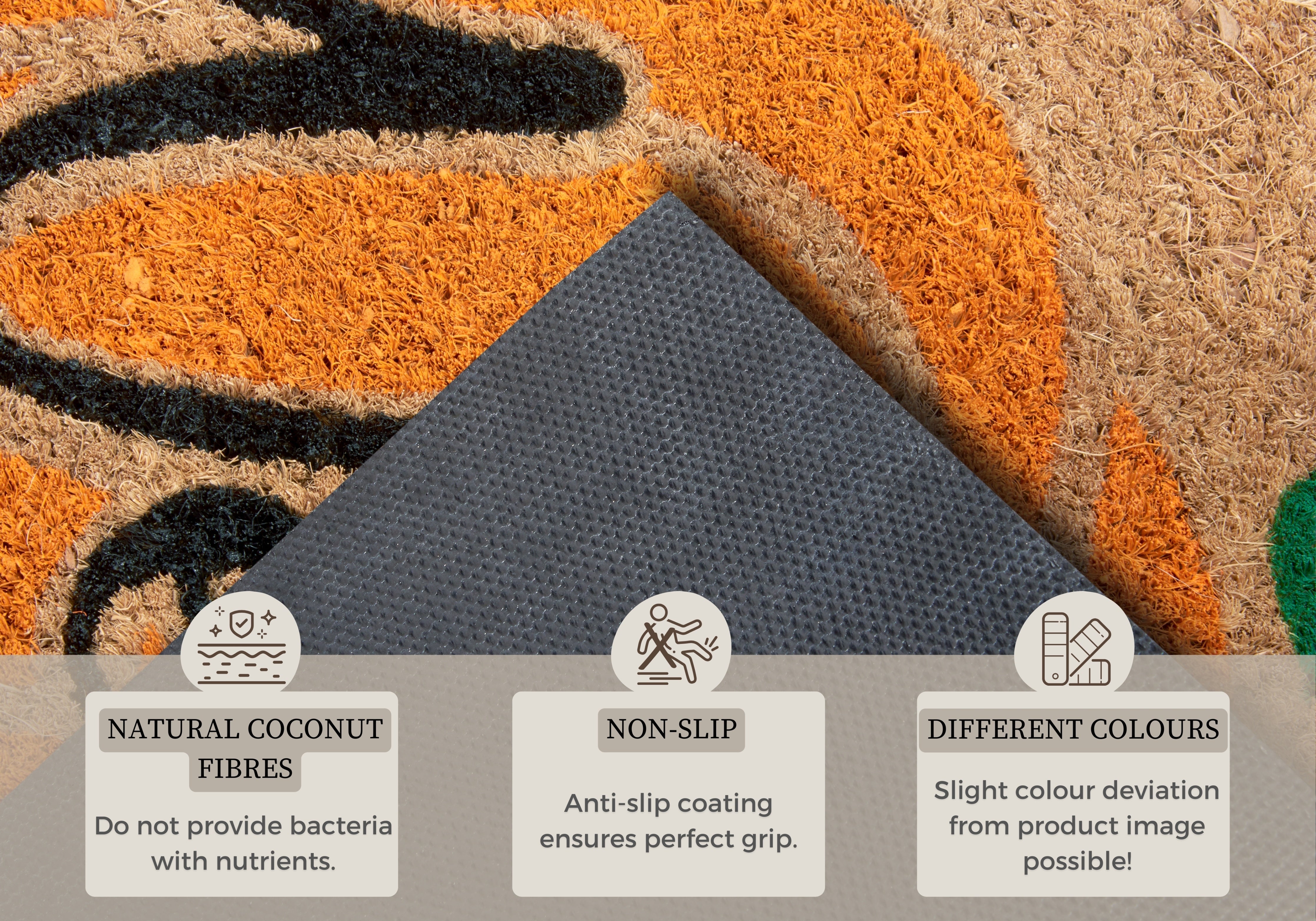 Kokosmåttens naturlige fibre er ikke blot smukke, de er også utroligt funktionelle. Kokosfibrene giver et effektivt underlag til at fange snavs og skidt, så det ikke bliver trukket med ind i huset. Den skridsikre latexbagside (100% latex) holder måtten sikkert på plads og forhindrer uheld. Måttens unikke egenskaber gør, at bakterier ikke trives i kokosfibrene, hvilket bidrager til et renere og mere hygiejnisk hjemmemiljø. Den er velegnet til både indendørs og overdækket udendørs brug.