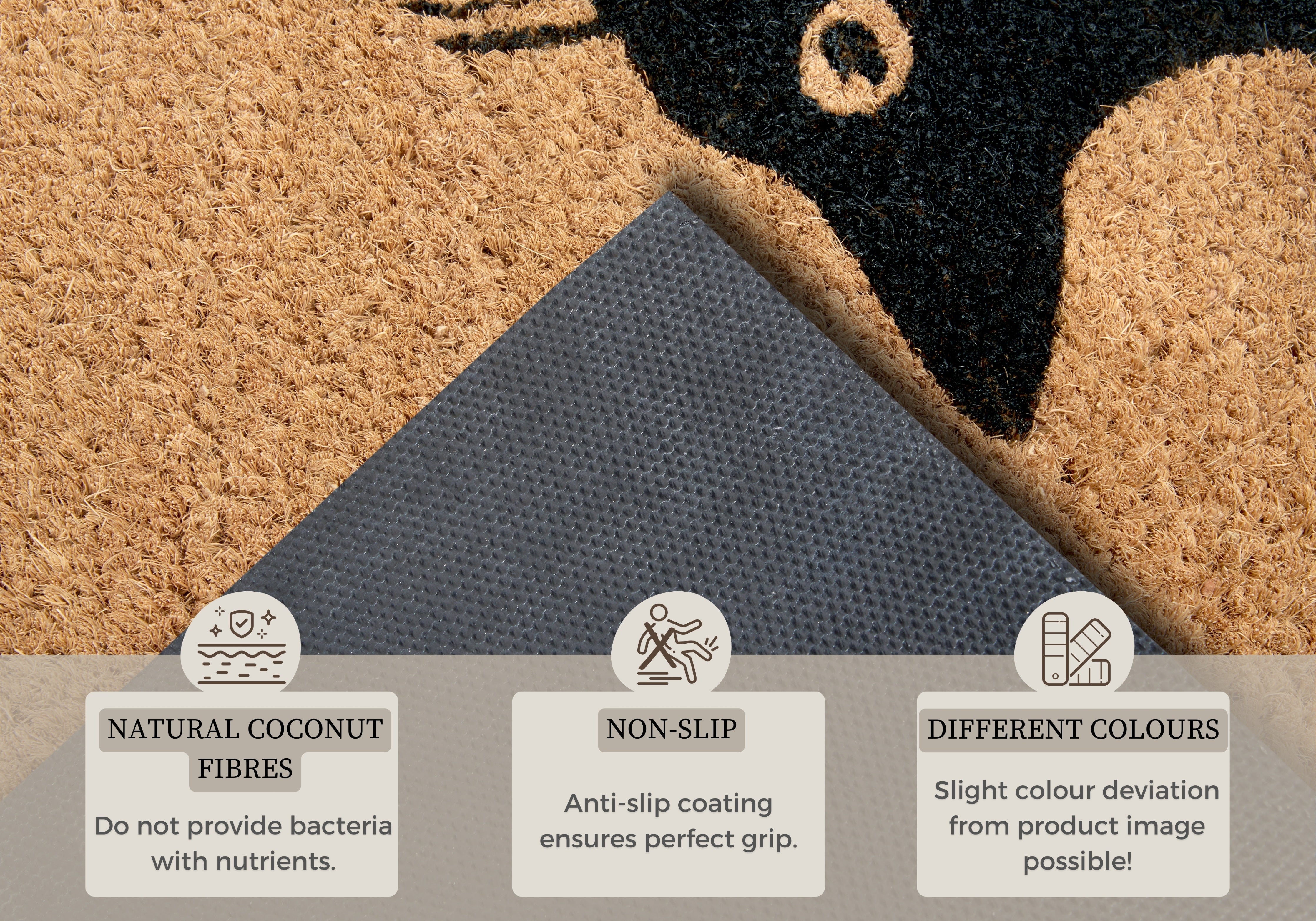 Kokosfibrene er ikke blot æstetisk tiltalende, de er også utroligt praktiske. De naturlige fibre giver måtten en skridsikker overflade, der holder dig trygt på benene, mens den robuste latexbagside (100% latex) sikrer, at måtten ligger stabilt på gulvet. Et andet stort plus er kokosfibrenes antibakterielle egenskaber; de giver ikke næring til bakterier, så både snavs og bakterier forbliver på måtten og transporteres ikke ind i boligen. Måtten er velegnet til både indendørs og beskyttet udendørs brug, hvilket gør den til en alsidig løsning til ethvert hjem.