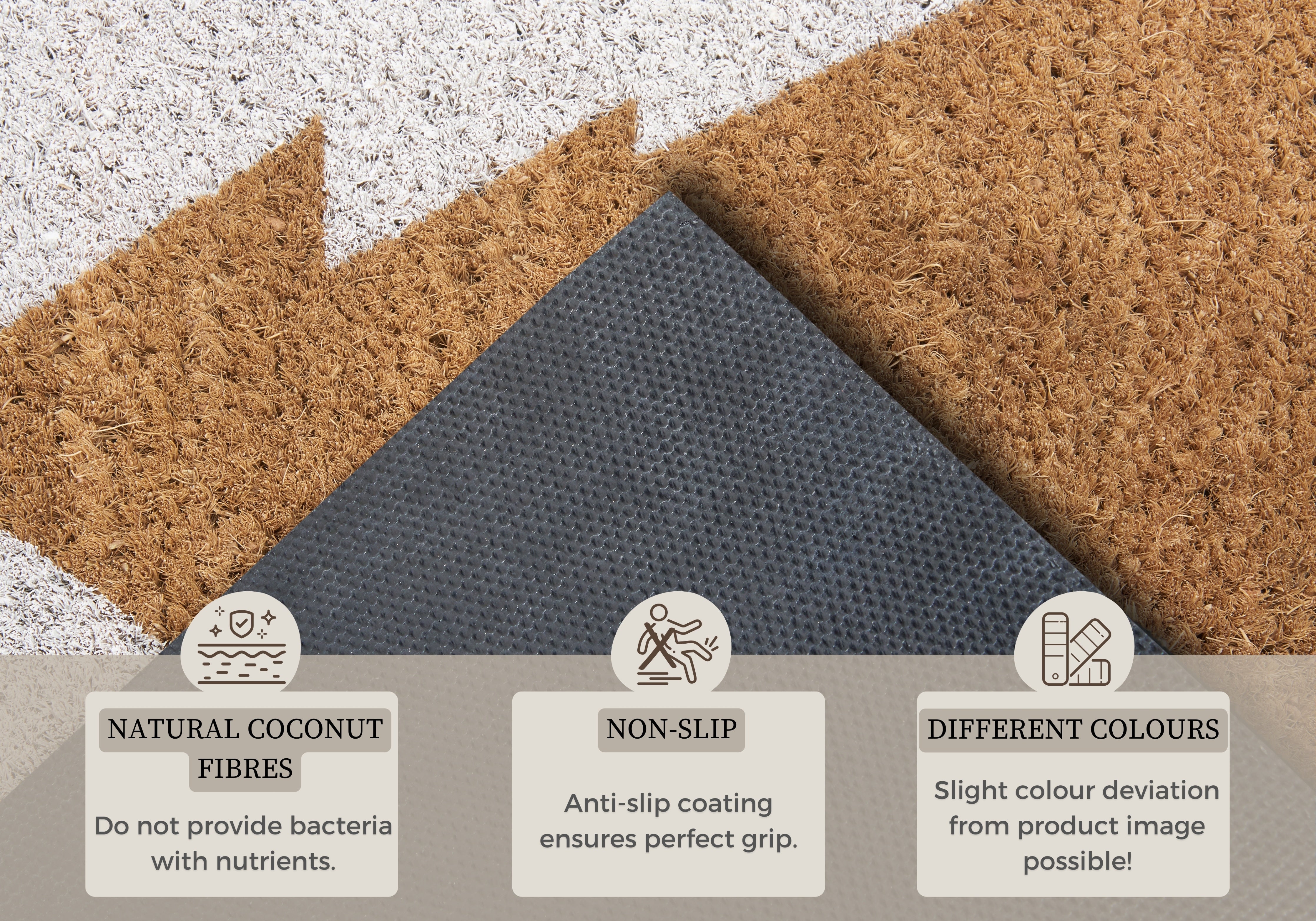 Kokosfibrene er ikke blot smukke, men også utroligt praktiske. De giver måtten en naturlig robusthed og er samtidig hygiejniske, da de ikke giver næring til bakterier. Snavs og bakterier forbliver på måtten og transporteres ikke ind i boligen. Måtten er skridsikker takket være bagsiden af 100% latex, hvilket giver ekstra sikkerhed og tryghed. Den er velegnet til både indendørs og beskyttet udendørs brug, så du kan nyde dens funktionalitet og æstetik uanset placering.
