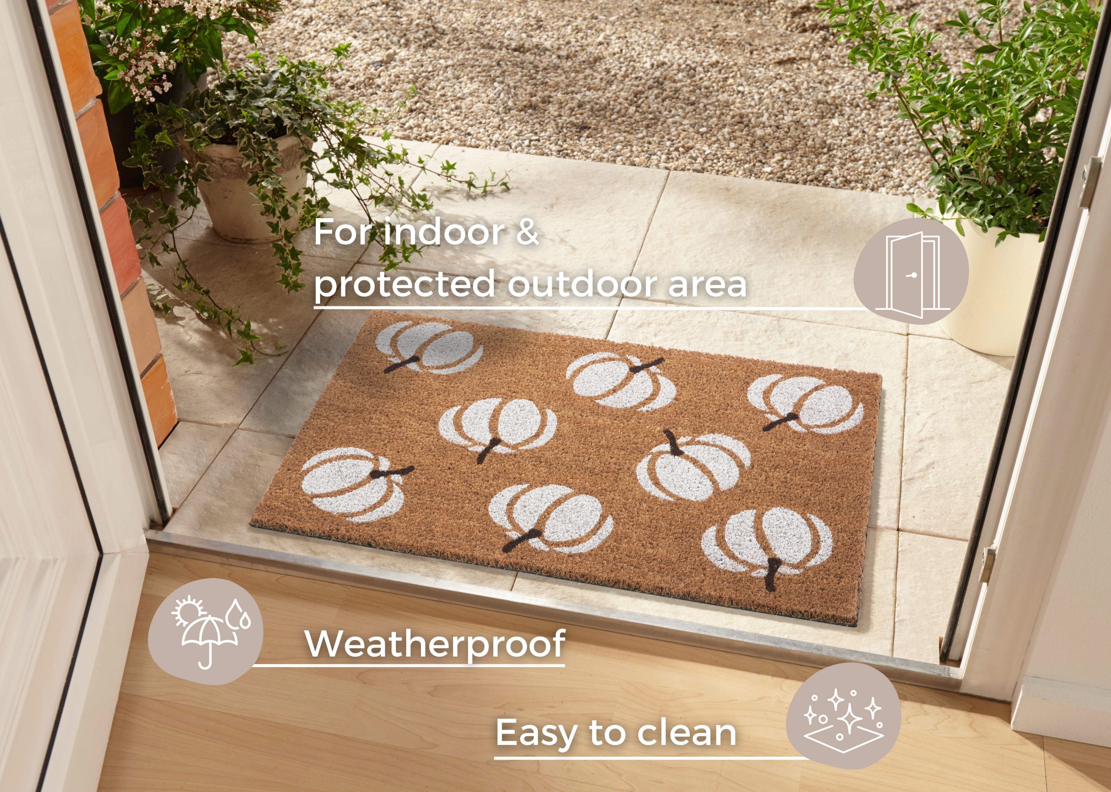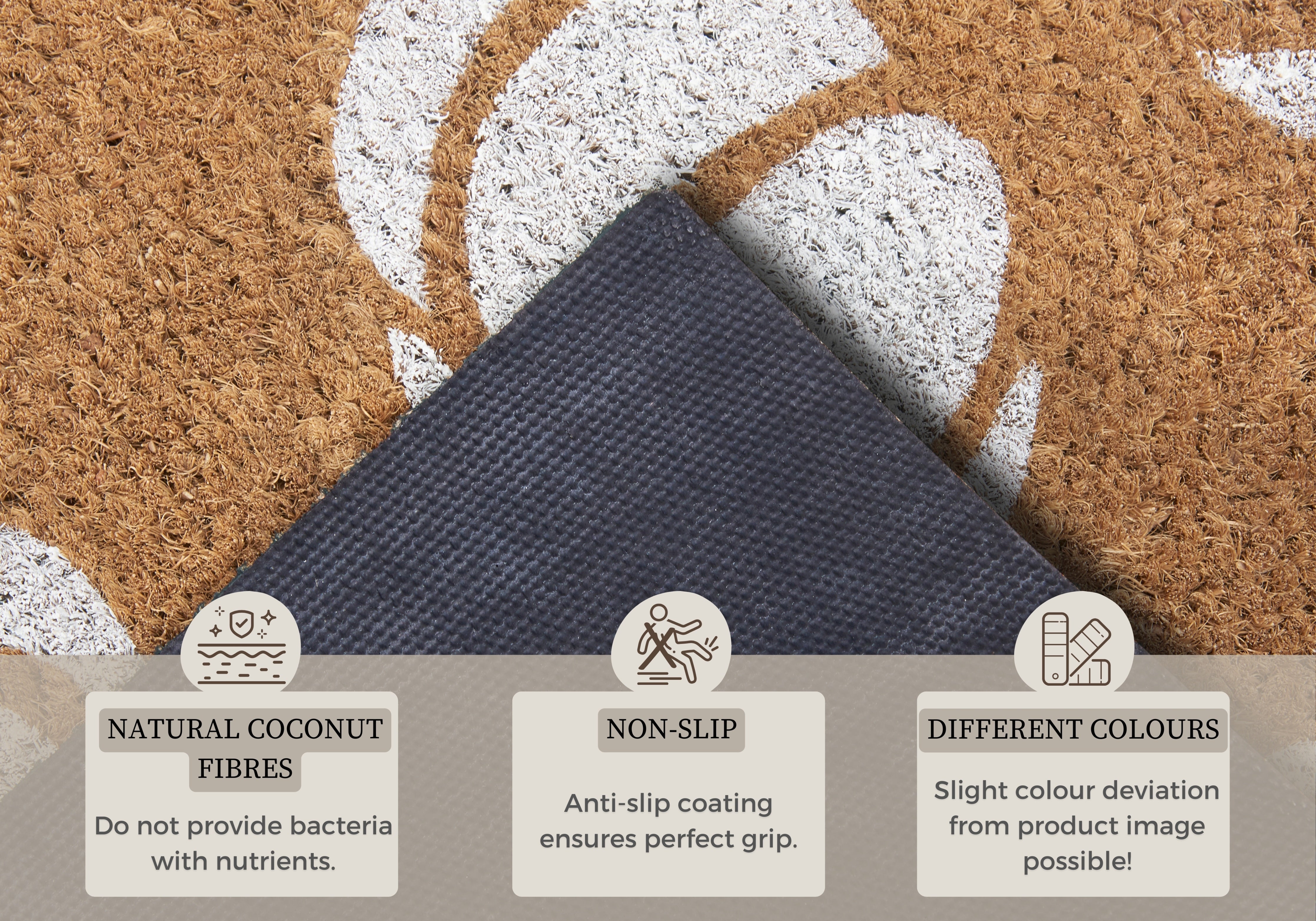 Kokosmåttens naturlige fibre er ikke blot smukke, de er også utroligt praktiske. Kokosfibrene giver et naturligt forsvar mod bakterier, da de ikke tilbyder næring til bakterievækst. Snavs og bakterier forbliver på måtten og transporteres ikke ind i boligen. Måtten er skridsikker takket være bagsiden af 100% latex, hvilket sikrer et sikkert underlag. Den er velegnet til både indendørs og beskyttet udendørs brug, og den er nem at rengøre.