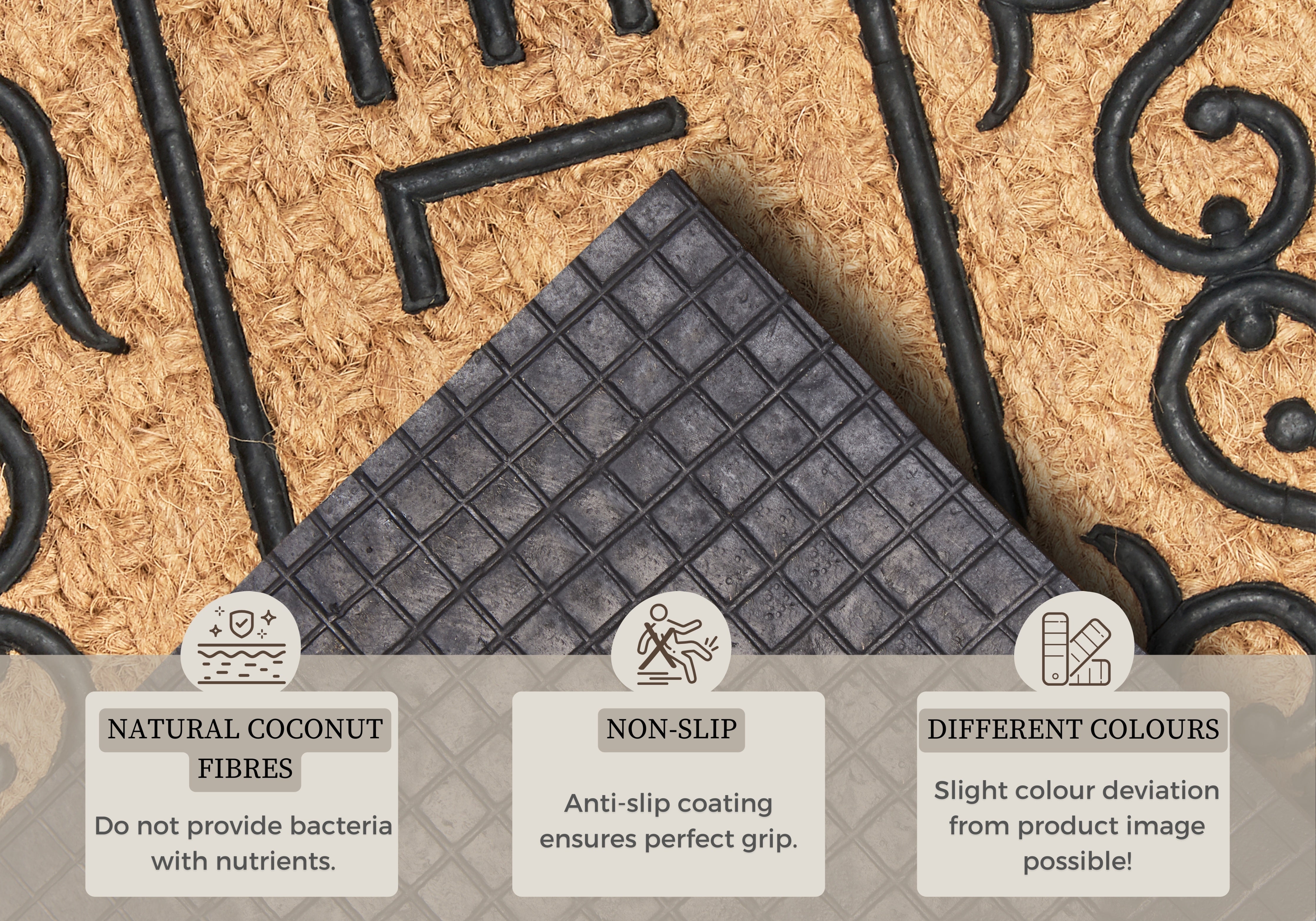 Kokosmåttens naturlige kokosfibre er ikke blot smukke, men også utroligt praktiske. De giver et fast og skridsikkert underlag takket være bagsiden af 100% latex. Fiberstrukturen forhindrer effektivt bakterier i at trives, så snavs og bakterier bliver på måtten og ikke transporteres ind i din bolig. Måtten er velegnet til både indendørs og beskyttet udendørs brug, hvilket gør den til en alsidig løsning til din entré, terrasse eller altan.