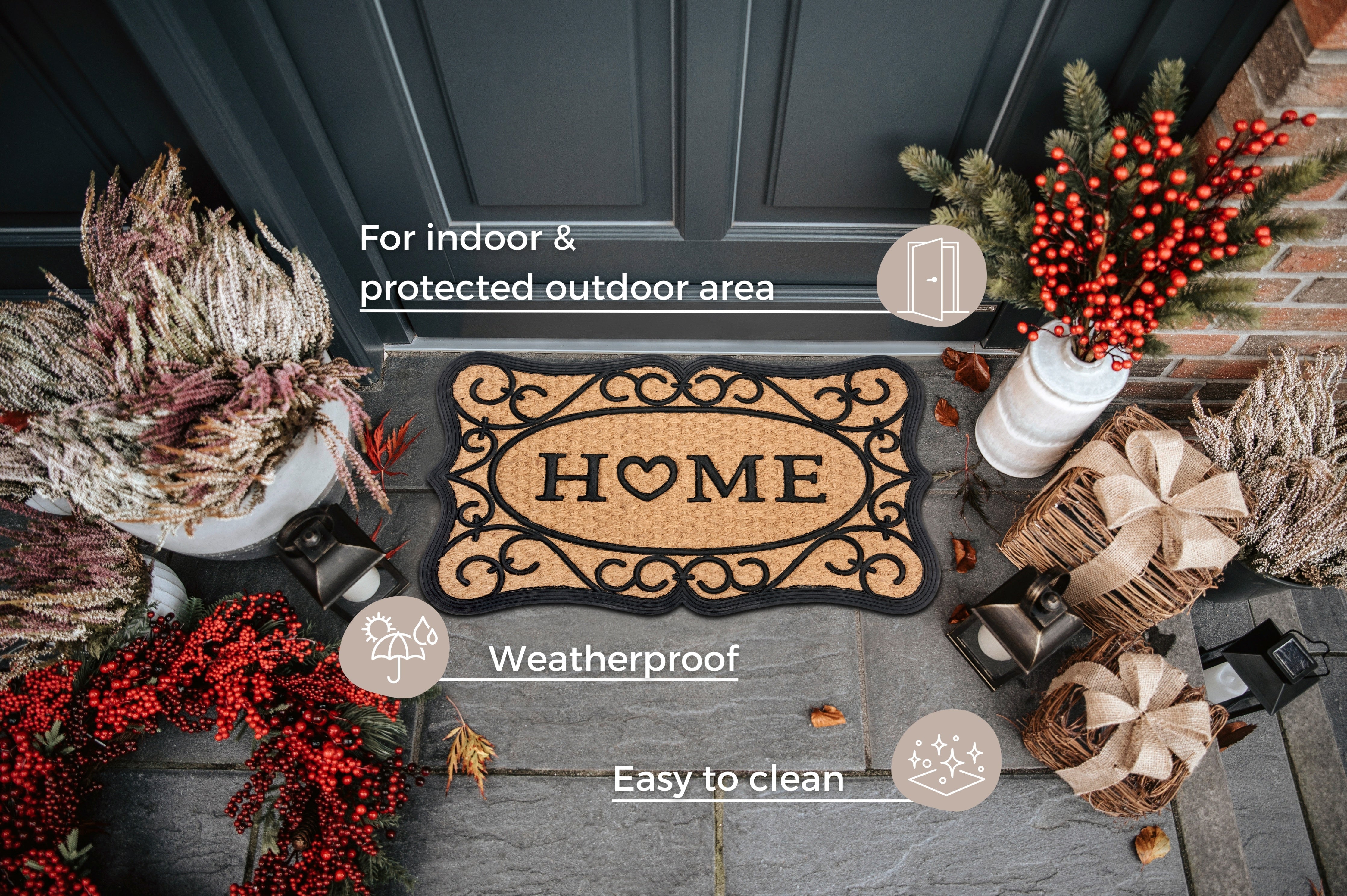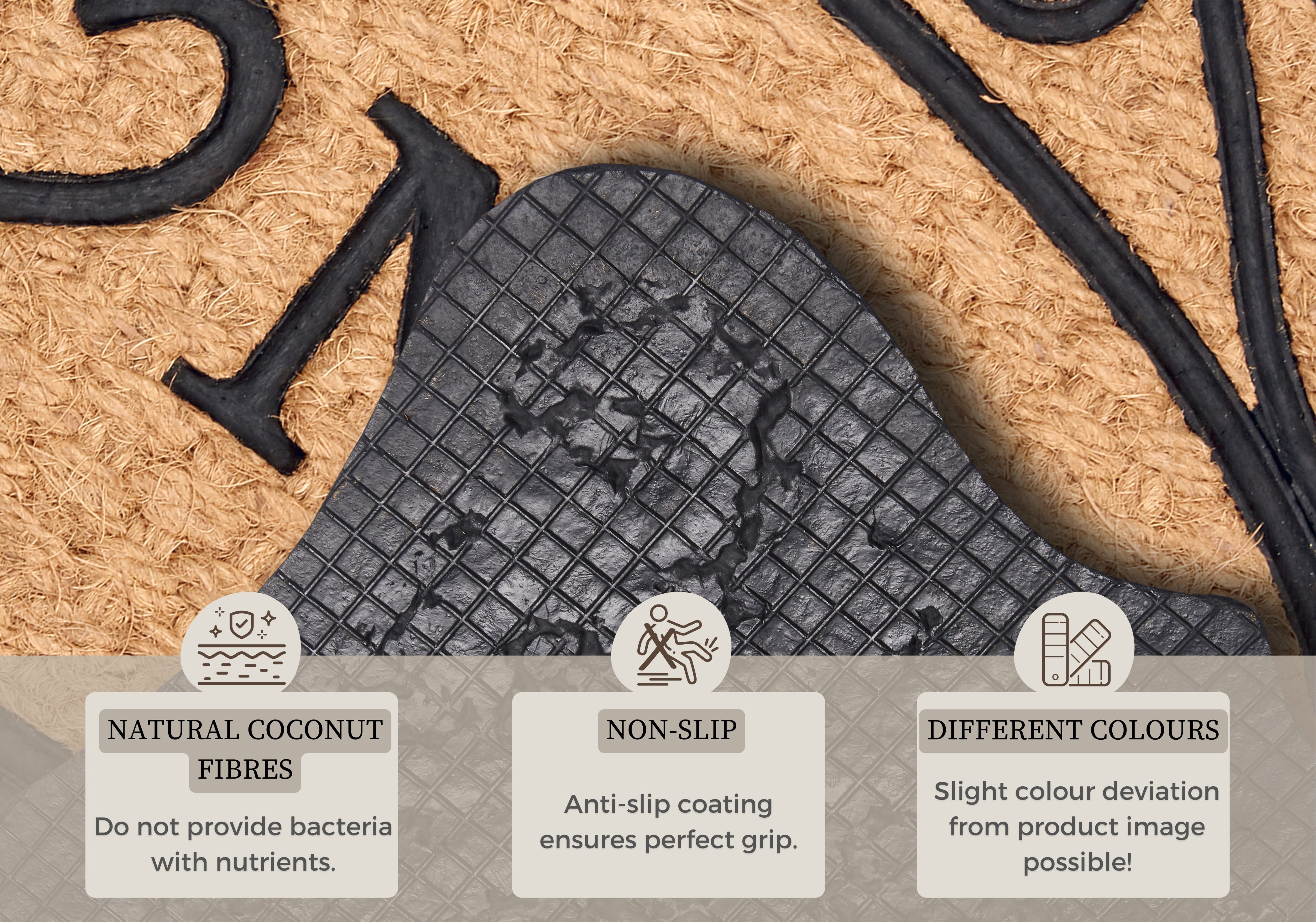 Mix Mats Kokos Måtte er designet til både indendørs og overdækket udendørs brug. Den skridsikre bagside i 100% gummi holder måtten sikkert på plads og forhindrer uheld. Kokosfibrene er naturligt bakteriehæmmende, da de ikke giver næring til bakterier. Snavs og bakterier bliver effektivt fanget i måtten og transporteres ikke ind i dit hjem, hvilket bidrager til et renere og sundere indeklima. Den slidstærke konstruktion sikrer lang holdbarhed, så du kan nyde din Kokos Måtte i mange år.