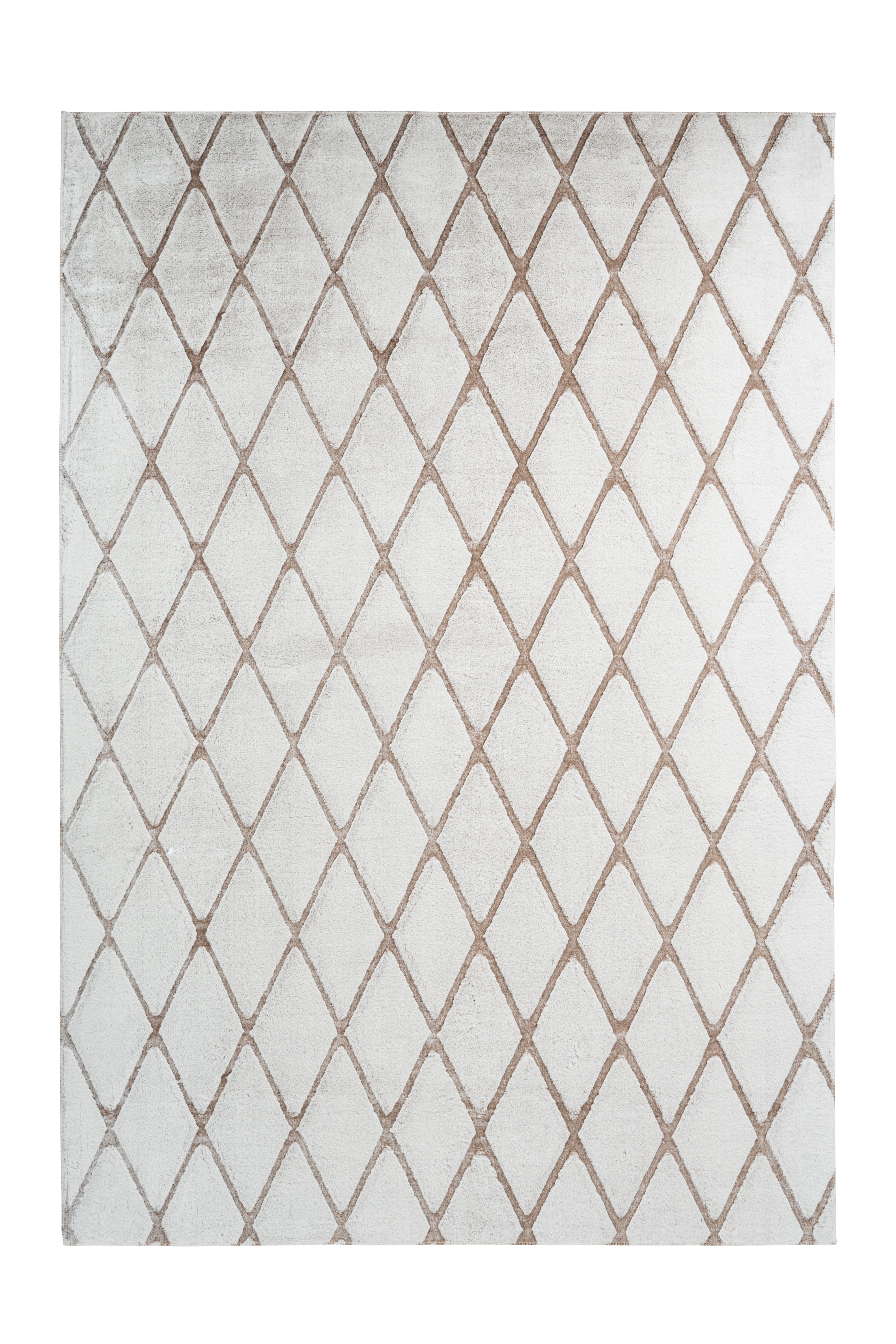 Tæppets udseende er kendetegnet ved dets attraktive prægede mønster, der skaber en slående 3D-effekt. Mønsterets geometriske former giver også tæppet et stilfuldt retro-look. Den ellers enkle, monokrome luv ser godt ud i ethvert opholdsrum og kan takket være sin underspillede elegance kombineres med enhver indretning. Den hyggelige overflade skaber en hyggelig atmosfære i rummet. Tæppet kan også nemt installeres i rum med gulvvarme. En bomuldsbagside og dekorative syninger hele vejen rundt forstærker luven. Samtidig forhindrer overlock-syningen tæppet i at flosse. Tæppets faktiske farve og mønster kan variere fra de viste billeder. Forskellige farvenuancer kan forekomme på grund af forskellig belysning og forskellige luvretninger.