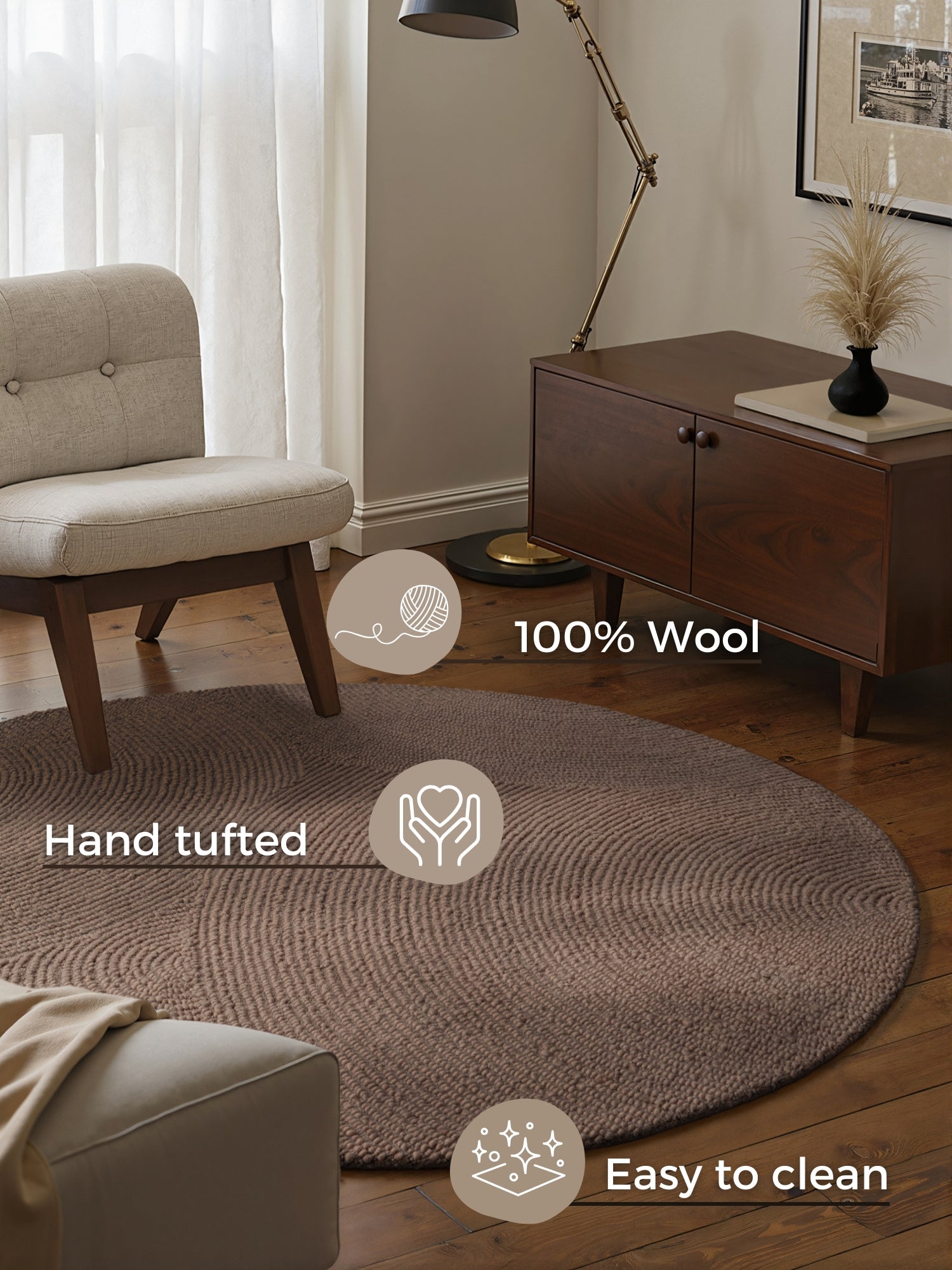 Forkær dig selv med den tidløse elegance fra Hanse Home Eleni-tæppet i en smuk taupe farve. Dette runde tæppe, fremstillet af 100% uld, tilføjer en naturlig varme og sofistikeret stil til ethvert rum. Den geometriske design giver et kunstnerisk touch, der nemt integreres i både moderne og klassiske indretninger.