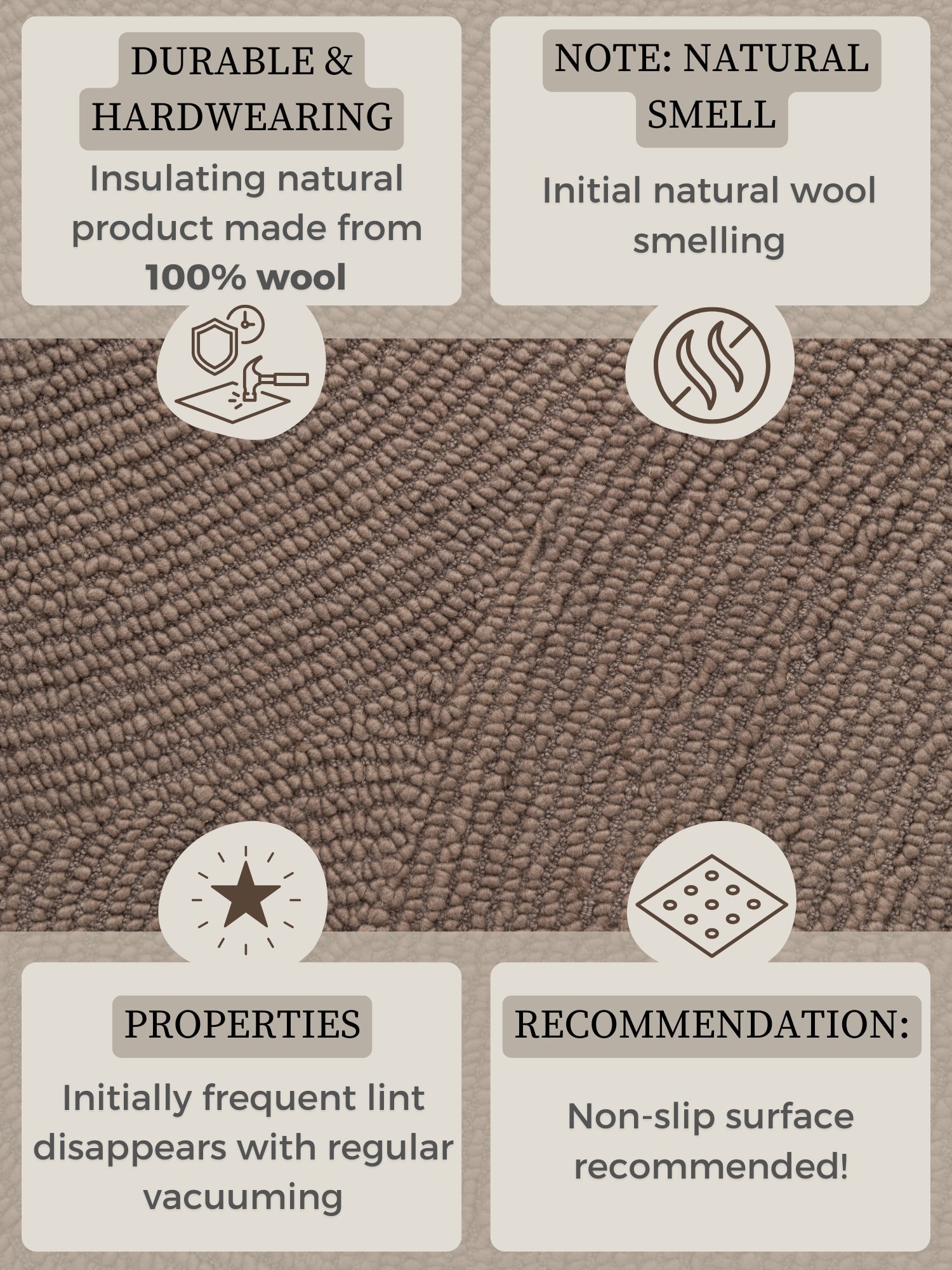 Eleni-tæppet er håndtuftet, hvilket vidner om et højt kvalitetshåndværk. Den robuste 100% uld sikrer en slidstærk overflade, der kan modstå daglig brug. Bagsiden i 100% genanvendt bomuld tilføjer et bæredygtigt element og giver tæppet en god stabilitet. Eleni er desuden velegnet til gulvvarme, så du kan nyde den bløde uld selv i de koldere måneder. Den naturlige uldfiber gør tæppet robust og nemt at passe på.