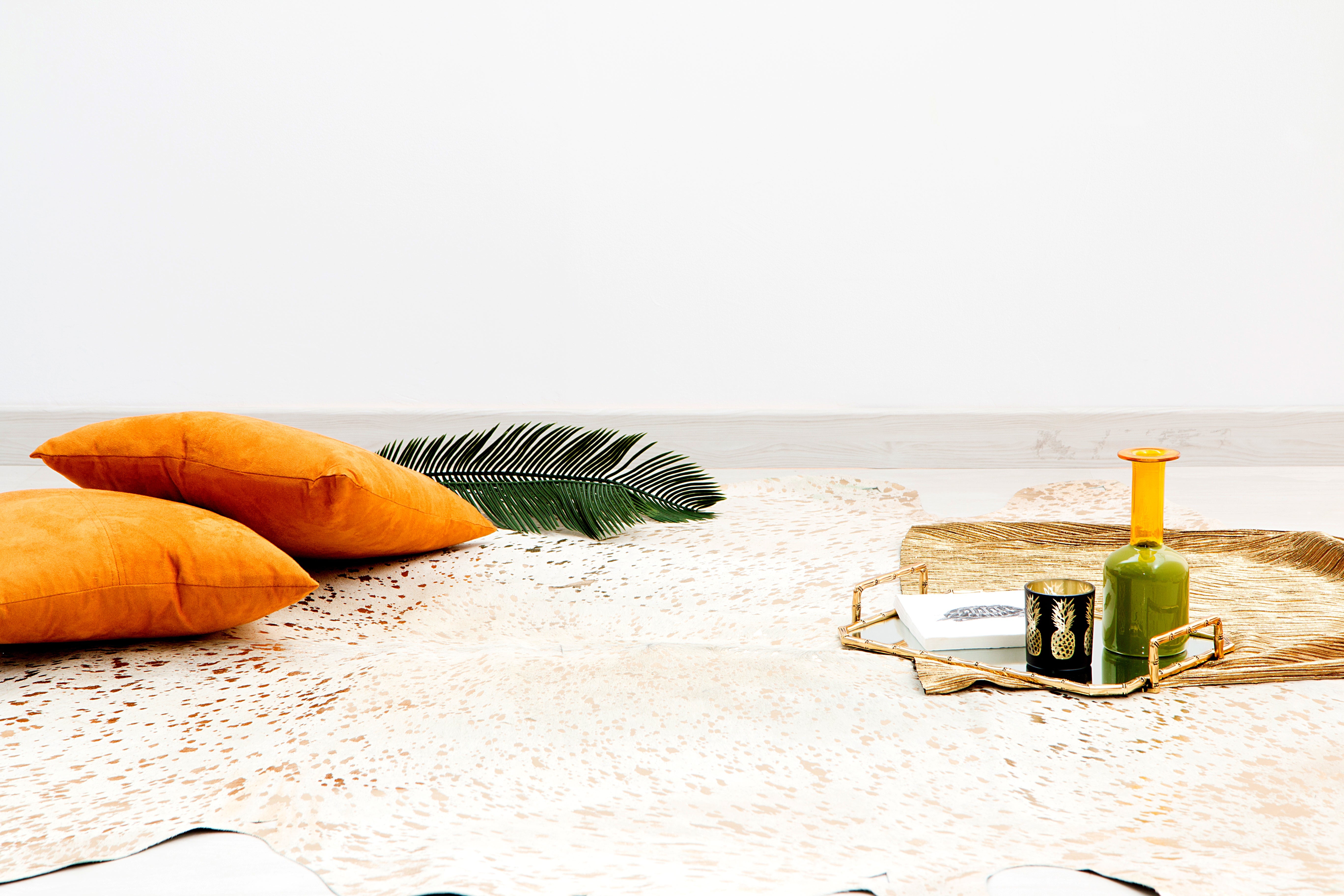 Dette naturlige tæppe er lavet af ægte kohud og får sin karakteristiske karakter fra dets moderne farve, elegante metalliske accenter og naturlige konturer. Stilfulde udskæringer, der varierer i form og størrelse, giver tæppet et unikt udseende. Enkle, minimalistiske rum kan forbedres særligt godt med dette tæppe. Den lette vægt af den flade luv gør det muligt at bruge dette tæppe ikke kun som gulvbelægning, men også som vægophæng eller siddehynde. Dette giver dig mulighed for at indrette dit hjem efter dine egne ideer og fleksibelt variere brugen af tæppet. Læderet passer særligt godt sammen med andre naturlige materialer såsom træ eller rotting. Hyggefaktoren forstærkes ved at kombinere det med smukke puder eller siddehynder lavet af naturlige materialer, hvilket skaber en behagelig atmosfære i hele rummet. Du vil modtage et unikt stykke, der på grund af det naturlige materiale kan variere med op til 30% i tekstur, struktur, form og farve. Det naturlige skind er farvet og kan fælde hår og bløde lidt ud over tid og ved kraftig brug. Metallfolien kan også skalle af under visse omstændigheder. Dette skyldes produktets naturlige natur og hudens tekstur og er ikke en fabrikationsfejl.
