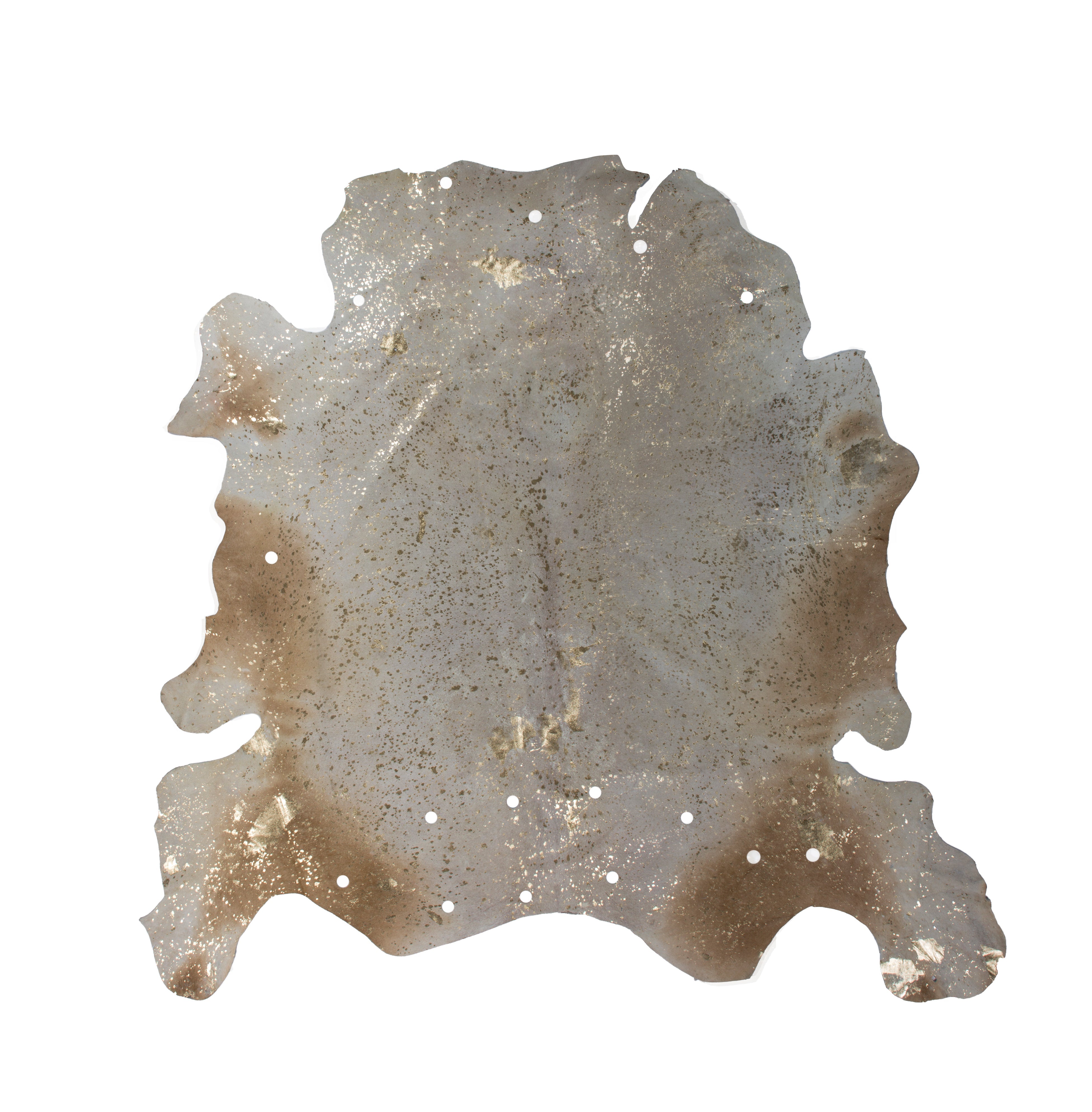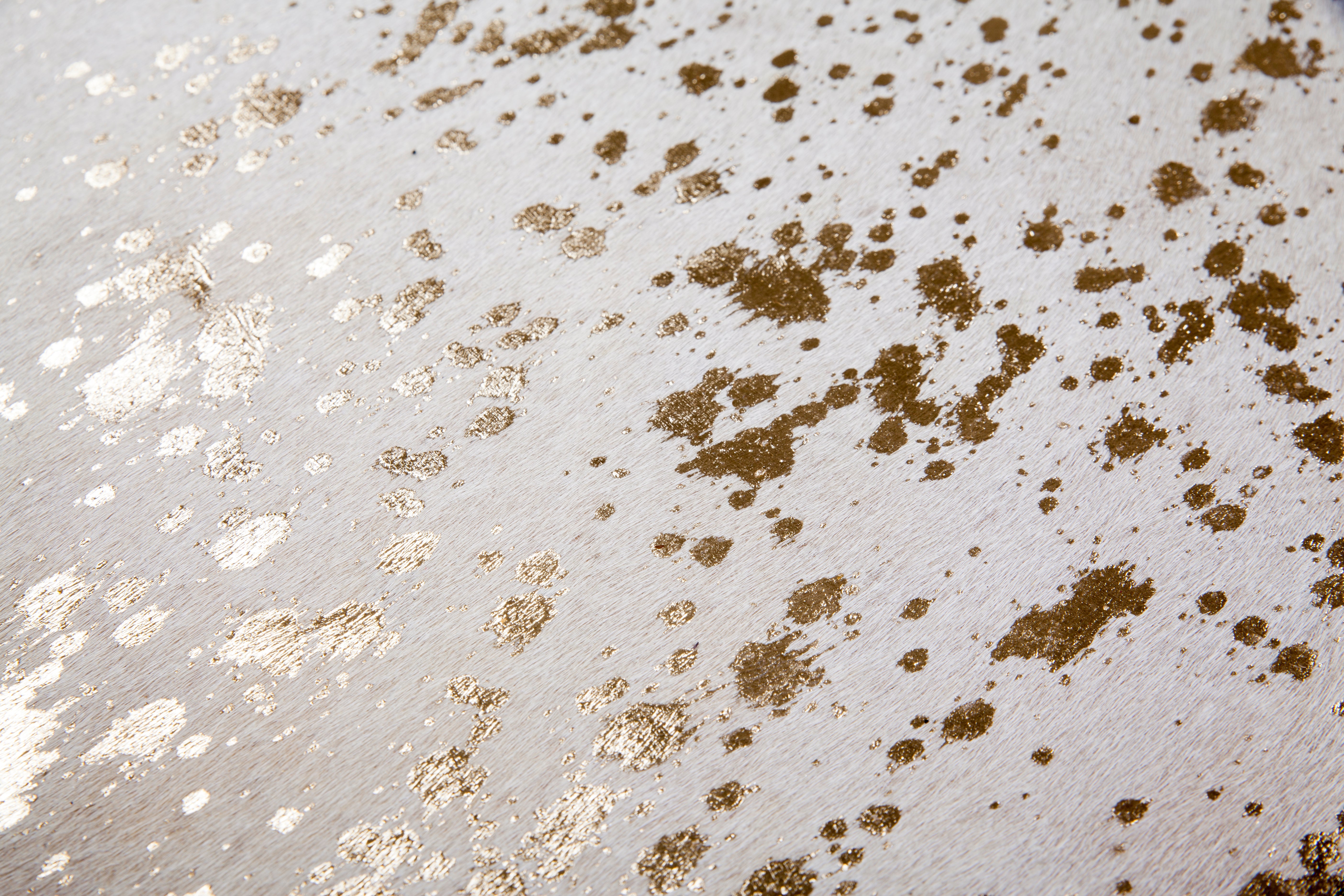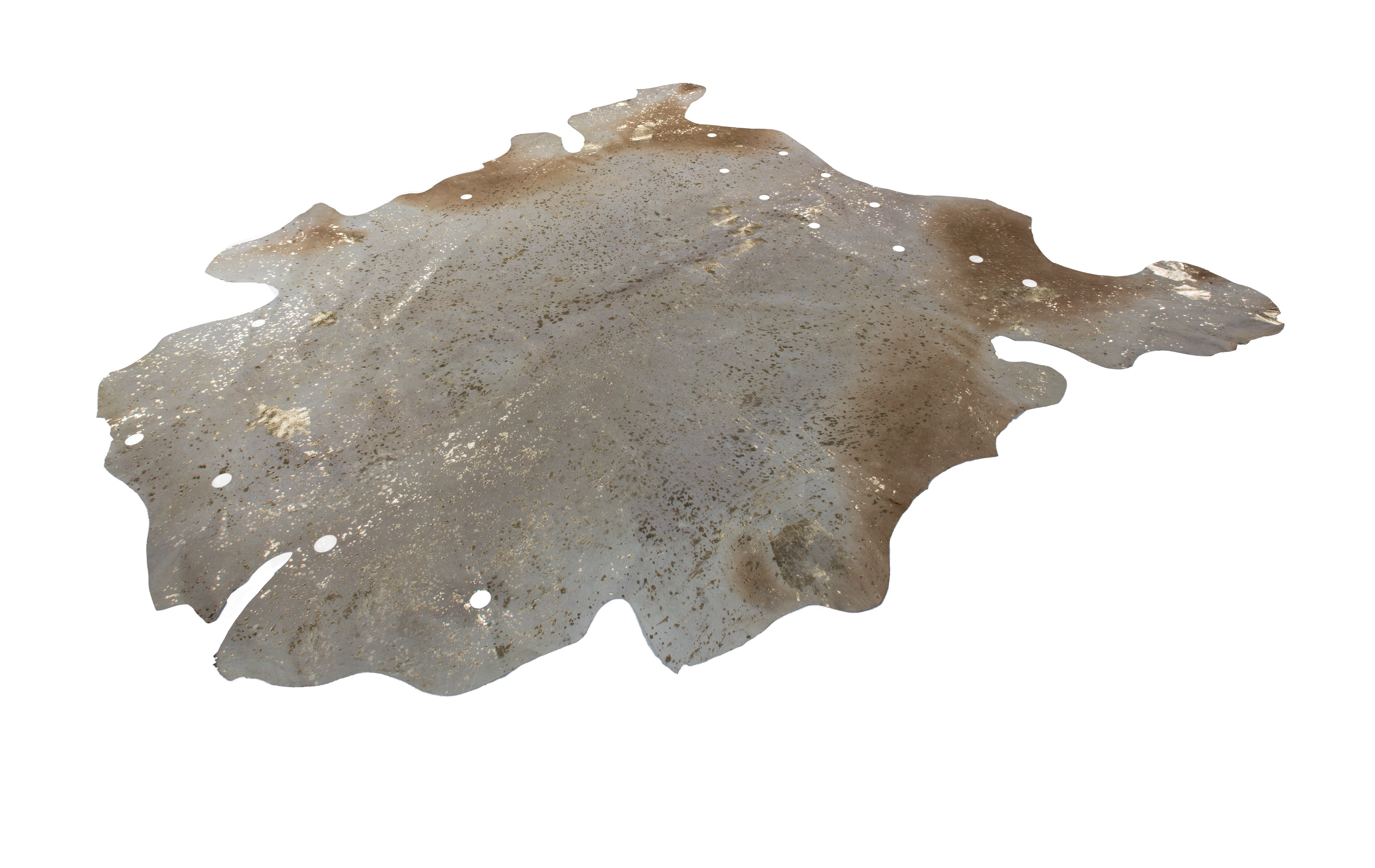 Designet på dette lædertæppe er kendetegnet ved ægte farvet læder, elegante guld- eller sølvdetaljer og en naturlig kontur. Attraktive udskæringer, der varierer i form og størrelse, giver tæppet et unikt udseende. Dette lædertæppe ser særligt iøjnefaldende ud i rum med minimalistiske, underspillede møbler og i kombination med træ eller andre naturlige materialer. De trykte folieelementer i guld eller sølv formidler luksus og elegance. Skab en hyggelig og sofistikeret atmosfære i dit hjem ved at bruge kohudstæppet som gulvbelægning, siddehynde eller vægophæng. Denne hyggelige gulvbelægning kan også bruges i rum med gulvvarme. Øg hyggefaktoren yderligere ved at placere puder, siddehynder og tæpper i nærheden af tæppet. Tæppet er lavet af 100% ægte kohud af høj kvalitet, er særligt nemt at pleje og kan nemt rengøres ved blot at støvsuge, banke eller tørre af med en fugtig klud. Dette lette, flade, attraktive lædertæppe beskytter dit gulv og tilføjer et sofistikeret touch til ethvert rum med sin eksklusivitet og naturlighed. Ægte kohud er et unikt stykke, så variationer i farve og tekstur kan forekomme. Dette gør hvert tæppe unikt, da ingen to skind er identiske. Naturskind kan fælde hår og plette en smule med tiden og ved kraftig brug. Metallfolien kan også skalle af nogle steder. Dette skyldes materialets naturlige natur og er ikke en fabrikationsfejl eller et kvalitetsproblem.