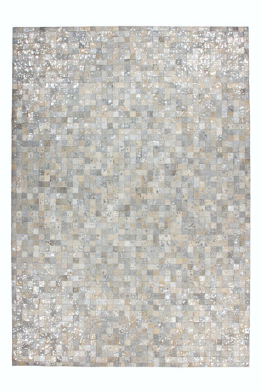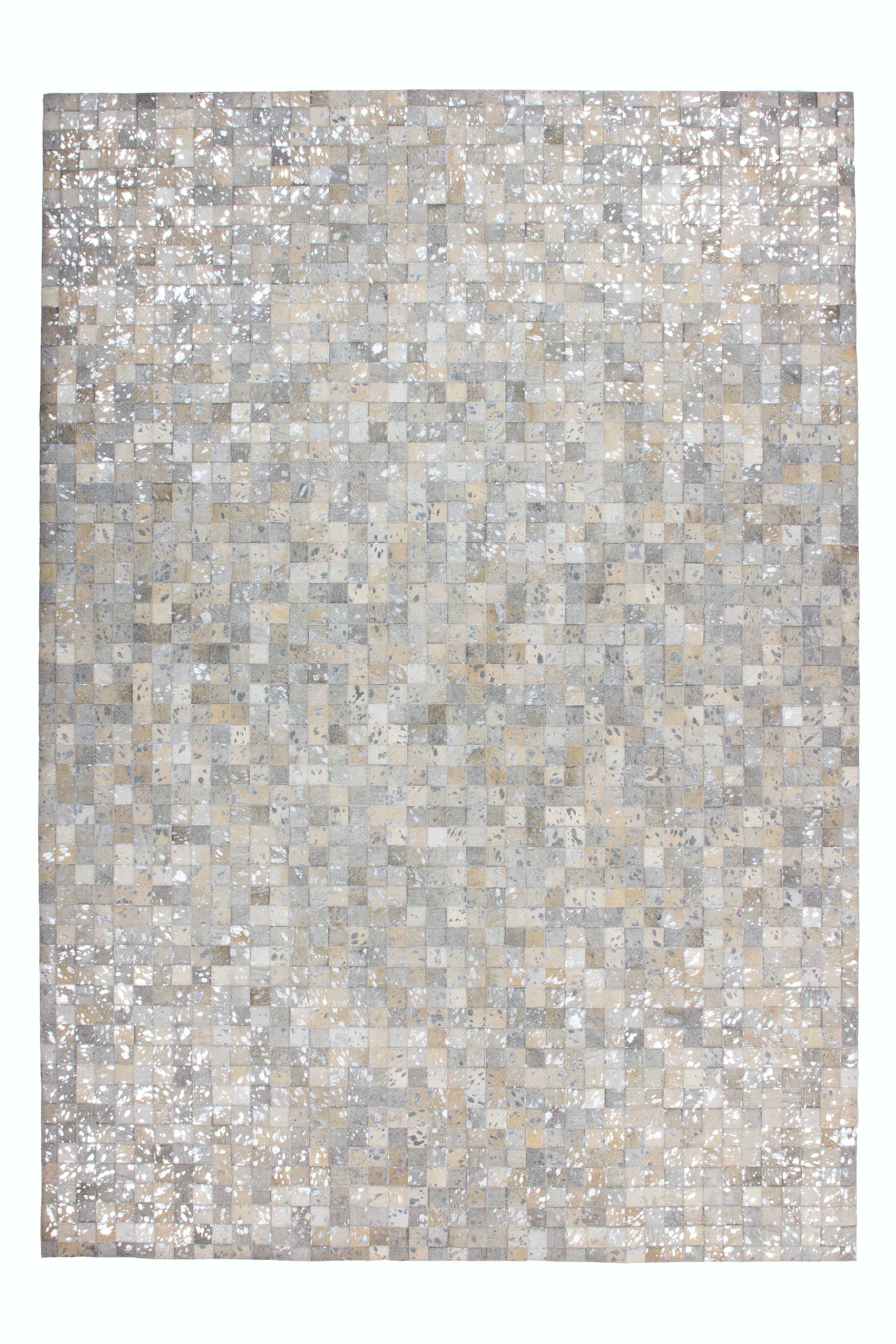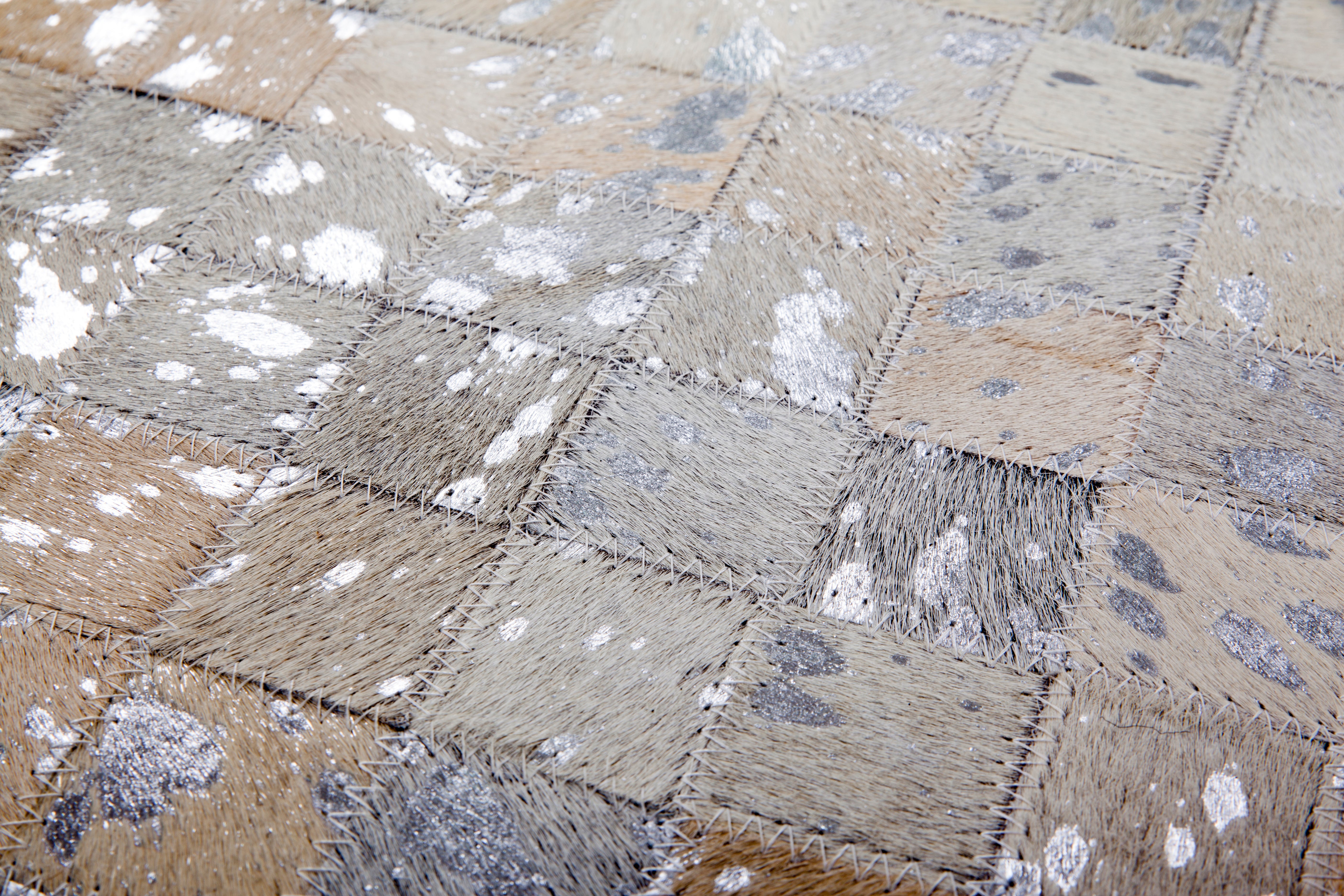 Metalapplikationer på ægte læder med bløde hår kendetegner dette tæppe. Tag dette unikke blikfang med hjem, og dine gæster vil blive forbløffede. Lædertæppet i patchwork-stil er baseret på forskellige nuancer af én farve. Den trykte metalliske folie er tæppets særlige højdepunkt, der tilføjer accenter og får tæppet til at skinne. Ingen to skind er identiske. Ligeledes er hvert af disse lædertæpper unikt på grund af naturlige variationer i størrelse, farve, mønster og tekstur. Disse unikke stykker suppleres af foliedekorationen i klare farver, guld eller sølv. Dette tæppe af høj kvalitet er kærligt håndlavet af det naturlige materiale læder. Dets holdbarhed og robusthed, sammen med dets lysægthed og nemme rengøring, må ikke undervurderes. Blød filt beklædte undersiden af lædertæppet, hvilket understøtter varme- og lydisolering. Selv rum med gulvvarme er ikke et problem for tæppet. Kombineret med attraktive læderhynder, placeret på din sofa eller dekorativt på stole, kan du skabe et slående helhedsindtryk. Den naturlige pels kan falde af med tiden og ved kraftig brug. Ligeledes kan folietrykket skalle af nogle steder. Dette skyldes produktets naturlige natur og er ikke en kvalitetsfejl eller fabrikationsfejl.