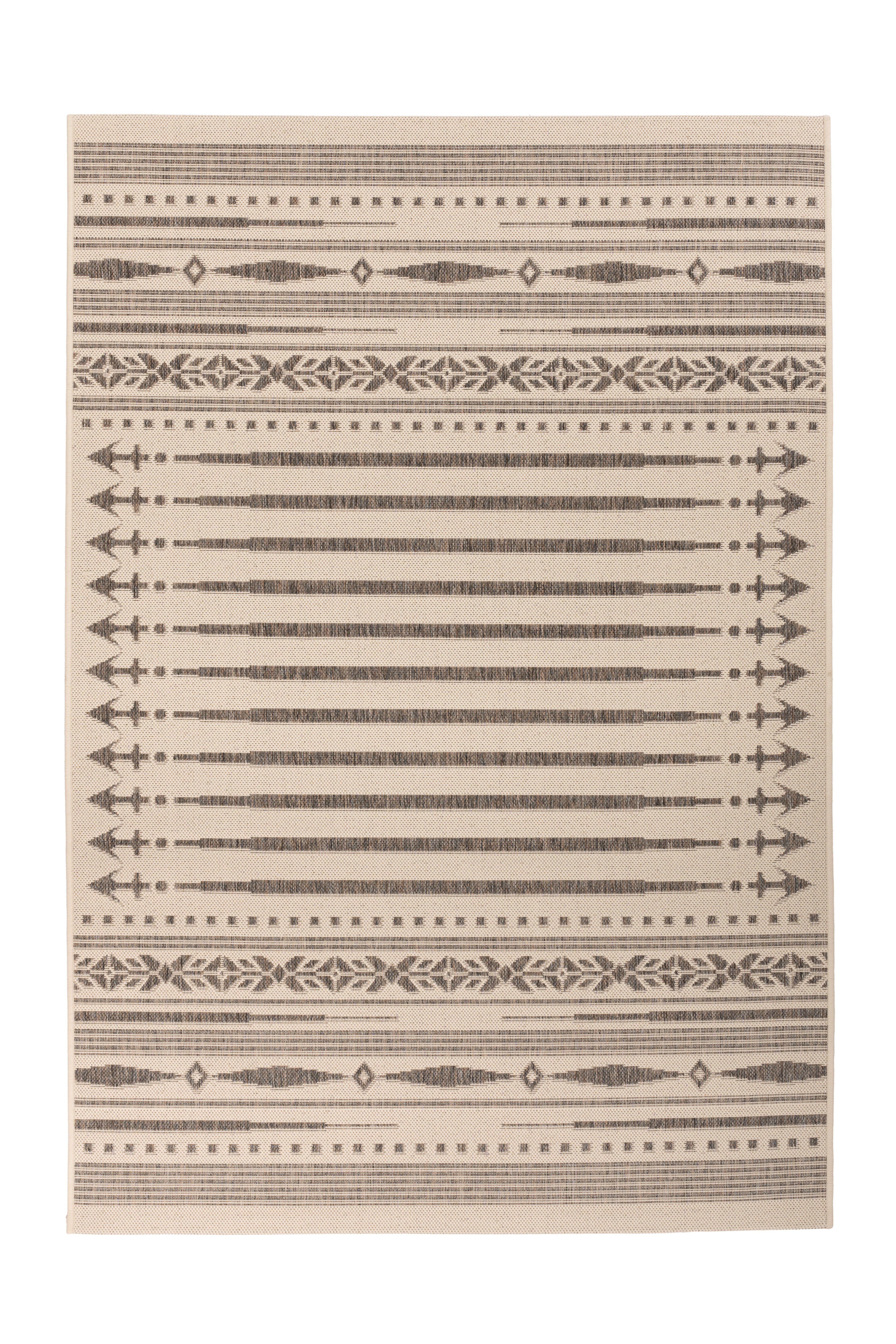 Dette lavluvede tæppe med et flettet look og trendy design er en sand trendsætter, der tilføjer middelhavsaccenter til ethvert opholdsområde. Designet understreger ethvert moderne præg. Dets naturlige karakter udstråler en unik charme.  Det naturlige look giver en ny dimension af styrke. Med sin specielle, fladvævede luv er dette lavluvede tæppe med sisal-look et alsidigt hverdagsstykke, der giver et perfekt finish til en bred vifte af boligindretning og kan bruges indendørs og udendørs. Tæppet til indendørs/udendørs brug tåler nemt hård brug. De diskret nuancerede farver tilpasser sig ethvert miljø. Tæppet kan bruges som blikfang i stuen, som tæppe i gangen eller som blikfang på terrassen eller altanen. Den robuste luv står i direkte forhold til dets geometriske mønster og understreger tydeligt den stærke karakter af dette lavluvede tæppe. Fugt har ingen chance. Fordelene er åbenlyse: overkommelige priser, ultramoderne, holdbare og nemme at vedligeholde!