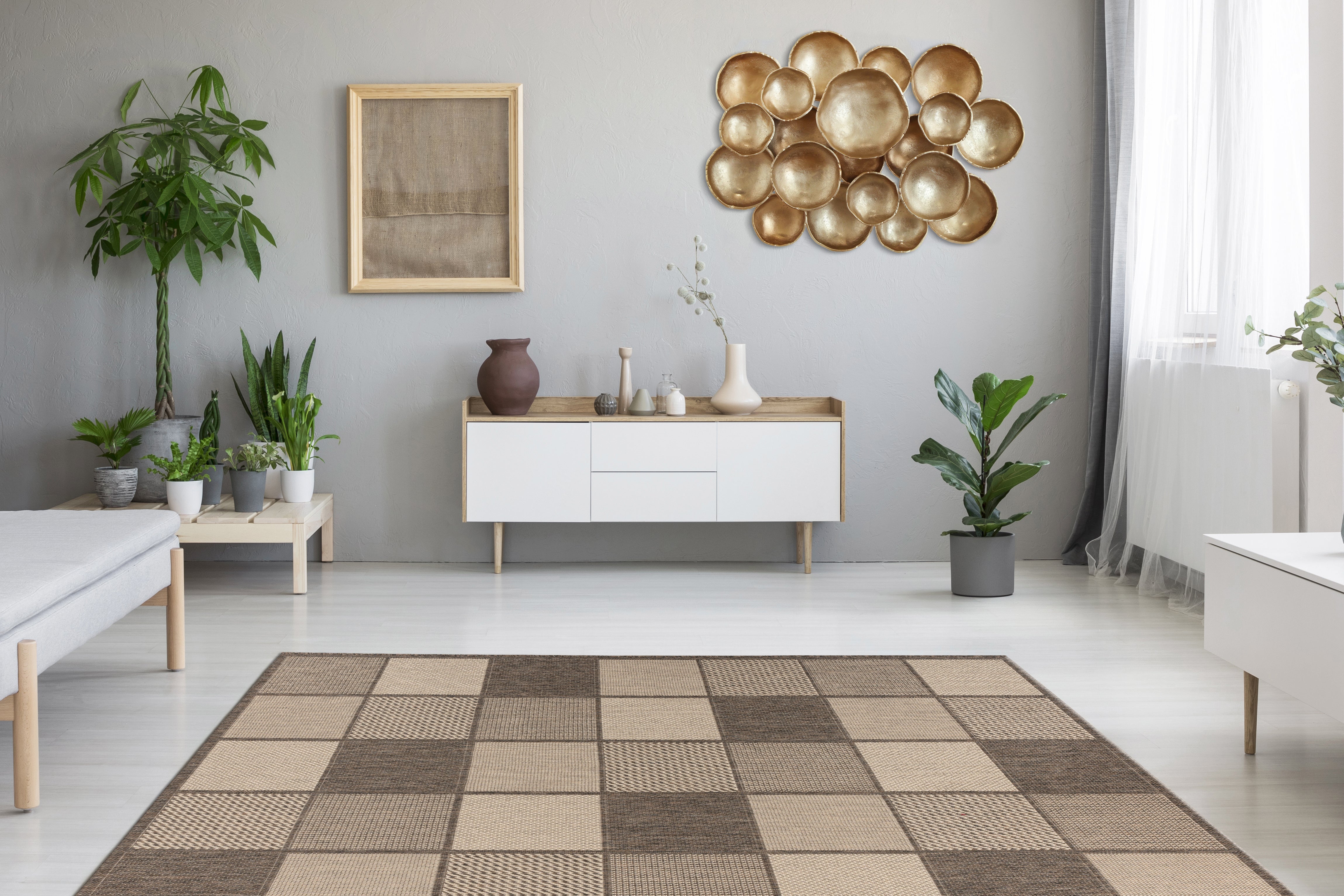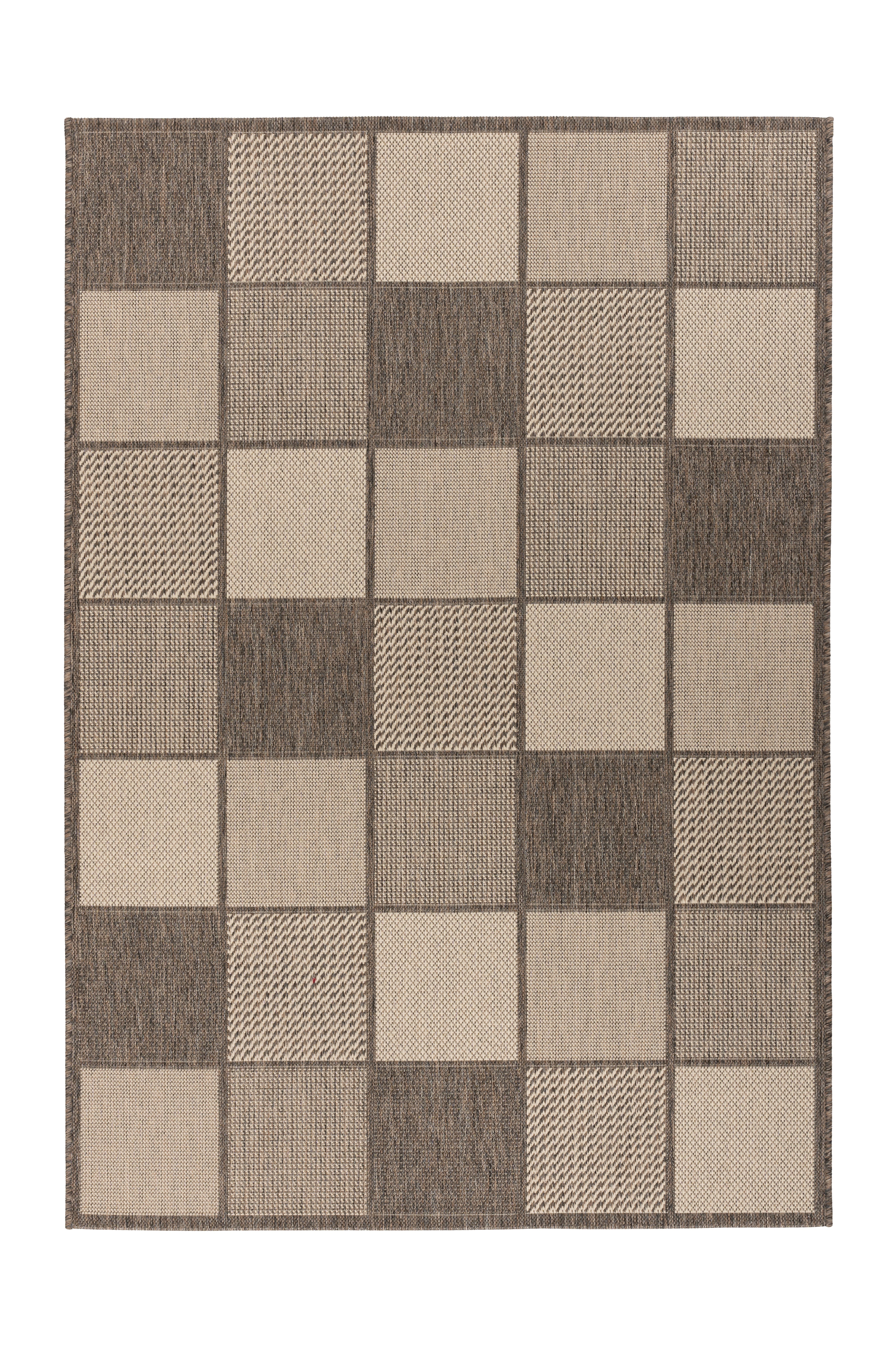 Dette lavluvede tæppe med et flettet look og trendy design er en sand trendsætter, der tilføjer middelhavsaccenter til ethvert opholdsområde. Designet understreger ethvert moderne præg. Dets naturlige karakter udstråler en unik charme.  Det naturlige look giver en ny dimension af styrke. Med sin specielle, fladvævede luv er dette lavluvede tæppe med sisal-look et alsidigt hverdagsstykke, der giver et perfekt finish til en bred vifte af boligindretning og kan bruges indendørs og udendørs. Tæppet til indendørs/udendørs brug tåler nemt hård brug. De diskret nuancerede farver tilpasser sig ethvert miljø. Tæppet kan bruges som blikfang i stuen, som tæppe i gangen eller som blikfang på terrassen eller altanen. Den robuste luv står i direkte forhold til dets geometriske mønster og understreger tydeligt den stærke karakter af dette lavluvede tæppe. Fugt har ingen chance. Fordelene er åbenlyse: overkommelige priser, ultramoderne, holdbare og nemme at vedligeholde!