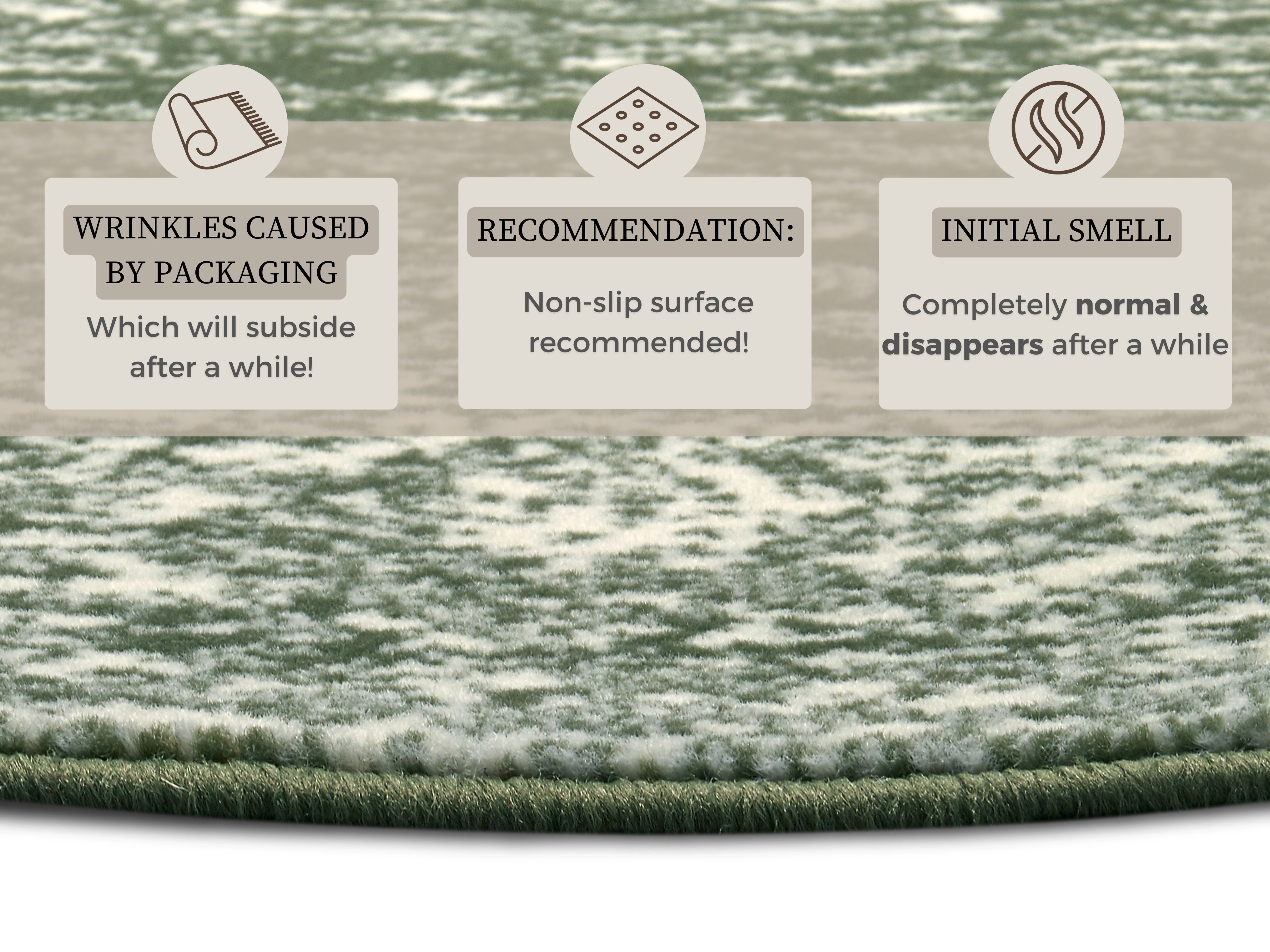 Vær opmærksom på, at nye tæpper kan have en midlertidig lugt ved udpakning, som stammer fra produktionen og indpakningen. Dette er normalt og aftager typisk inden for 1–2 uger efter udpakning, især ved god udluftning. Denne lugt betragtes ikke som en produktfejl.