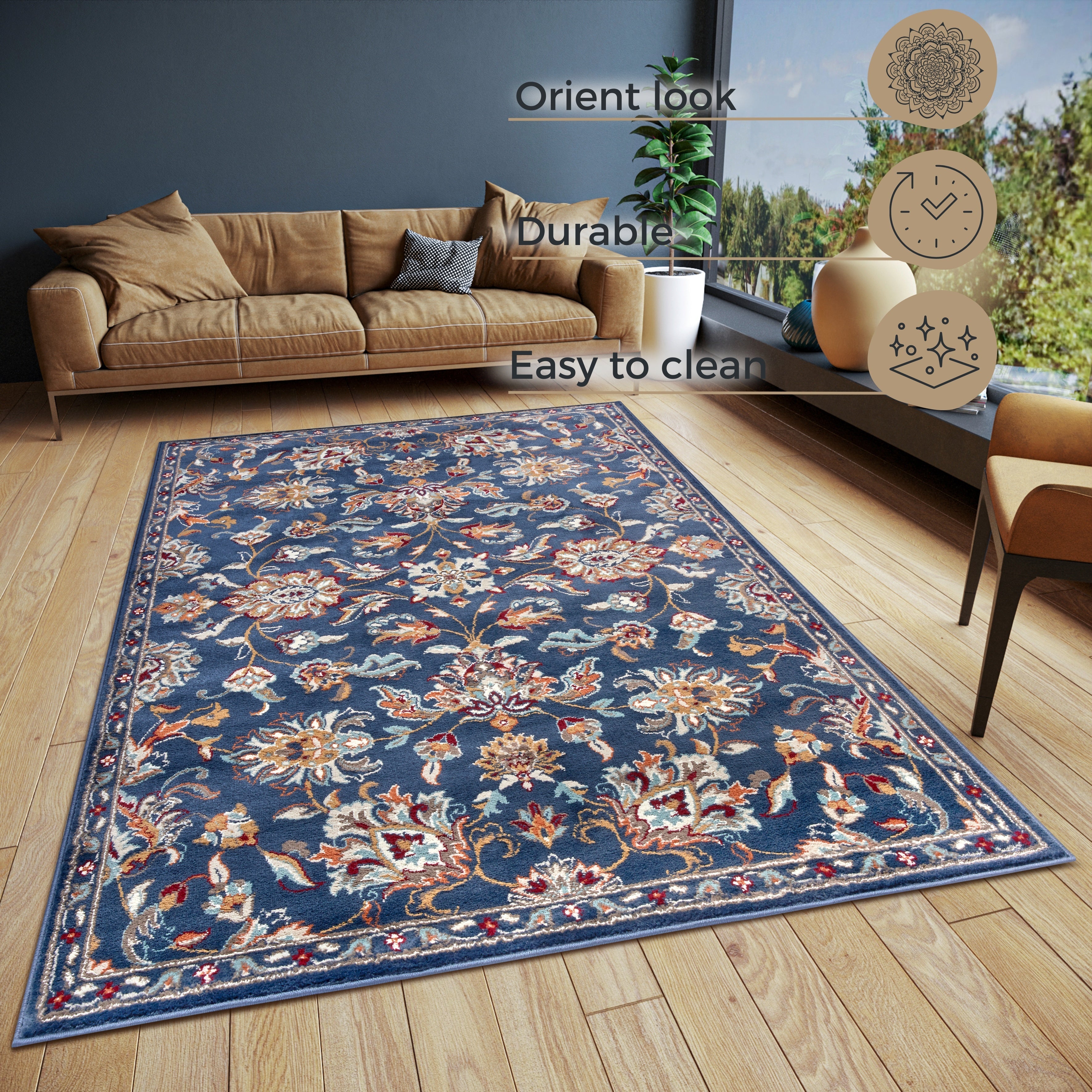 Luxor-tæppets smukke, orientalske design i klassiske farvekombinationer gør det utroligt alsidigt. Den robuste kantning, der kaldes en 'border', sikrer lang holdbarhed og et stilfuldt udseende. Bagsiden, fremstillet af en kombination af jute og polypropylen, giver tæppet stabilitet og forhindrer det i at glide. Den høje kvalitet og de syntetiske fibre gør tæppet yderst slidstærkt og nemt at rengøre. De florale designs passer til alle gulvtyper, inklusive gulvvarme.
