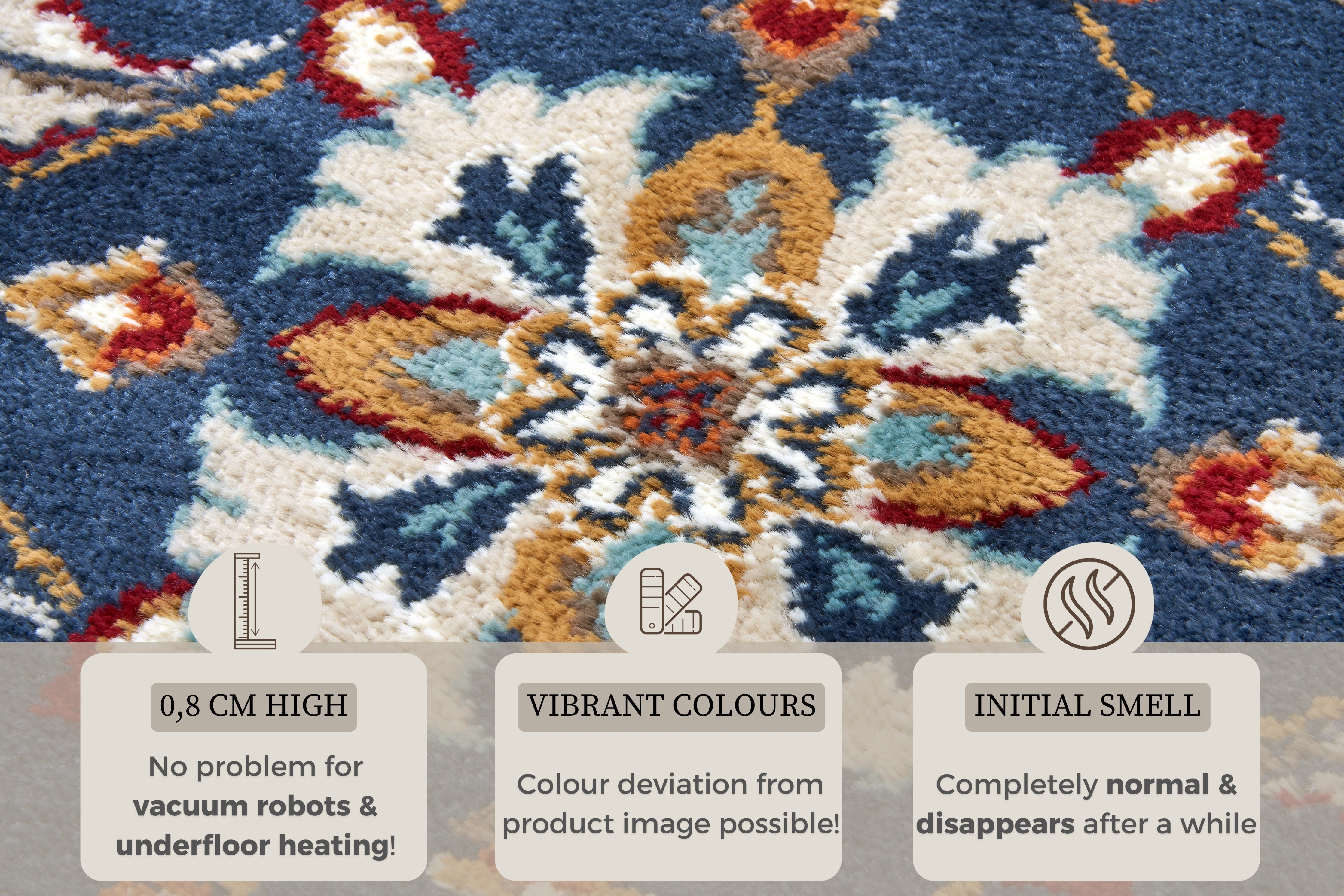 Vær opmærksom på, at nye tæpper kan have en midlertidig lugt ved udpakning, som stammer fra produktionen og indpakningen. Dette er normalt og aftager typisk inden for 1–2 uger efter udpakning, især ved god udluftning. Denne lugt betragtes ikke som en produktfejl.