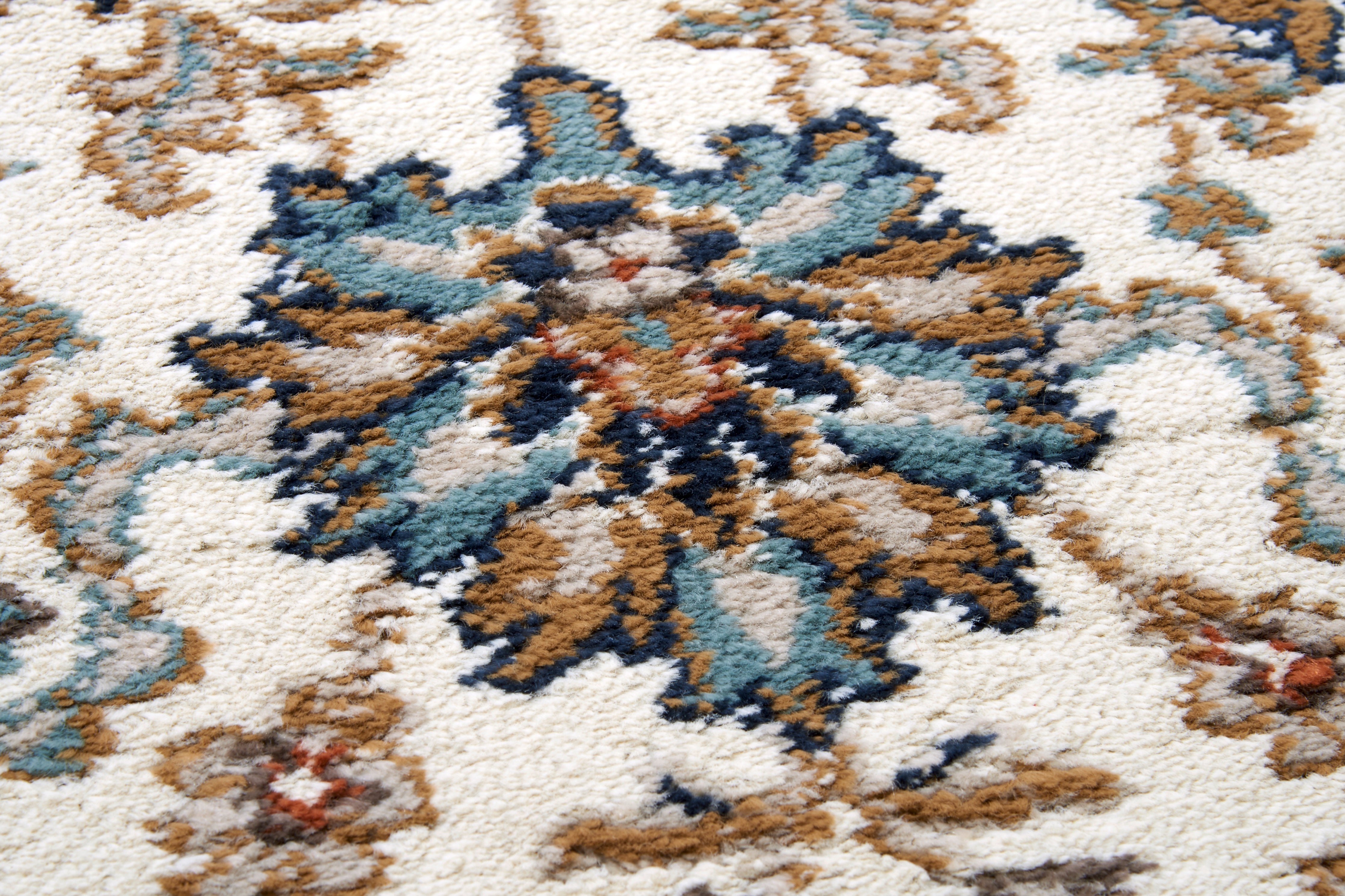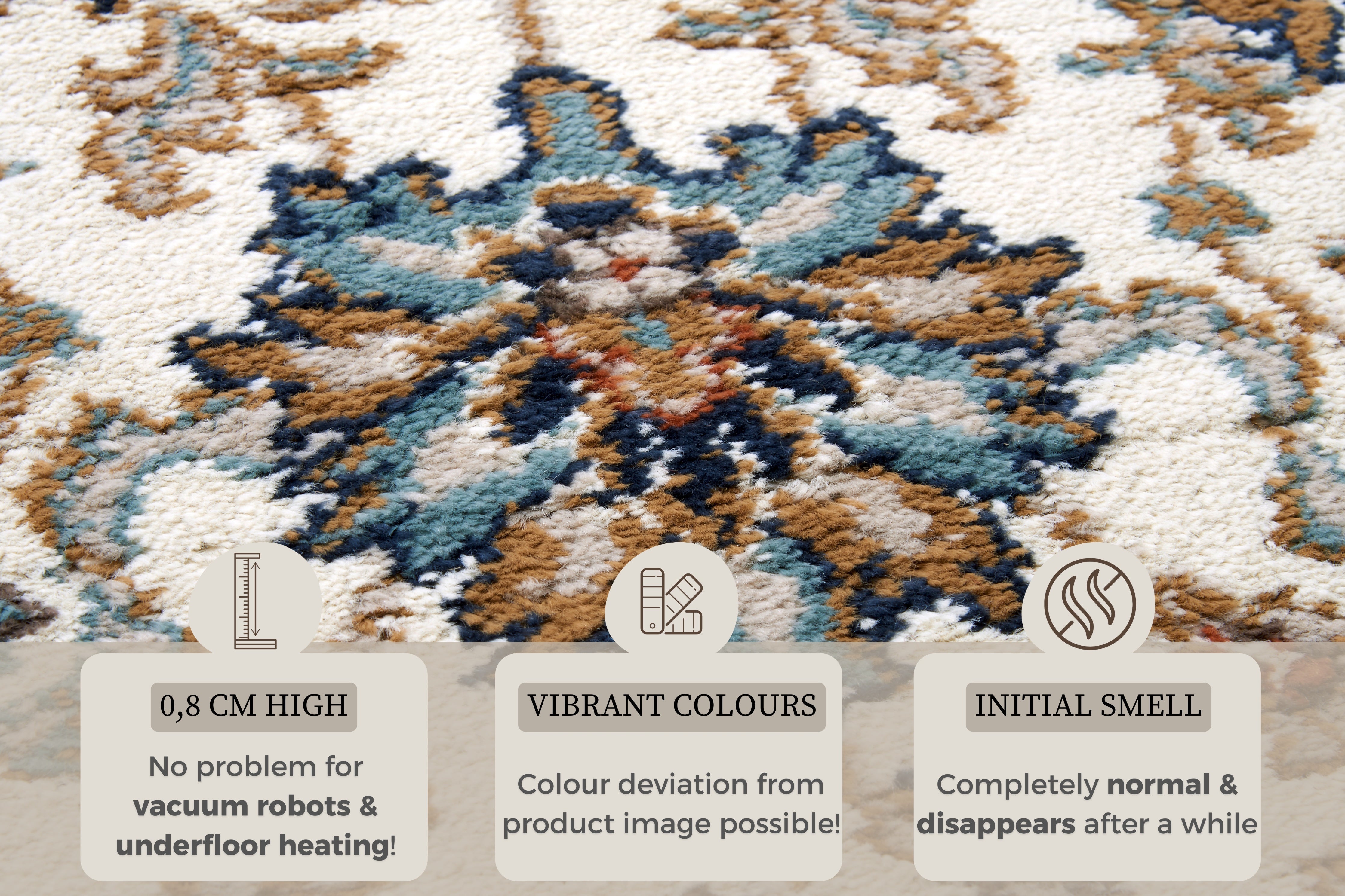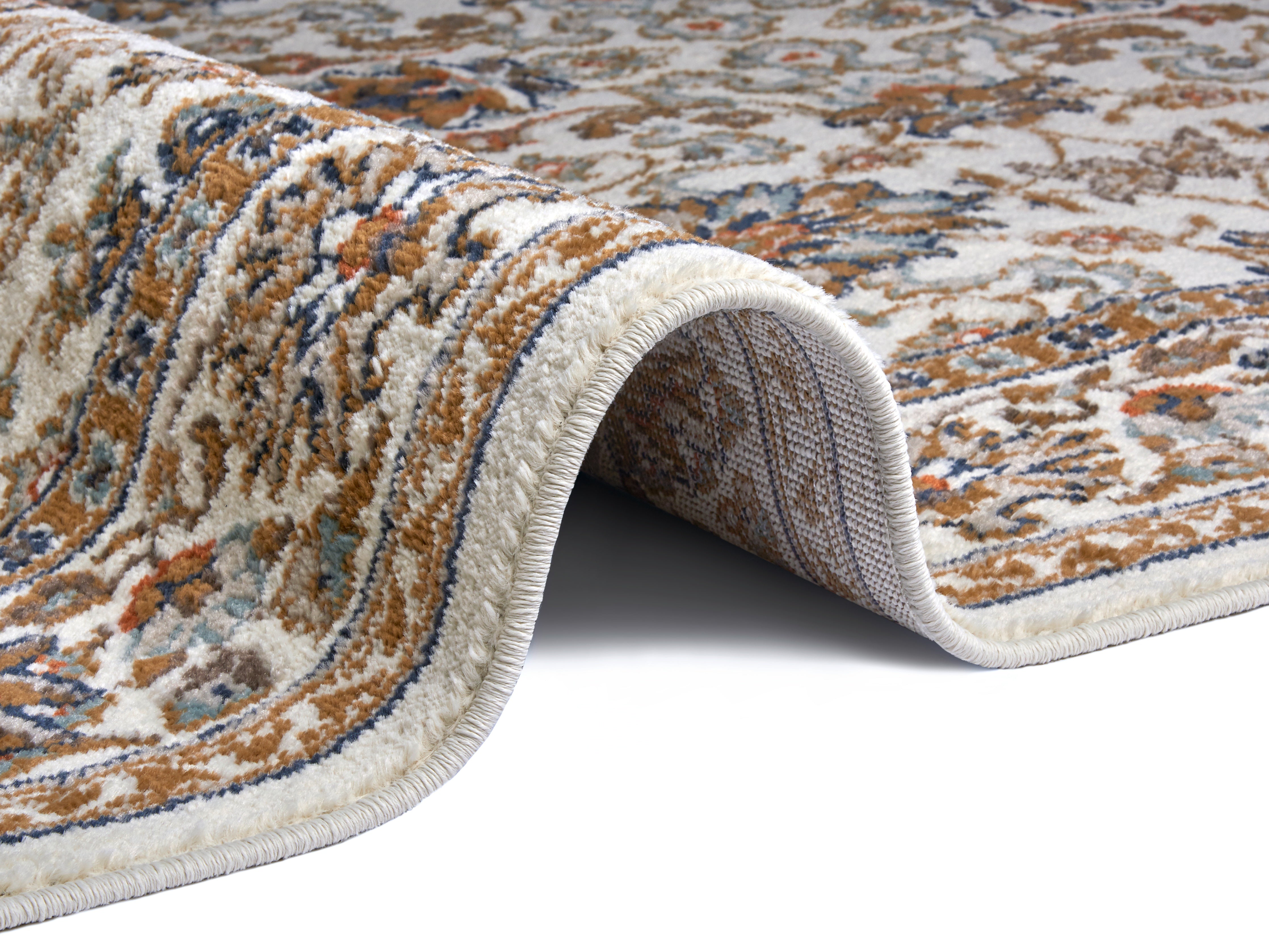 Luxor-tæppets smukke orientalske mønster i klassiske farvekombinationer gør det utroligt alsidigt. Den robuste kantning, en elegant border, sikrer lang holdbarhed og et flot finish. Bagsiden i en kombination af jute og polypropylen giver tæppet stabilitet og forhindrer det i at glide, samtidig med at det er velegnet til gulvvarme. Den høje kvalitet og de syntetiske fibre gør tæppet yderst slidstærkt og nemt at rengøre, perfekt til en travl hverdag.
