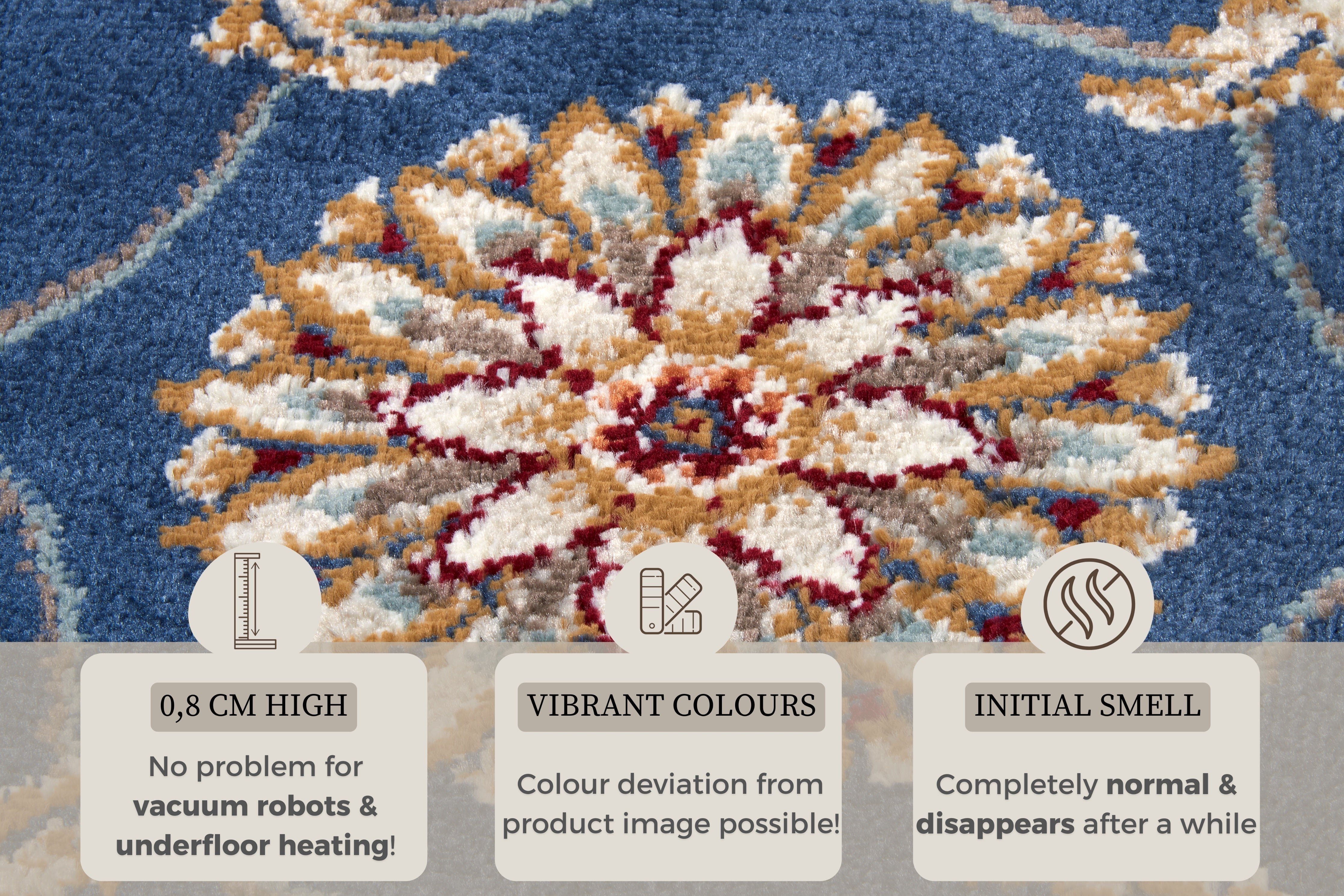 Vær opmærksom på, at nye tæpper kan have en midlertidig lugt ved udpakning, som stammer fra produktionen og indpakningen. Dette er normalt og aftager typisk inden for 1–2 uger efter udpakning, især ved god udluftning. Denne lugt betragtes ikke som en produktfejl.