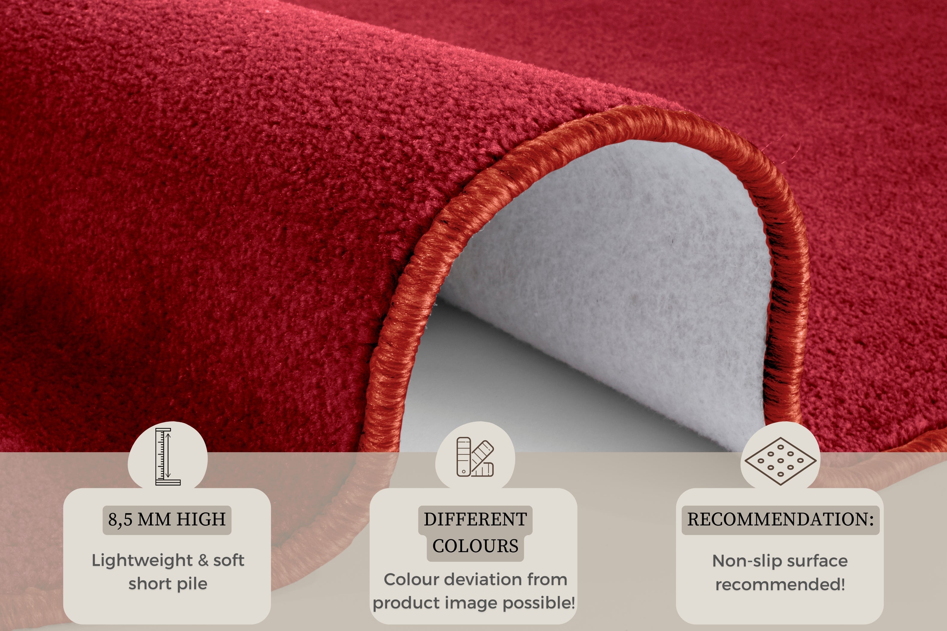 Med en luvhøjde på 0.85 mm tilbyder Nasty tæppet en behagelig blødhed under fødderne. For at holde tæppet rent og pænt anbefales det at rengøre det med tæpperens eller tæppeshampoo.