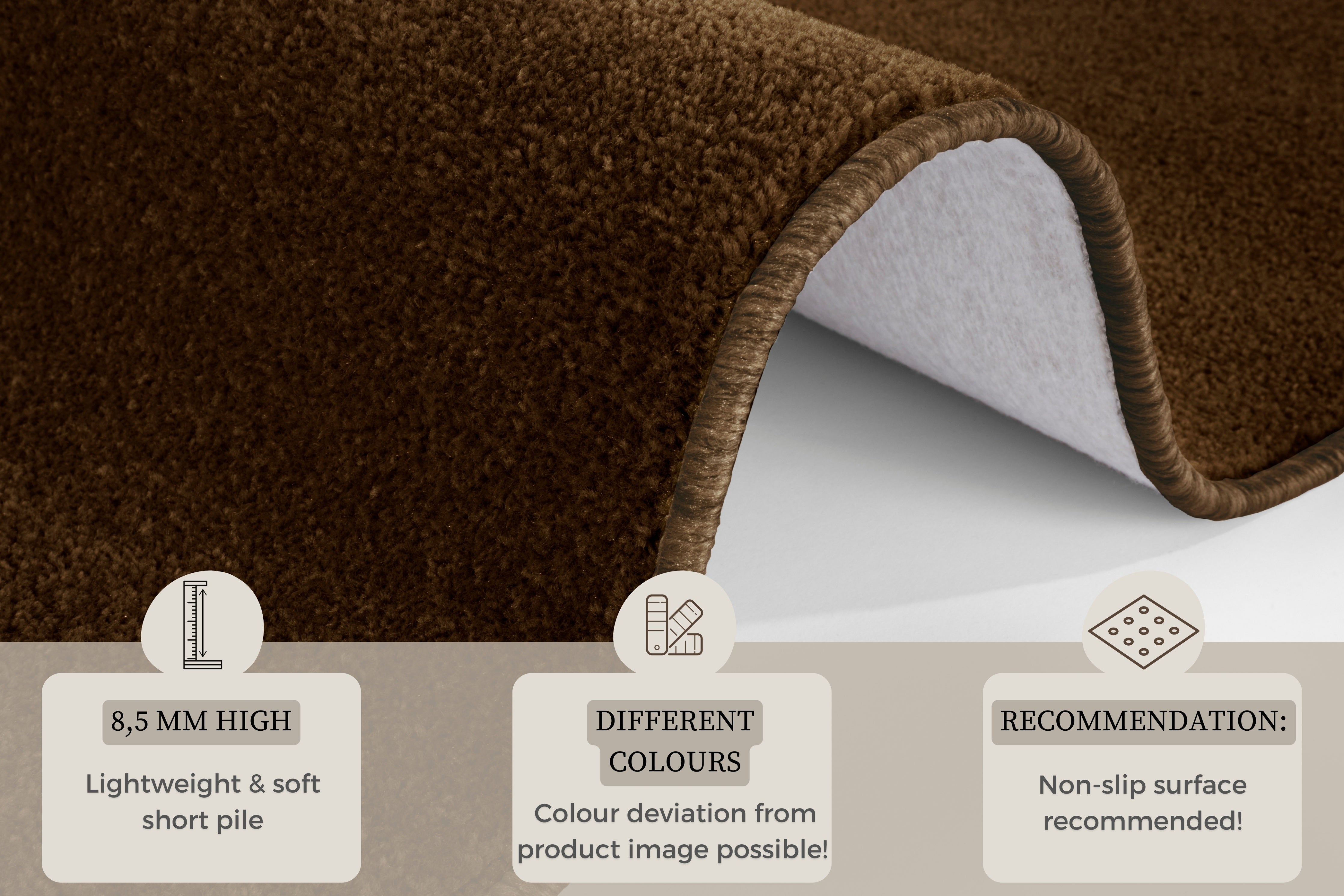 Nasty - 101154 Brun har en luvhøjde på 0.85 mm, hvilket giver en behagelig og blød fornemmelse under fødderne. Rengøring er let og bekvemt med tæppeskum eller shampoo.