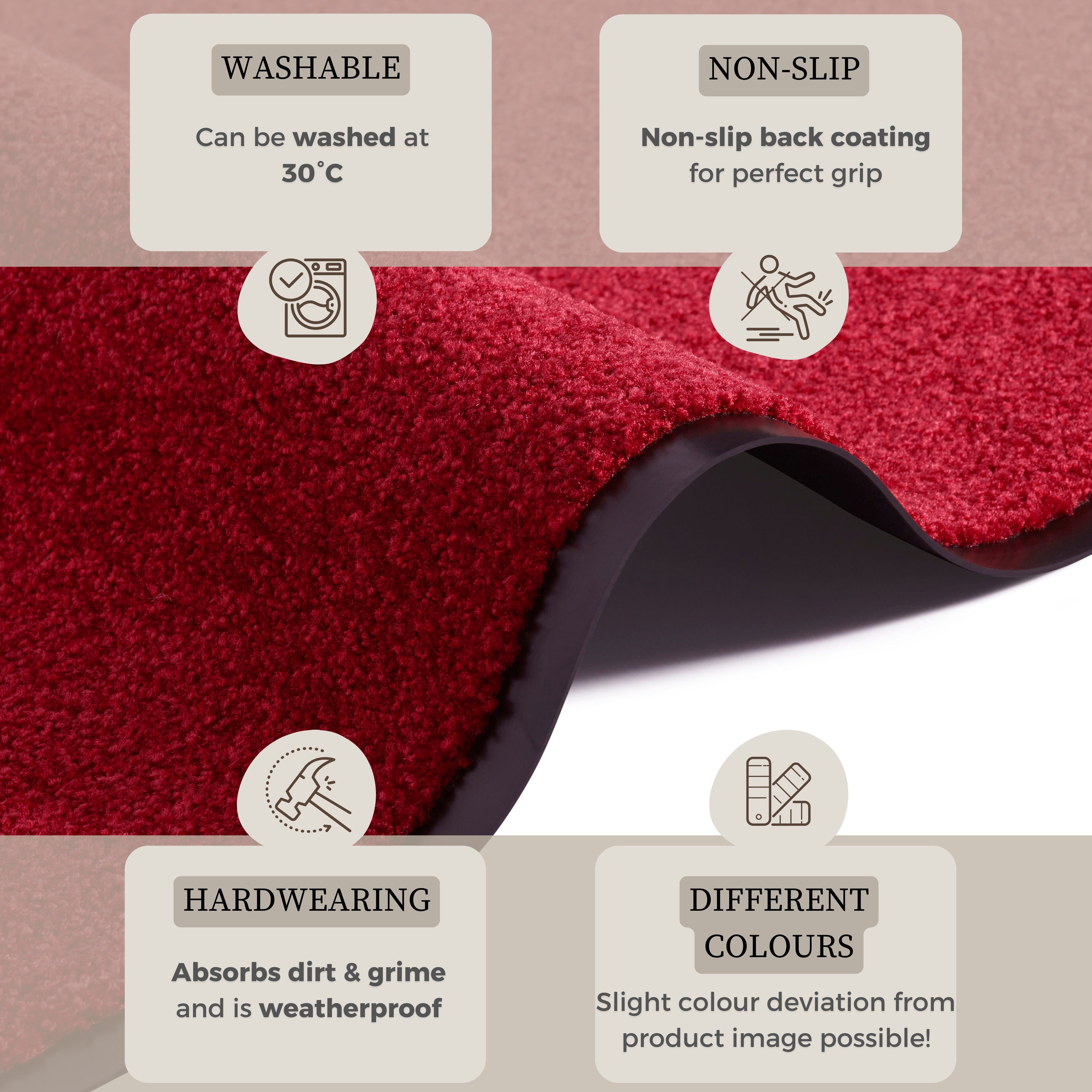 Måtten "Wash & Clean" er specielt designet til at modstå vind og vejr. Den er yderst absorberende, hvilket gør den ideel til at fange snavs og fugt, inden det kommer ind i dit hjem. Den skridsikre bagside af nitrilgummi sørger for, at måtten ligger sikkert på plads, selv på glatte overflader, og giver ekstra tryghed for hele familien. Den er nem at rengøre med en simpel håndvask ved 30 grader, så du kan holde den frisk og pæn i lang tid.