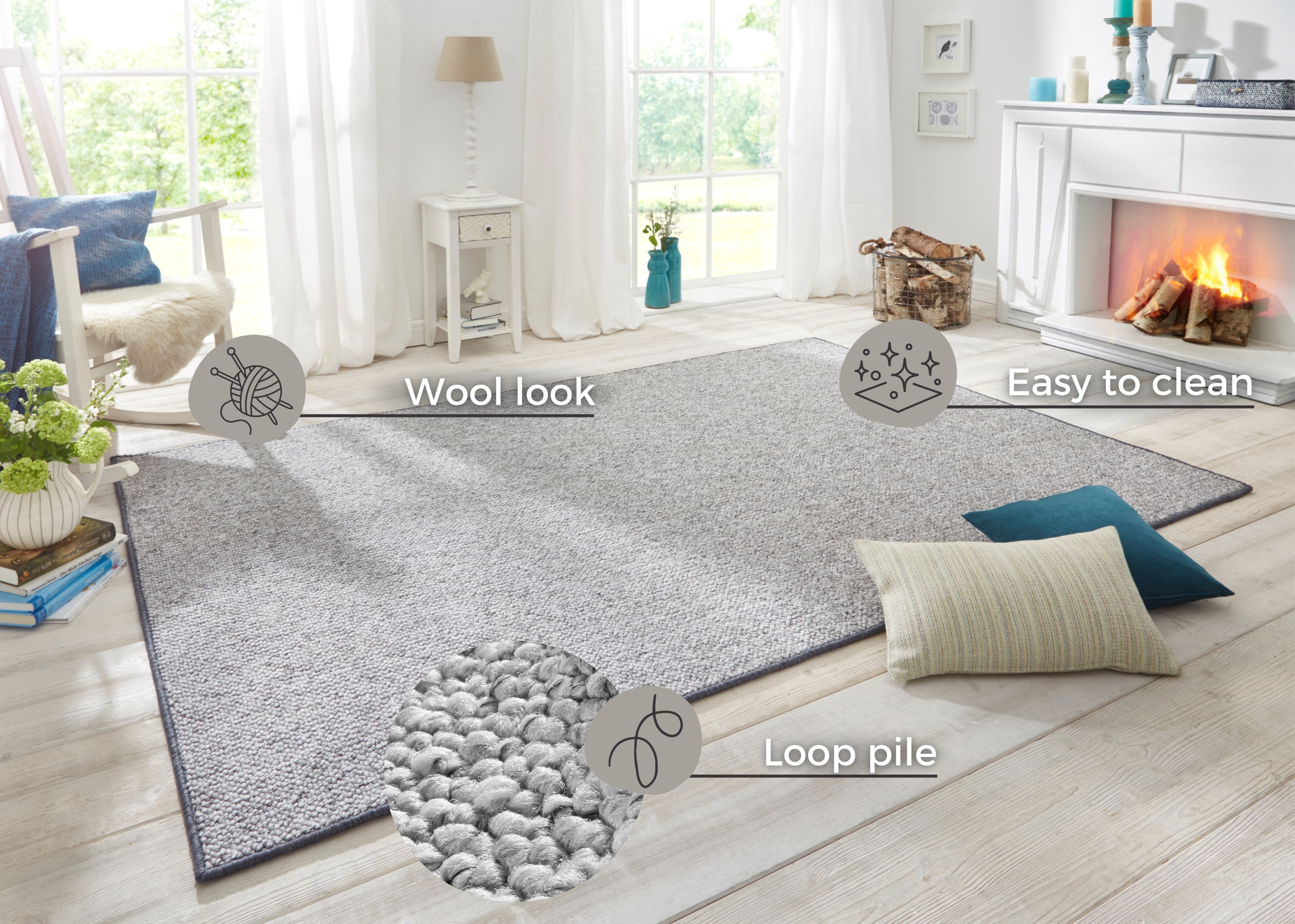 Med en luvhøjde på 1,2 mm tilbyder Wolly-tæppet en behagelig og let følelse under fødderne. For at holde tæppet rent og pænt anbefales det at rengøre det med tæpperens eller tæppeshampoo.