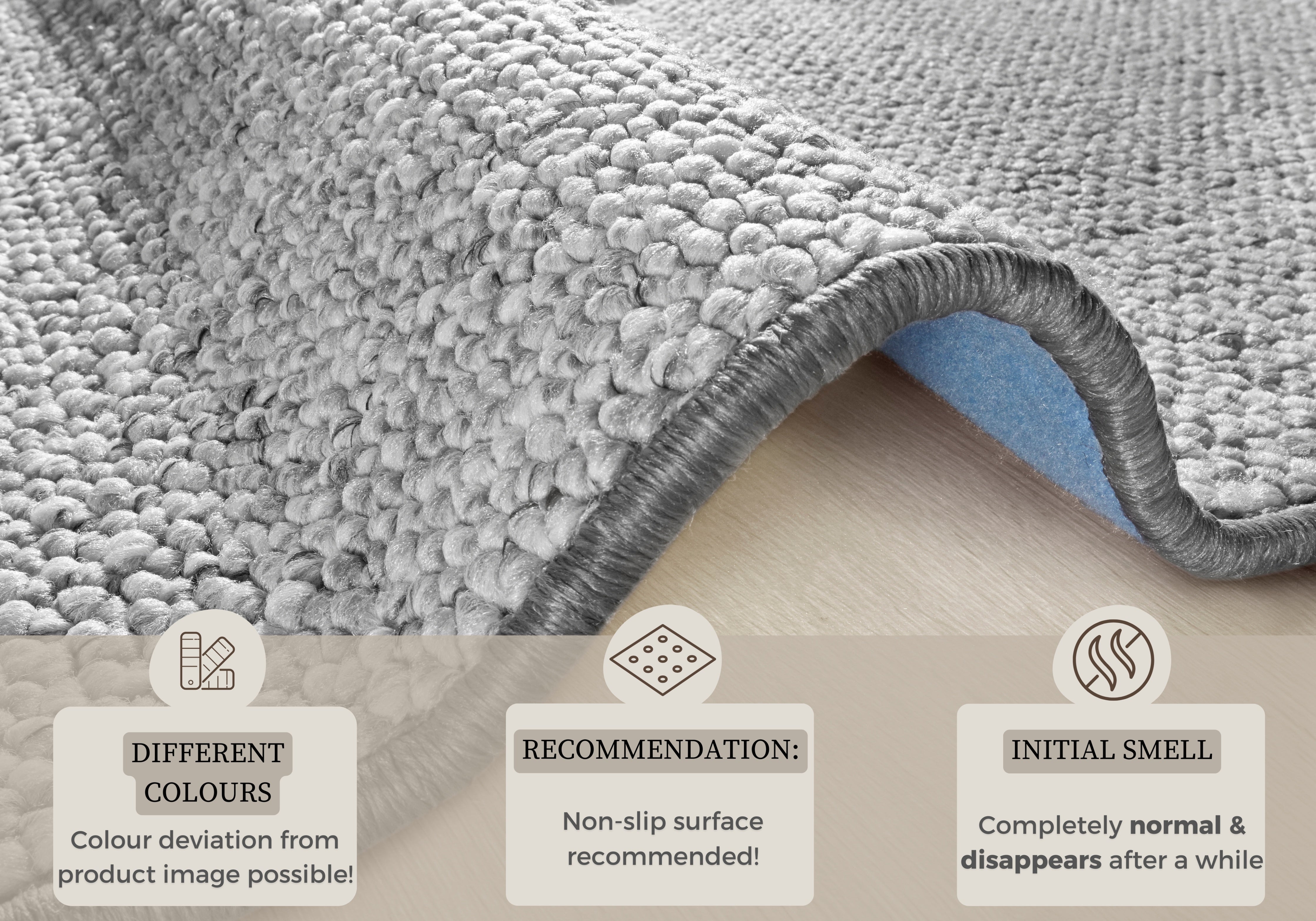 Vær opmærksom på, at nye tæpper kan have en midlertidig lugt ved udpakning, som stammer fra produktionen og indpakningen. Dette er normalt og aftager typisk inden for 1–2 uger efter udpakning, især ved god udluftning. Denne lugt betragtes ikke som en produktfejl.