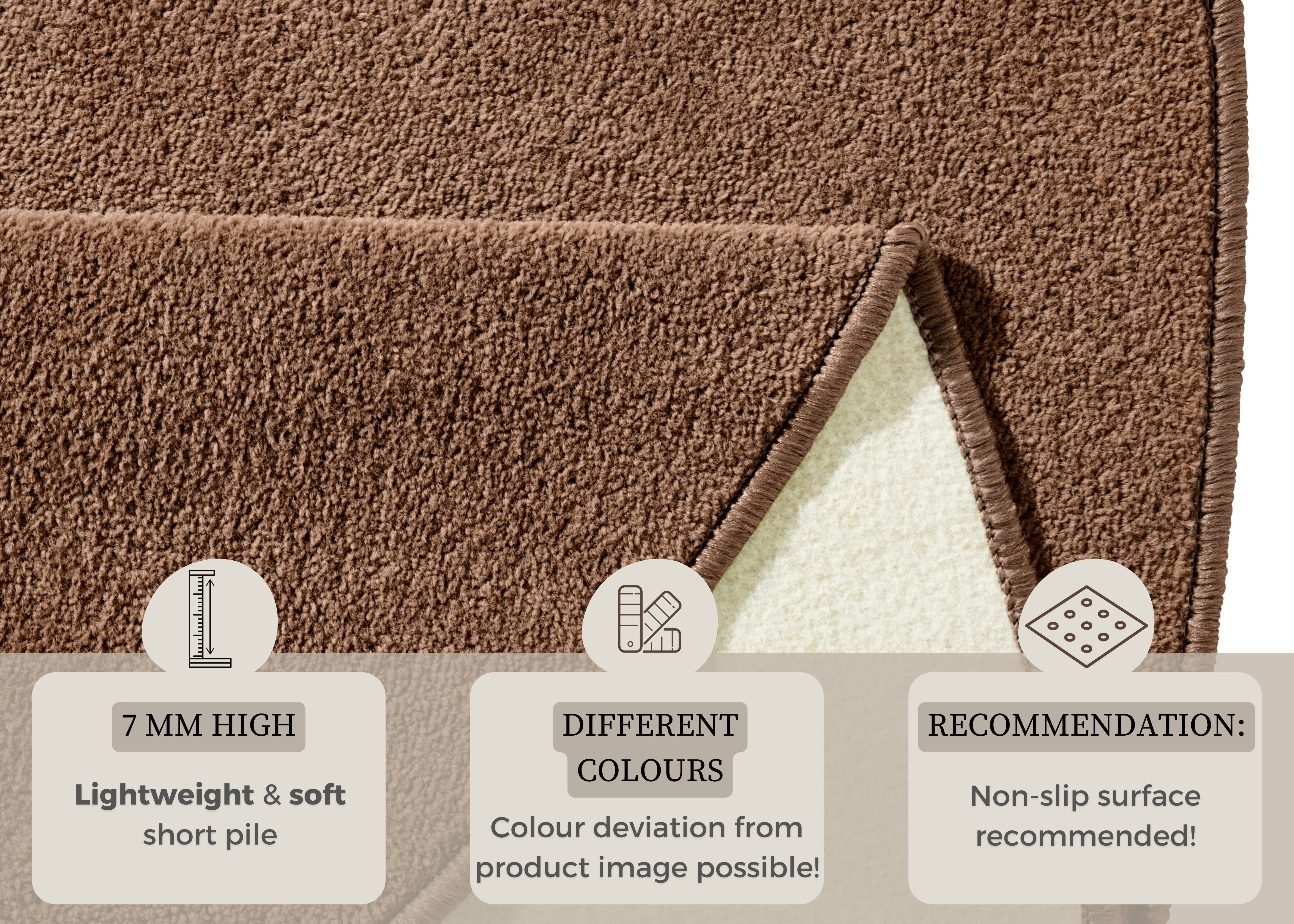 Med en luvhøjde på blot 0.7 mm tilbyder "Fancy" tæppet en behagelig, lavpolet følelse under fødderne. For at bevare tæppets skønhed anbefales rengøring med tæpperens eller tæppeshampoo.