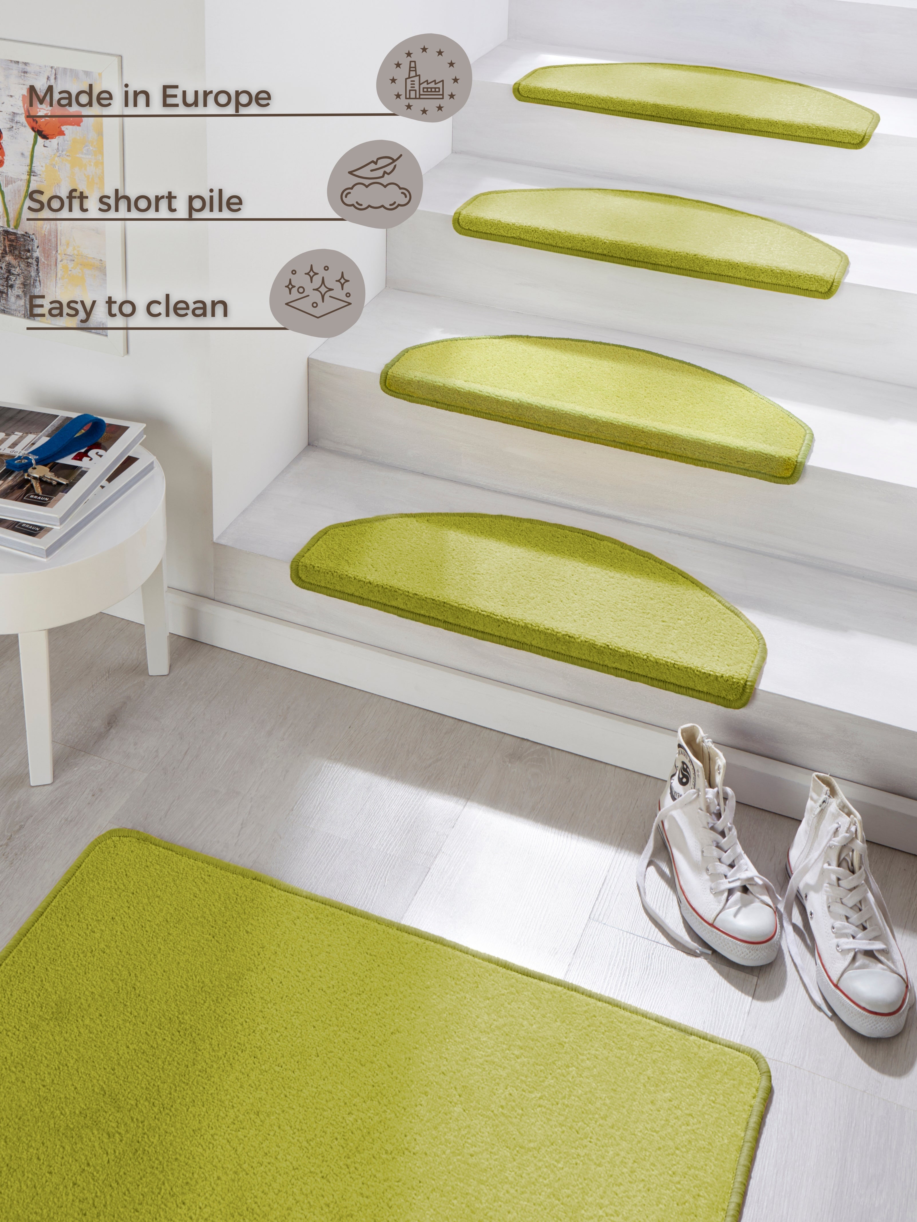 Hvert tæppe måler 23 x 65 cm og kommer i en pakke med i alt 15 stk., hvilket gør det nemt at beklæde en hel trappe.