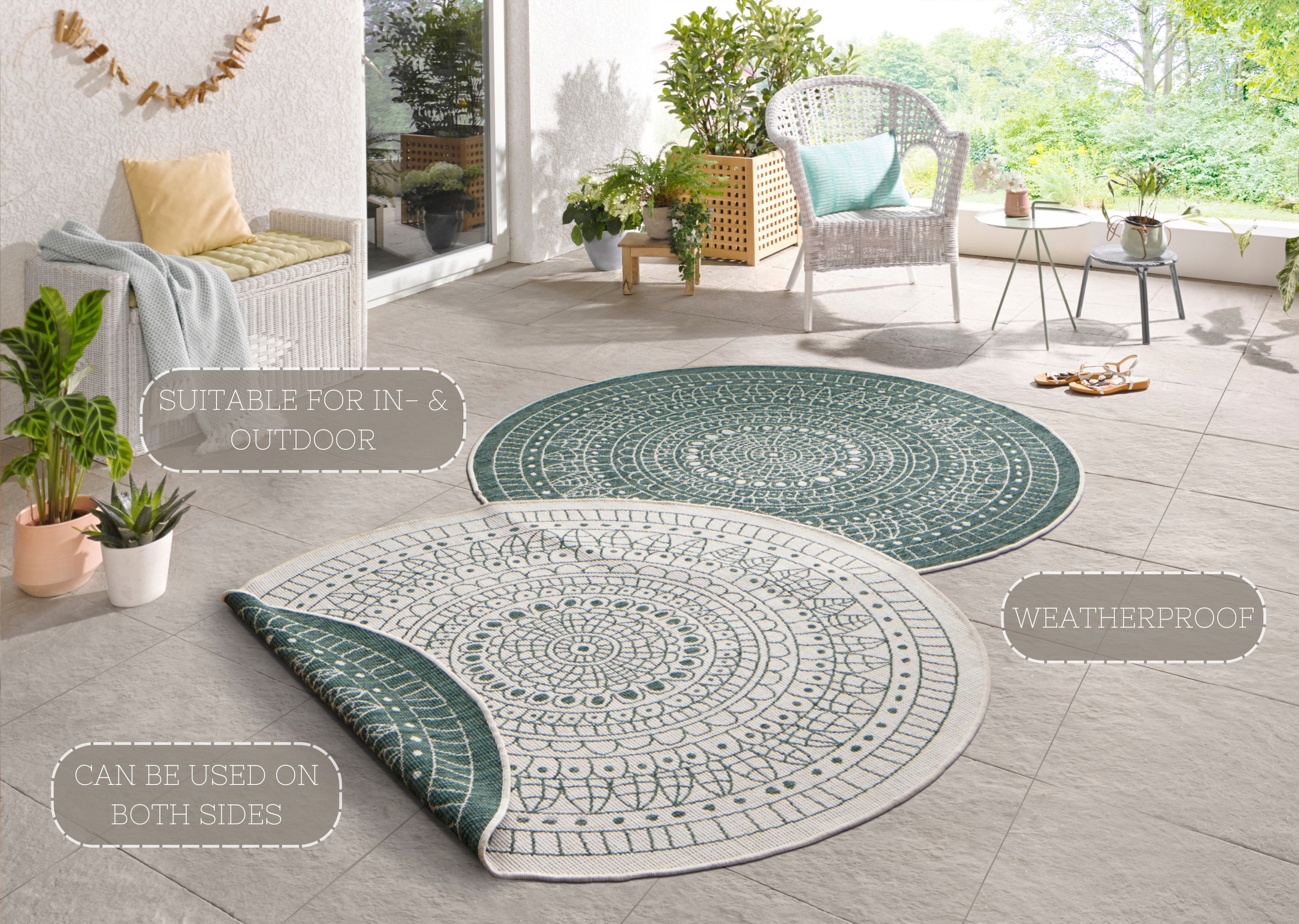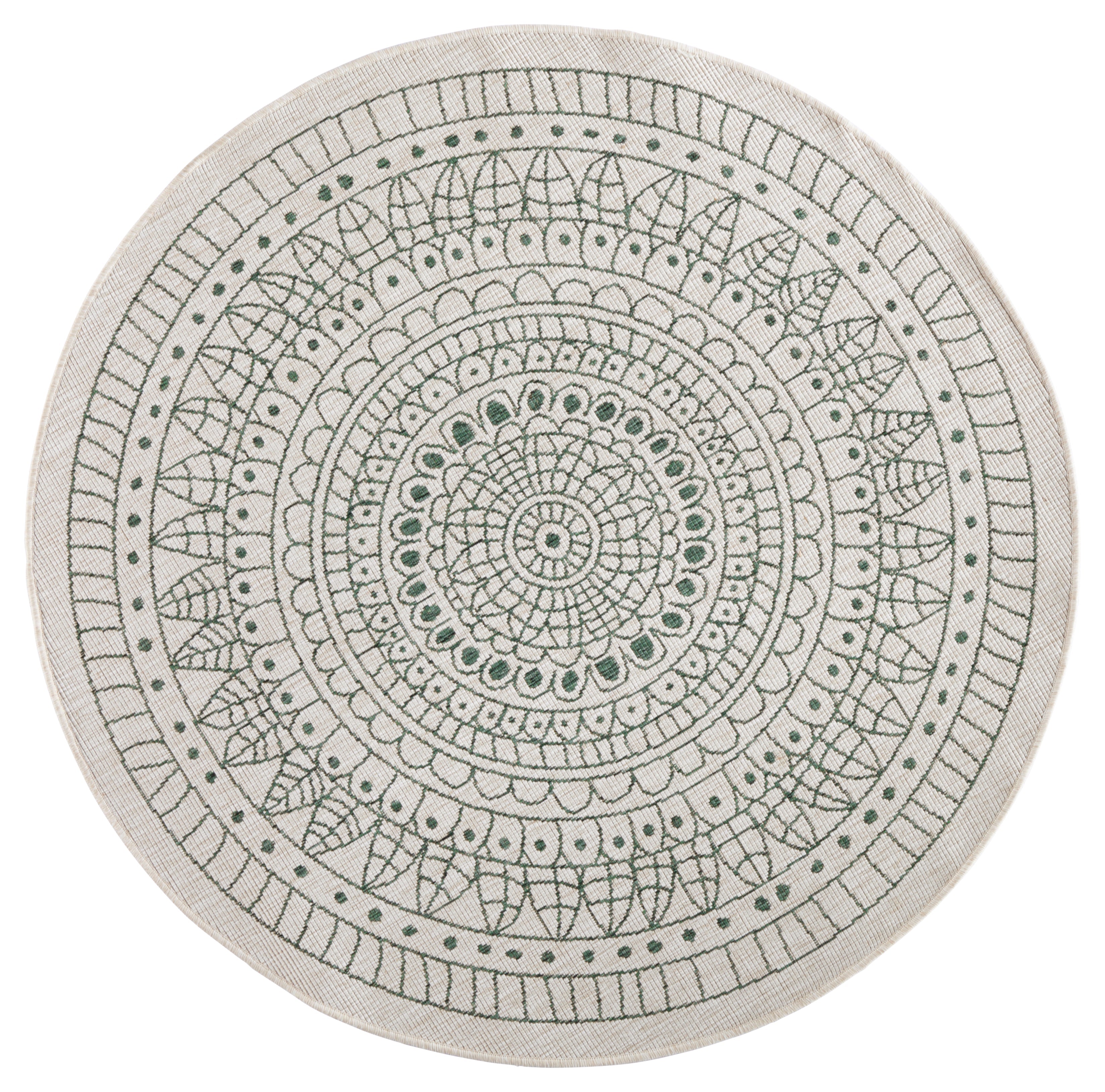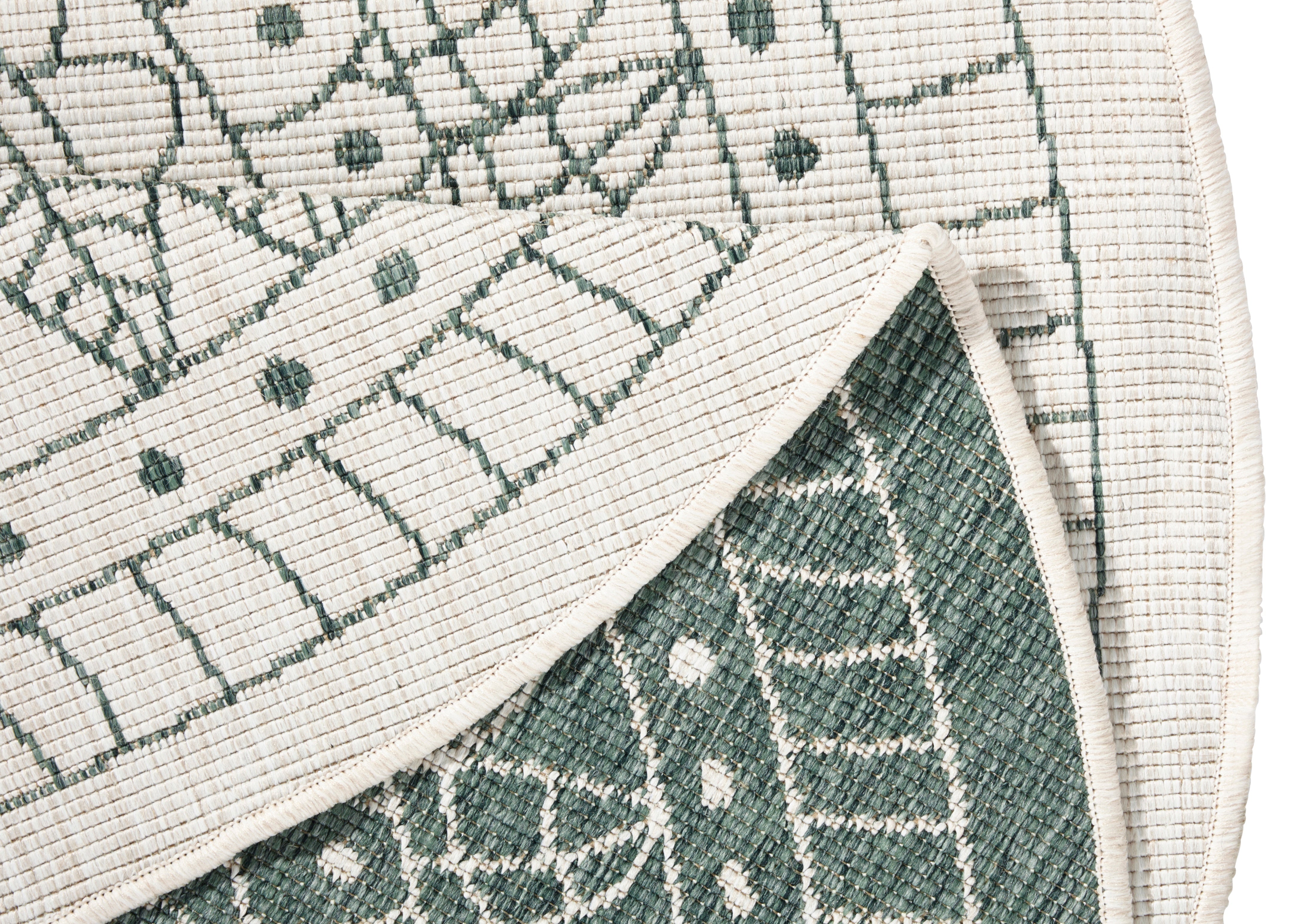 Tilføj et strejf af boheme-chic til dit hjem med Twin-tæppet i en frisk grøn/hvid farvekombination. Dette runde tæppe, fremstillet af 100% slidstærkt polypropylen, skaber en let og luftig atmosfære, uanset om det placeres indendørs eller udendørs.