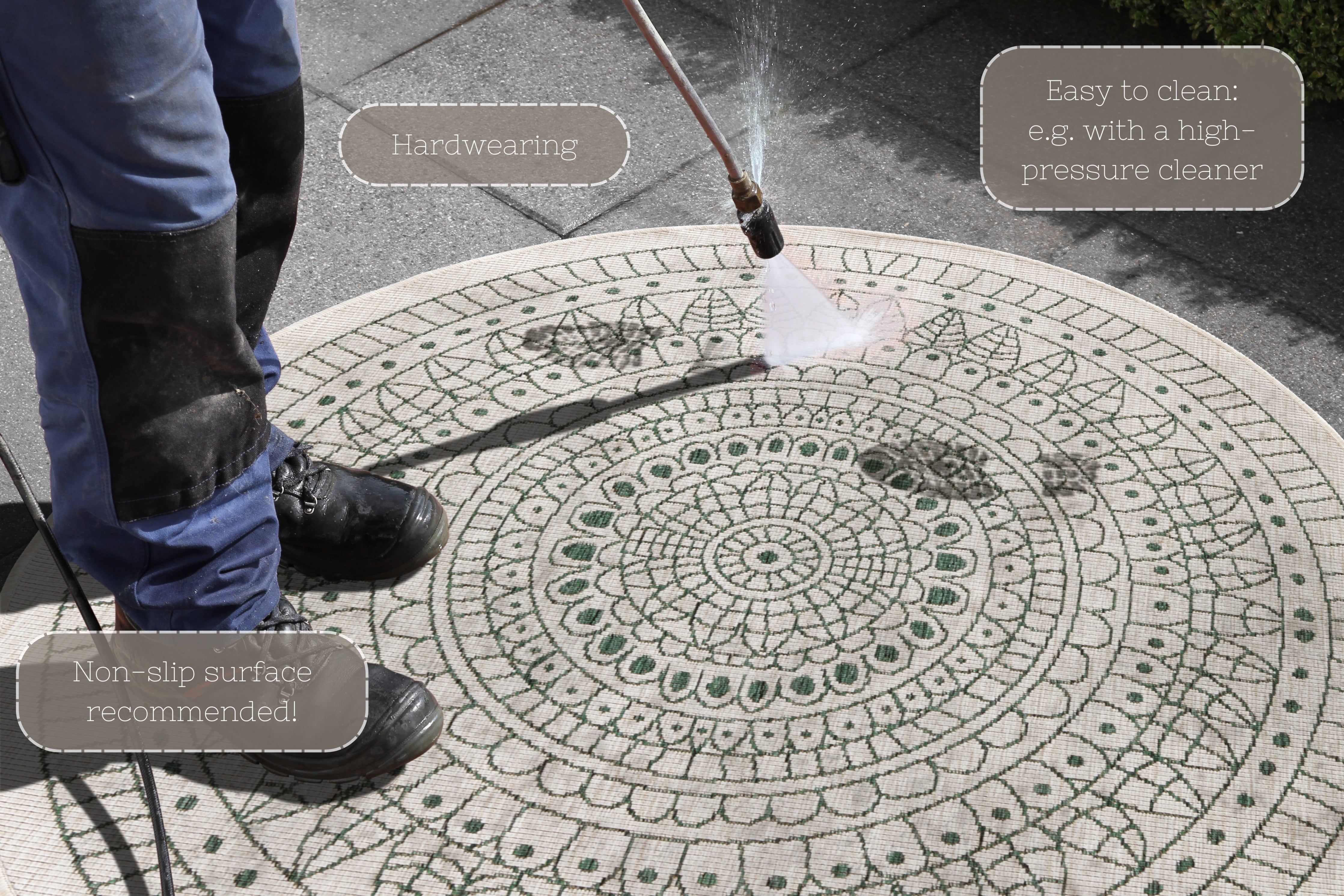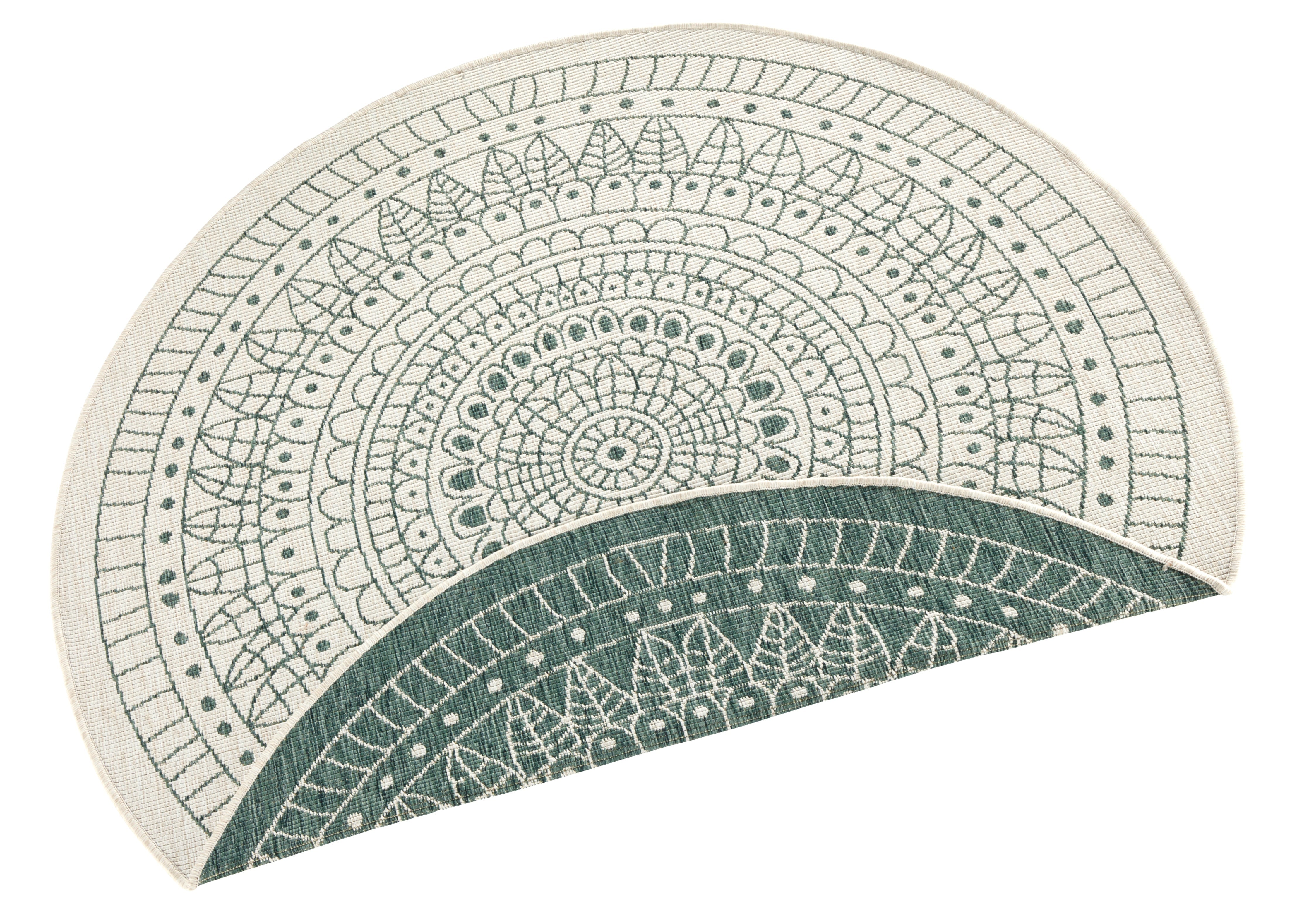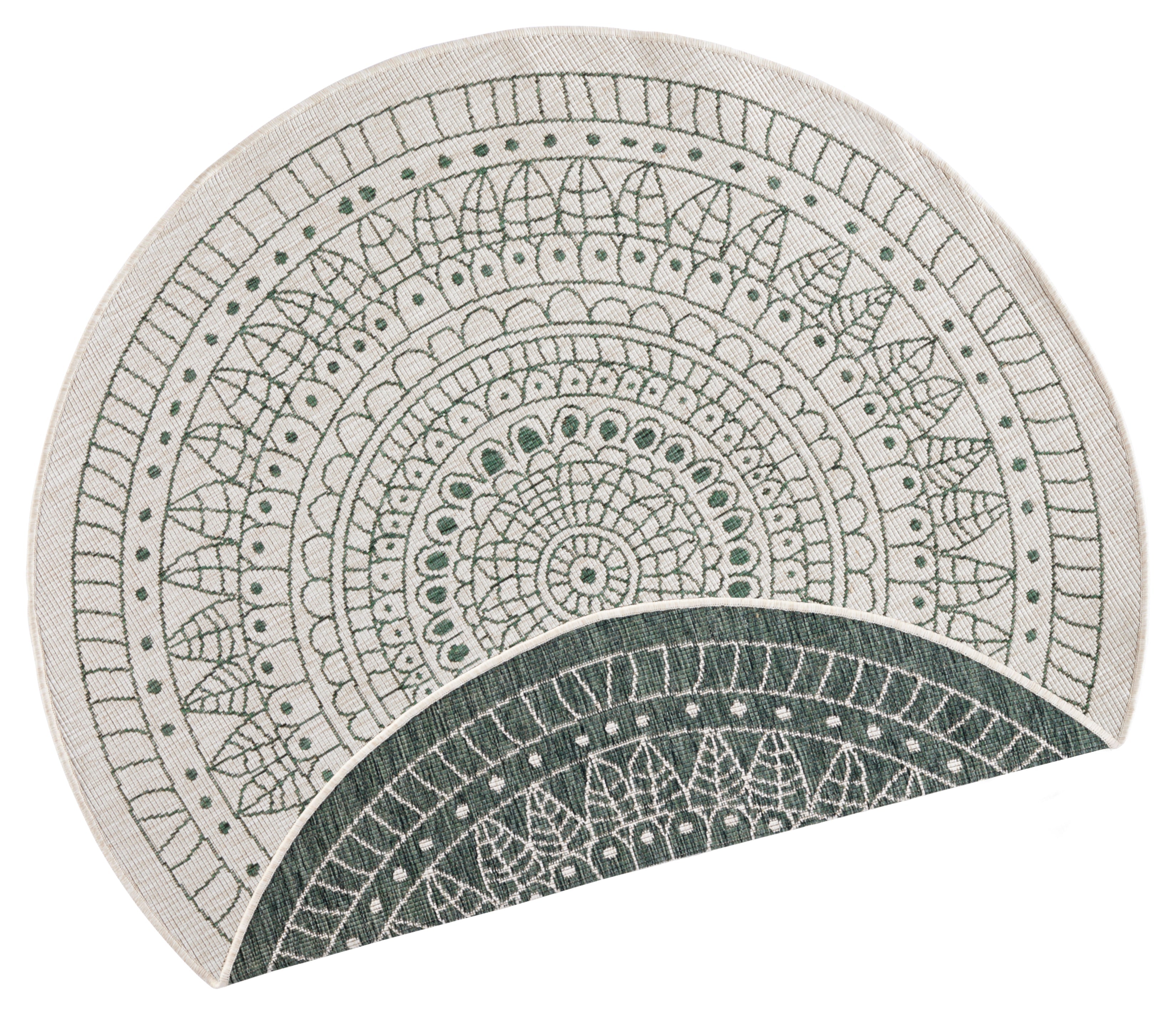 Tilføj et strejf af boheme-chic til dit hjem med Twin-tæppet i en frisk grøn/hvid farvekombination. Dette runde tæppe, fremstillet af 100% slidstærkt polypropylen, skaber en let og luftig atmosfære, uanset om det placeres indendørs eller udendørs.