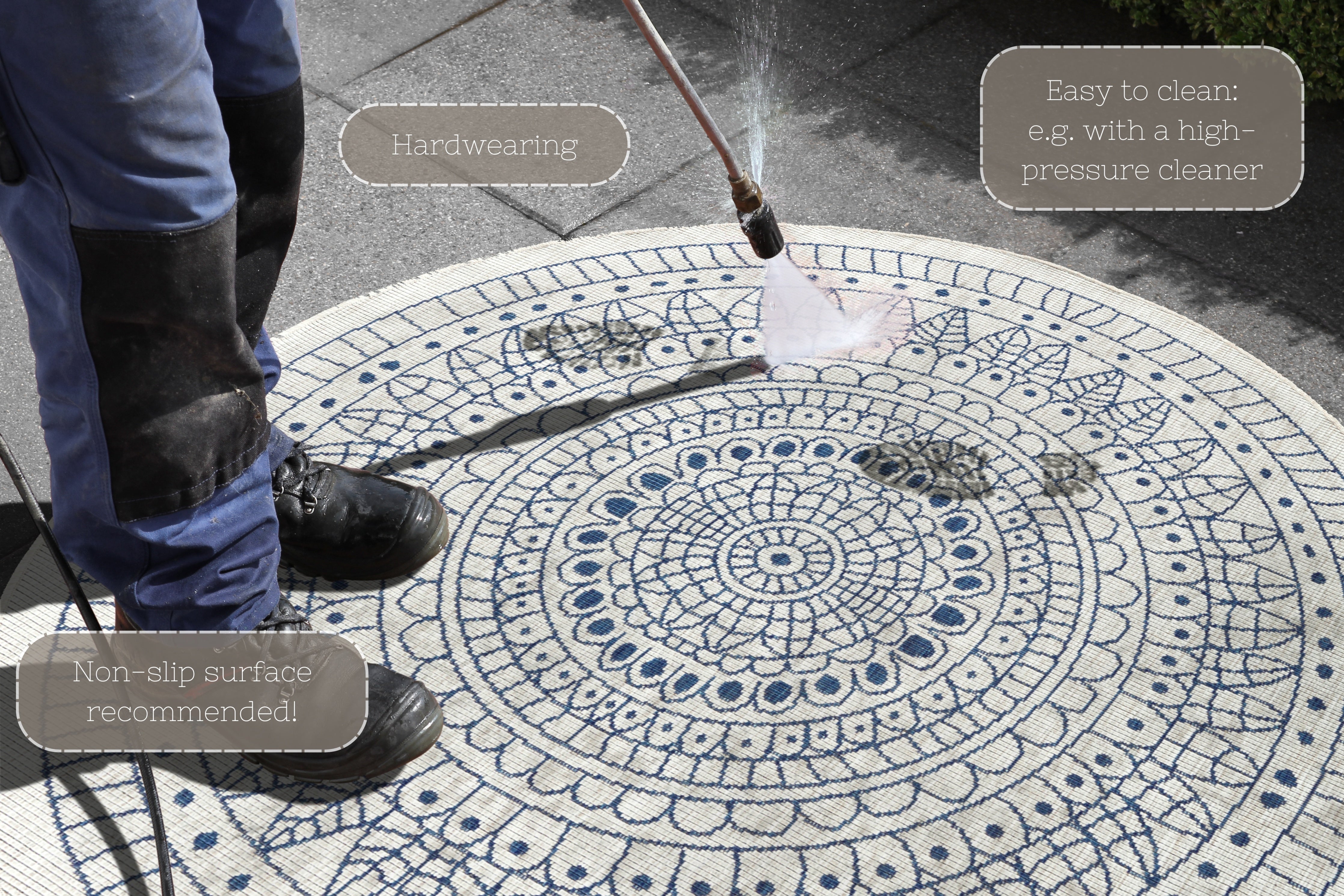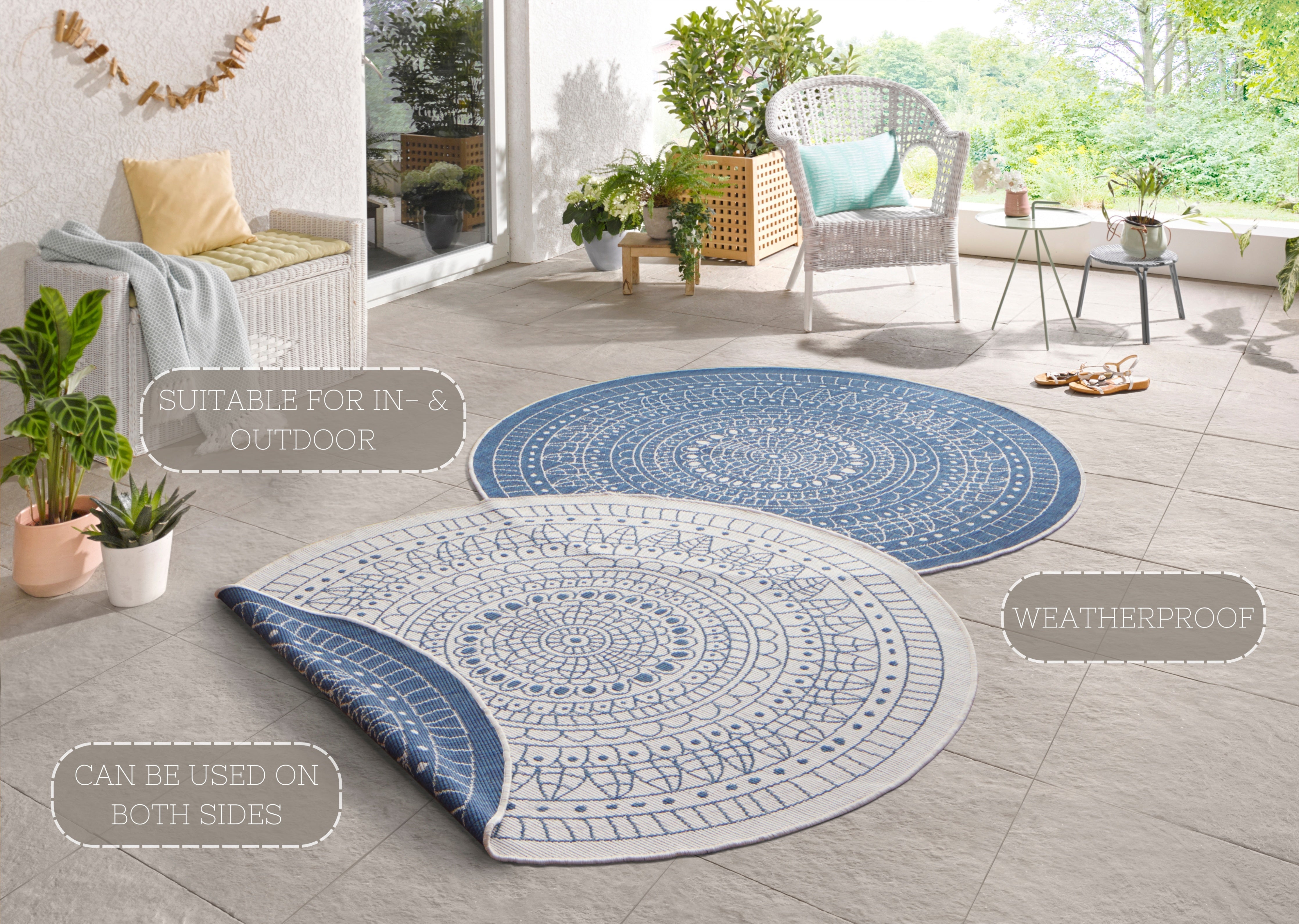 Twin tæppets moderne mandala-design skaber en rolig og harmonisk atmosfære. Den reversible funktion giver dig to forskellige udtryk at vælge imellem, mens den robuste polypropylen bagside sikrer stabilitet og lang holdbarhed. Tæppet er vejrbestandigt og nemt at rengøre, hvilket gør det perfekt til både stue, terrasse eller altan. Det er desuden egnet til alle gulvtyper, inklusive gulvvarme.