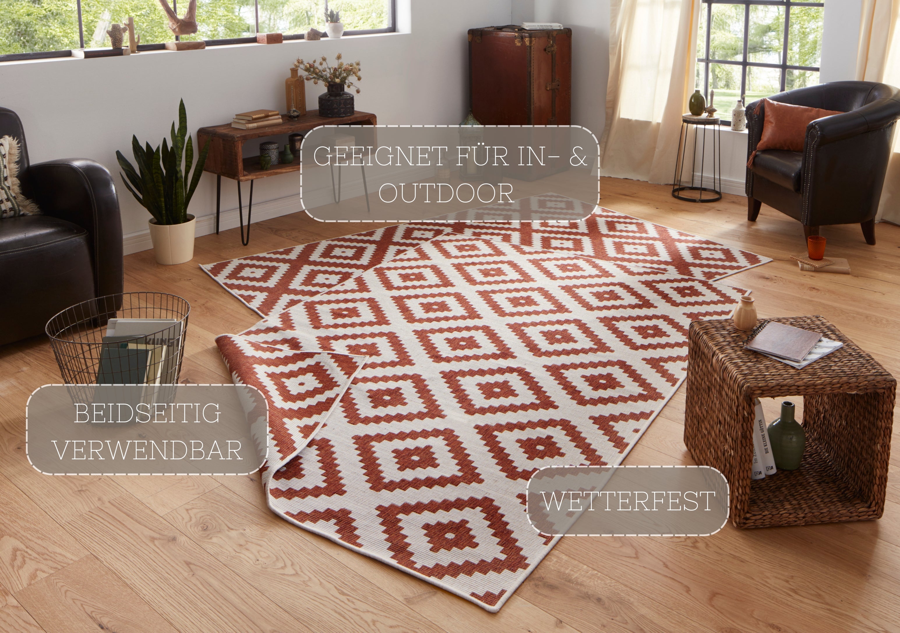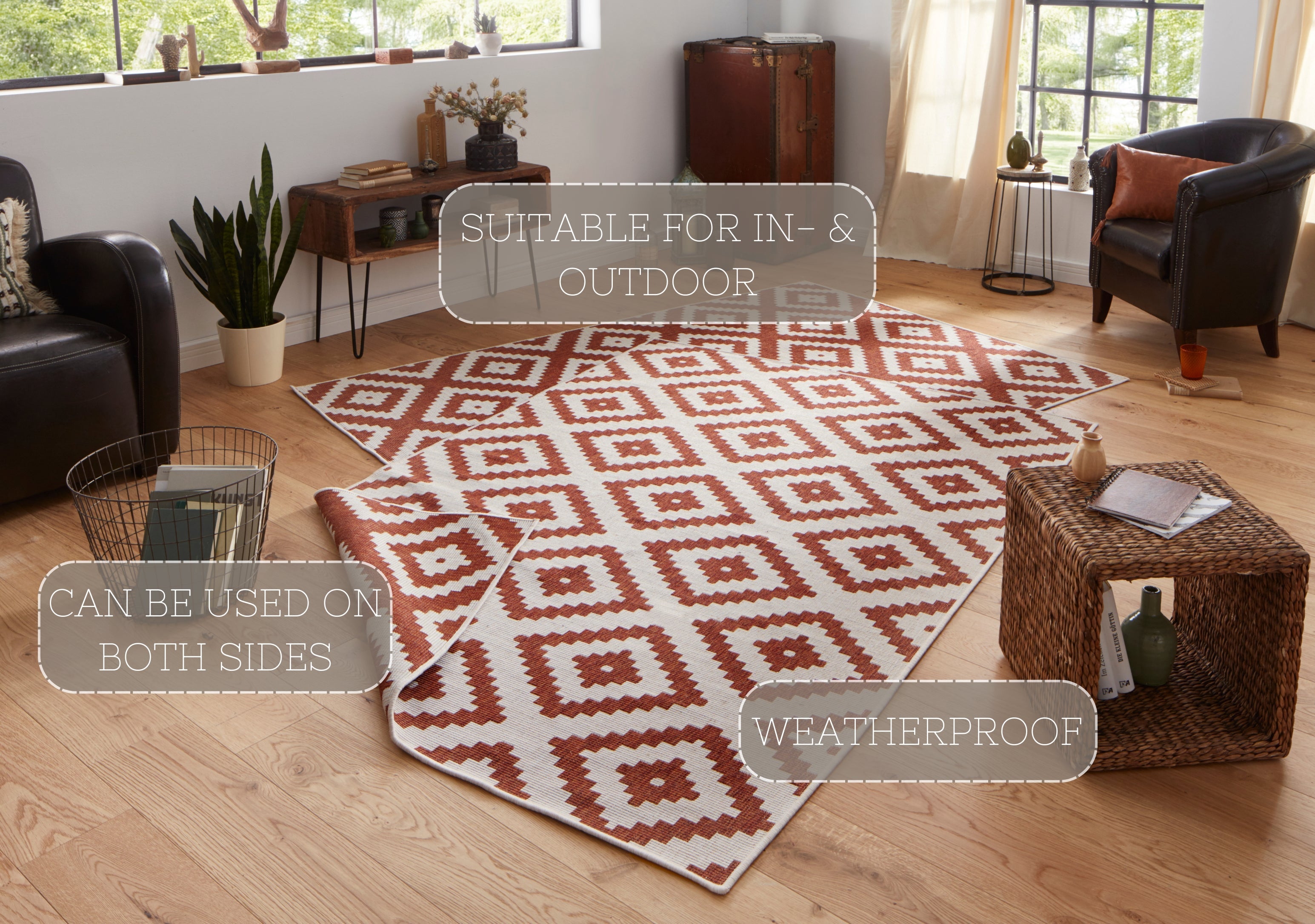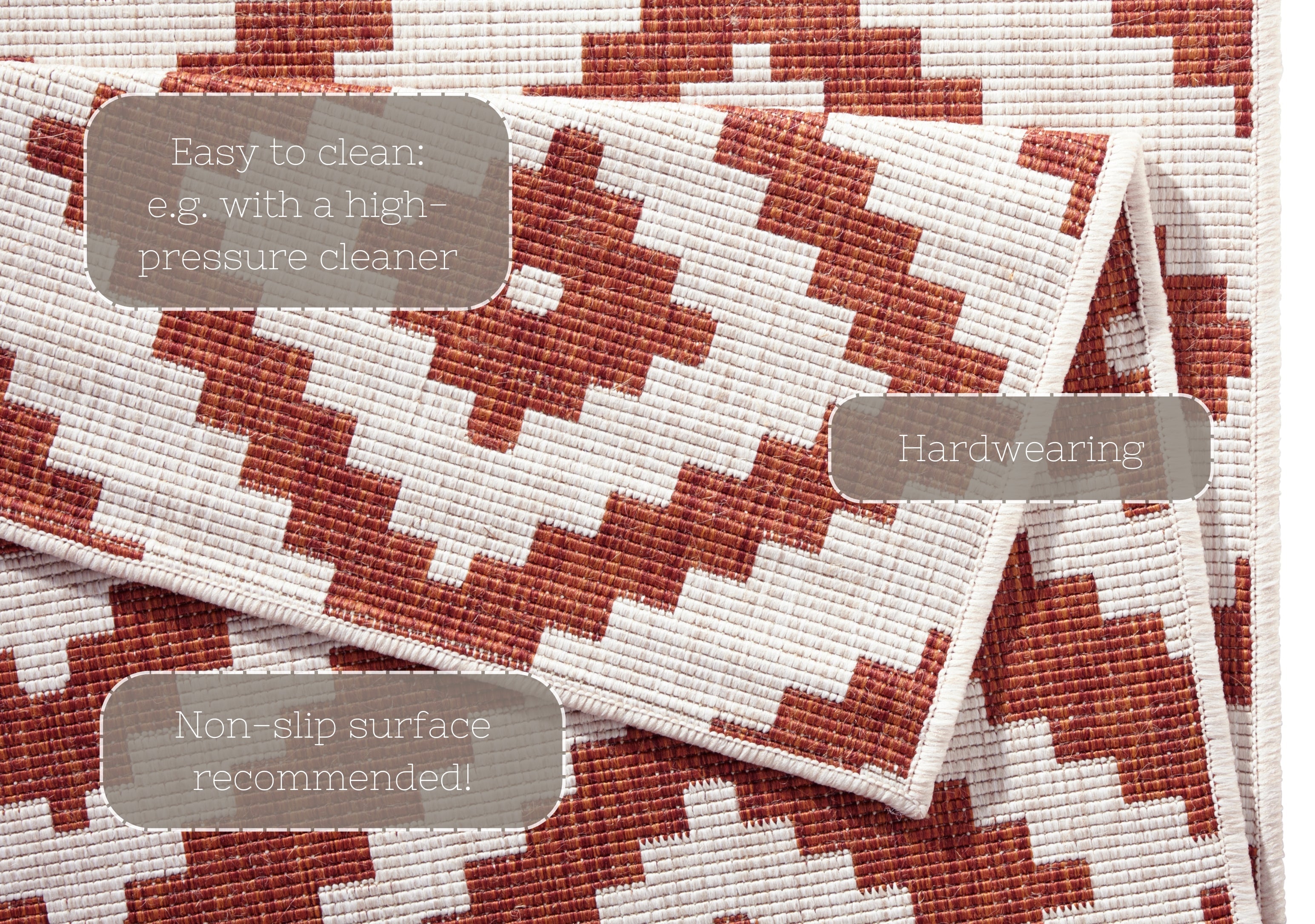 Twin tæppets geometriske design er ikke kun et blikfang, men også utroligt praktisk. Det vendbare design giver dig to forskellige looks i ét tæppe, mens den robuste polypropylen-bagside sikrer stabilitet og forlænger tæppets levetid. Tæppet er velegnet til alle gulvtyper, inklusive gulvvarme, og dets slidstærke materiale gør det modstandsdygtigt over for vind og vejr. Spild er ingen katastrofe – du kan nemt fjerne pletter med en fugtig klud.
