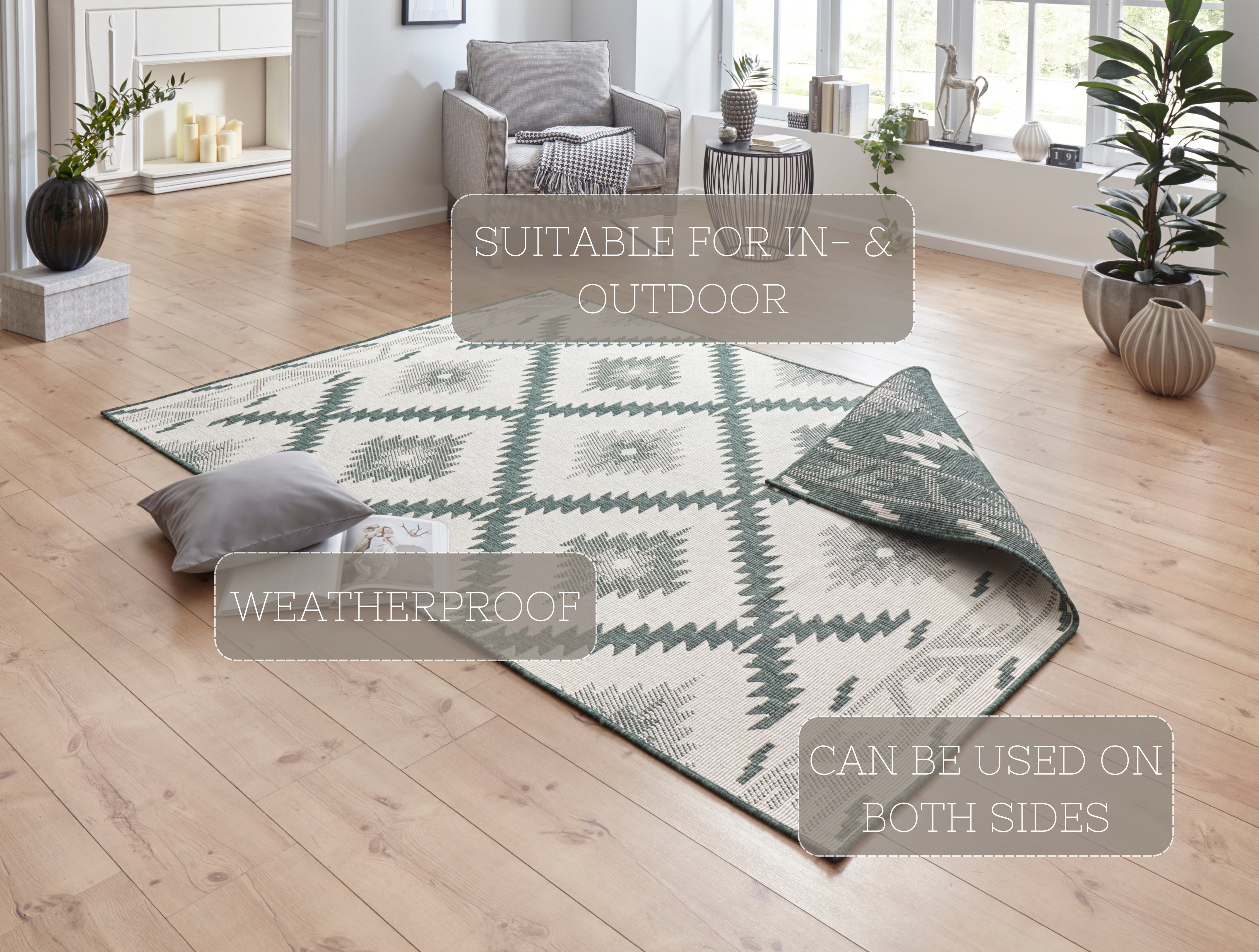Twin Supreme tæppet er en sand all-rounder. Det vendbare design giver dig to forskellige looks i ét, så du nemt kan forny din indretning. Det geometriske mønster tilføjer et moderne touch, samtidig med at det er nemt at rengøre – perfekt til et aktivt hjem. Tæppet er vejrbestandigt og egner sig derfor til både terrasse, altan og indendørs brug. Den robuste polypropylen bagside sikrer stabilitet og forhindrer tæppet i at glide. Tæppet er desuden egnet til gulvvarme, så du kan nyde komforten året rundt.