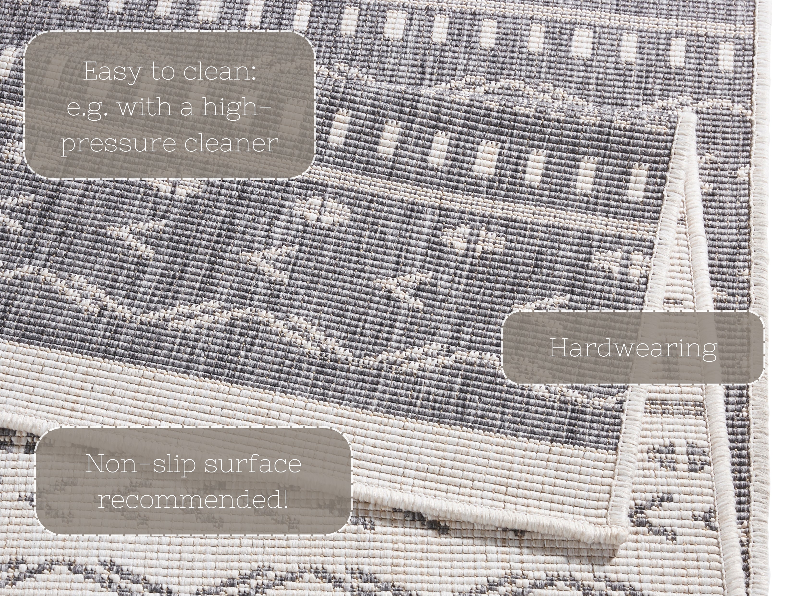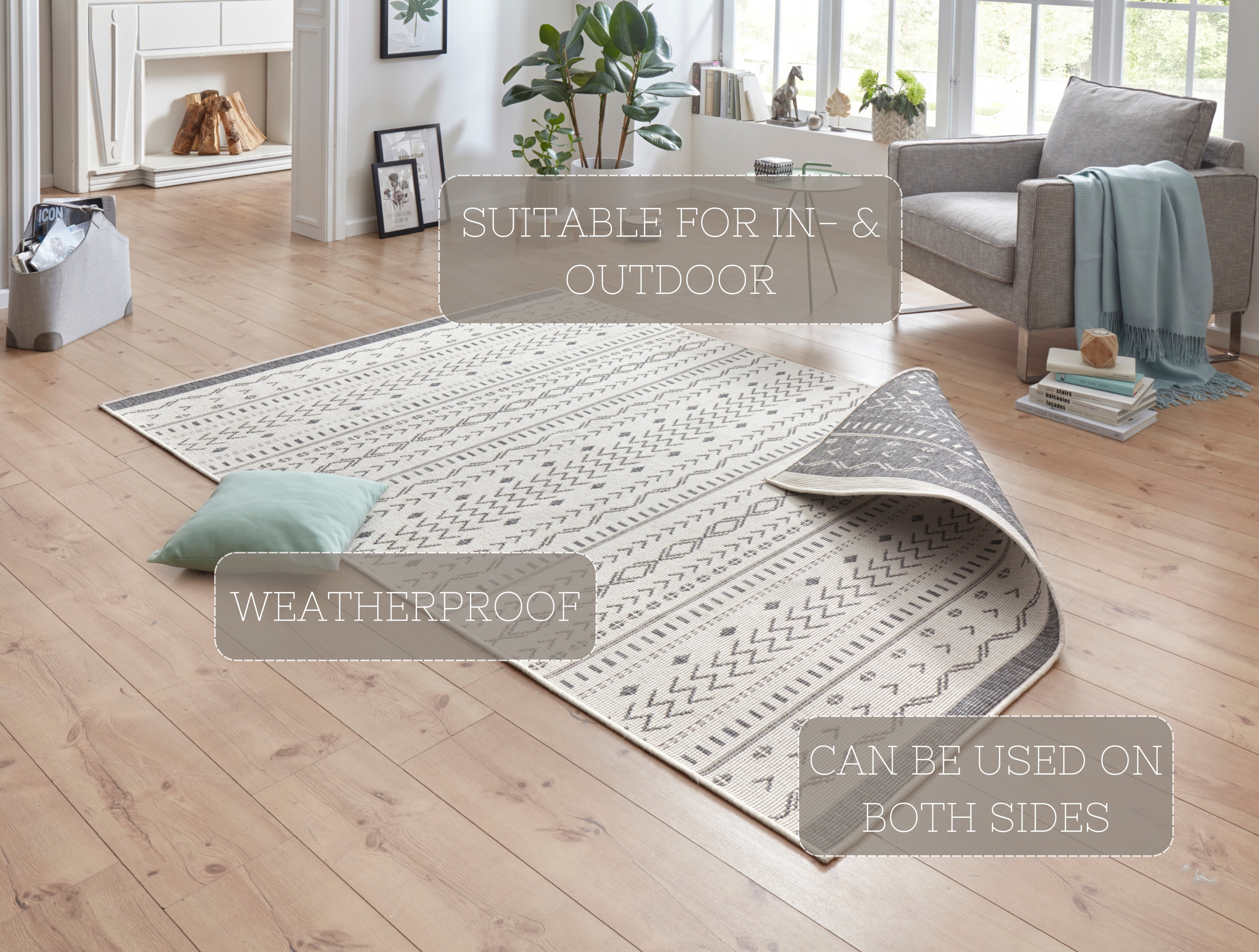 Twin Supreme tæppets vendbare design giver dig to forskellige looks i ét, så du nemt kan opfriske din indretning. Det skandinaviskinspirerede boho-mønster tilføjer et strejf af nordisk charme til ethvert rum, mens den robuste polypropylen bagside sikrer stabilitet og forhindrer tæppet i at glide. Tæppet er vejrbestandigt og egnet til alle gulvtyper, inklusive gulvvarme, hvilket gør det til en sand all-rounder. Den praktiske konstruktion i polypropylen gør det desuden utrolig nemt at rengøre.