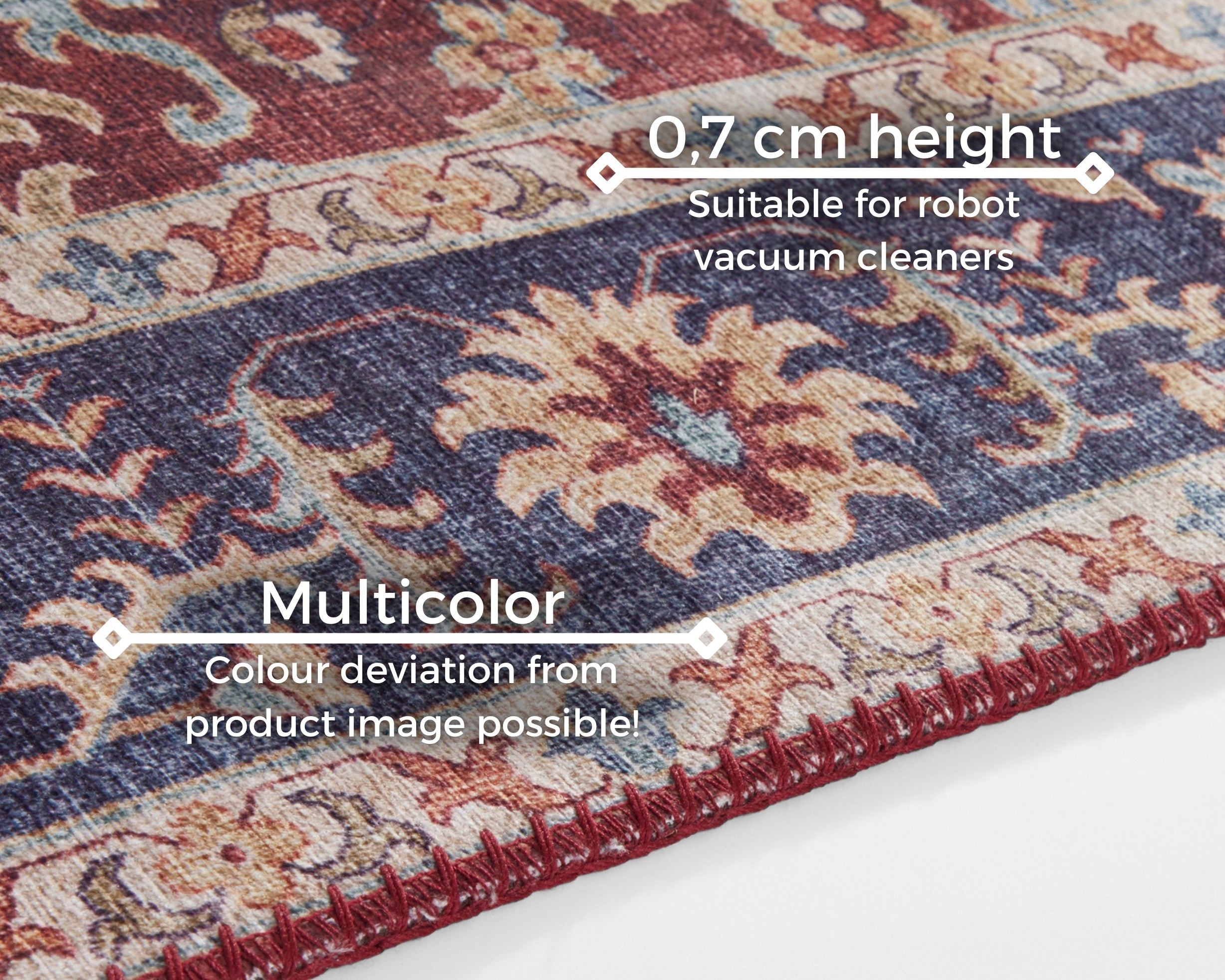 Asmar-tæppet er mere end bare smukt; det er også praktisk. Den bløde, fladvævede konstruktion er nem at vedligeholde og passer perfekt til alle gulvtyper, inklusive gulvvarme. Bagsiden i bomuld giver et stabilt underlag og sikrer, at tæppet ligger sikkert på plads, mens den lave luvhøjde på 0,5 mm bidrager til en behagelig følelse under fødderne. Den detaljerede orientalske design er et ægte blikfang, der vil tilføje karakter og stil til din indretning.