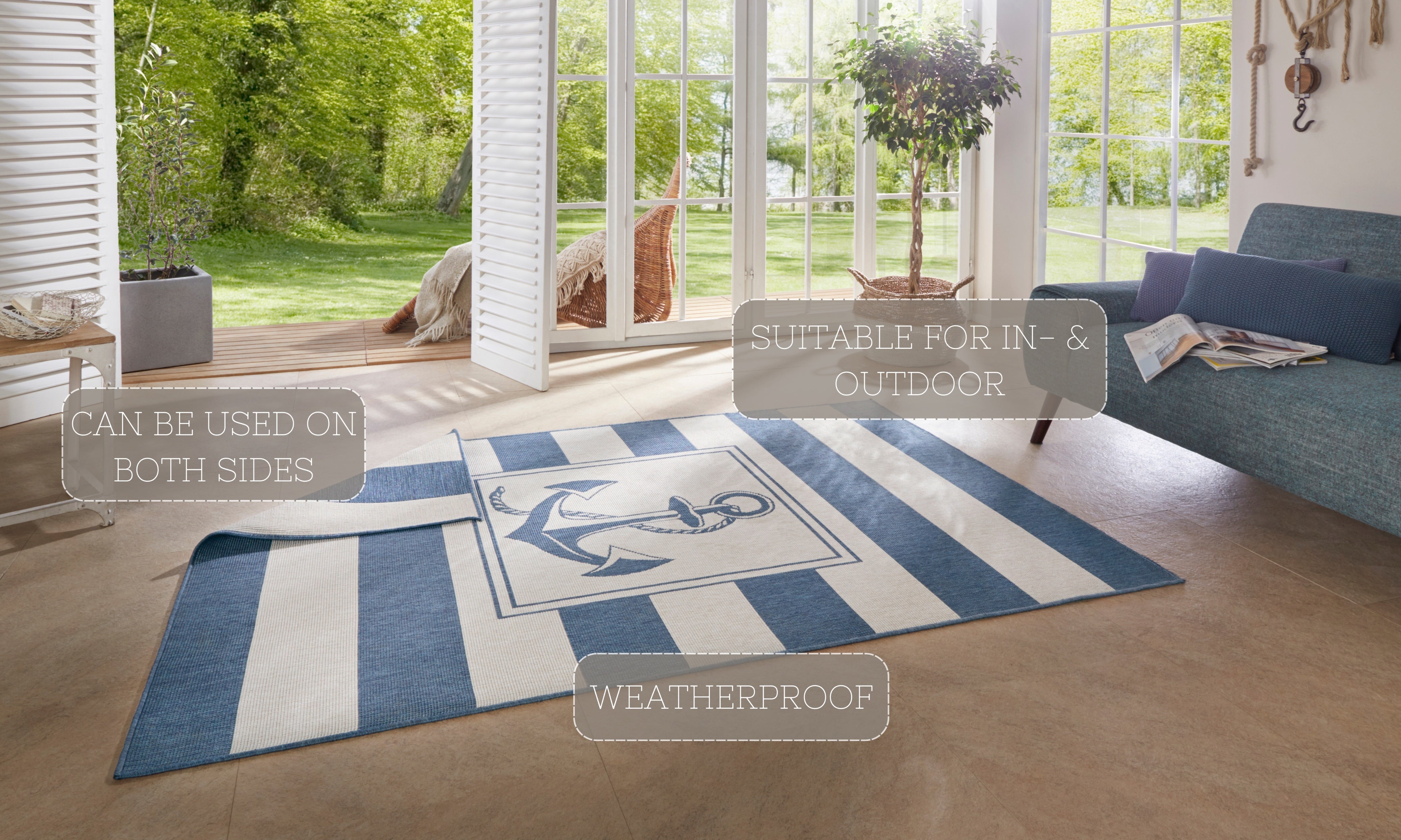 Twin Supreme er en sand all-rounder, der er lige velegnet til indendørs og udendørs brug takket være dets vejrbestandige design. Det vendbare design giver dig to forskellige udtryk at vælge imellem, mens det nautiske mønster tilføjer et strejf af maritim charme til din indretning. Tæppet er nemt at rengøre og passer til alle gulvtyper, inklusive gulvvarme. Den robuste polypropylen bagside sikrer stabilitet og forlænger tæppets levetid.