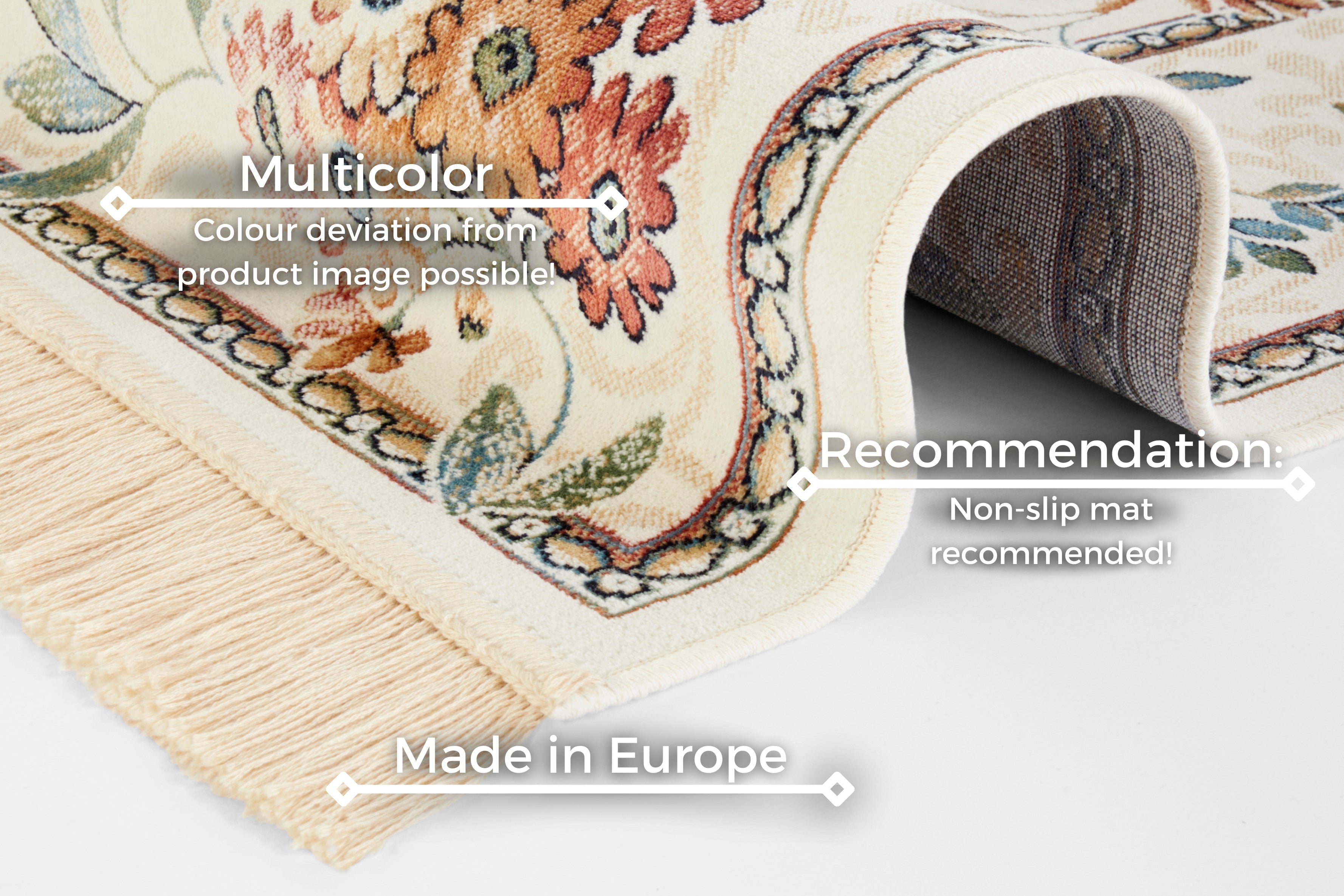 Naveh-tæppet er ikke kun smukt, men også praktisk. Den bløde, korte luv på 0.5 mm er behagelig under fødderne og nem at rengøre. Bagsiden i ren bomuld giver tæppet stabilitet og beskytter dit gulv. Tæppet er tyndt og velegnet til alle gulvtyper, inklusive gulvvarme. De fine frynser fuldender det klassiske design og tilføjer et strejf af elegance. Bemærk venligst, at der kan forekomme mindre farvevariationer.