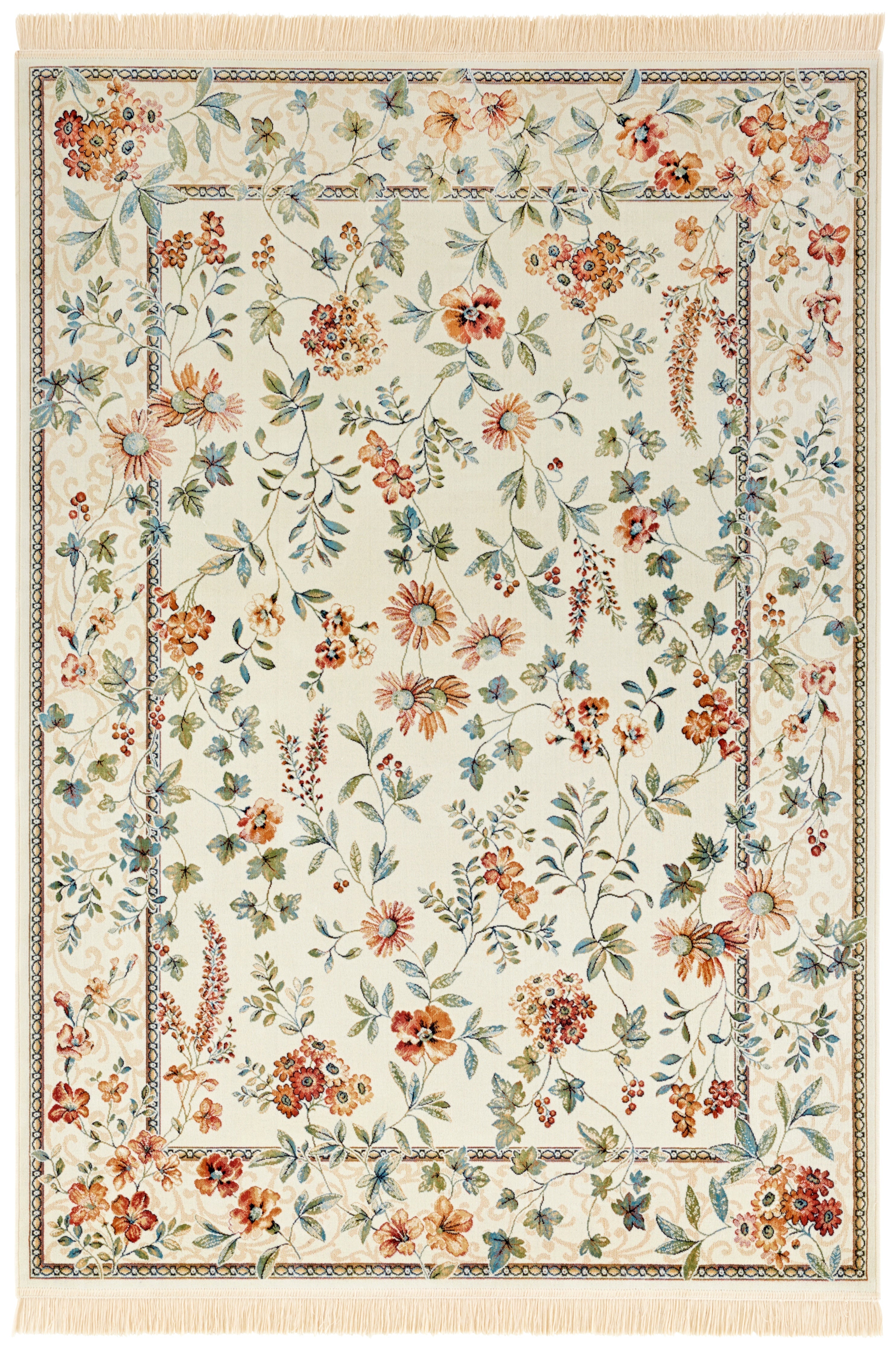 Forkæl dit hjem med den elegante Naveh - 104376 Creme fra Hanse Home. Dette smukke tæppe, vævet i en blød blanding af 60% viskose og 40% bomuld, tilføjer et strejf af klassisk orientalsk charme til ethvert rum med sit florale mønster. Den cremede farve skaber en rolig og indbydende atmosfære.