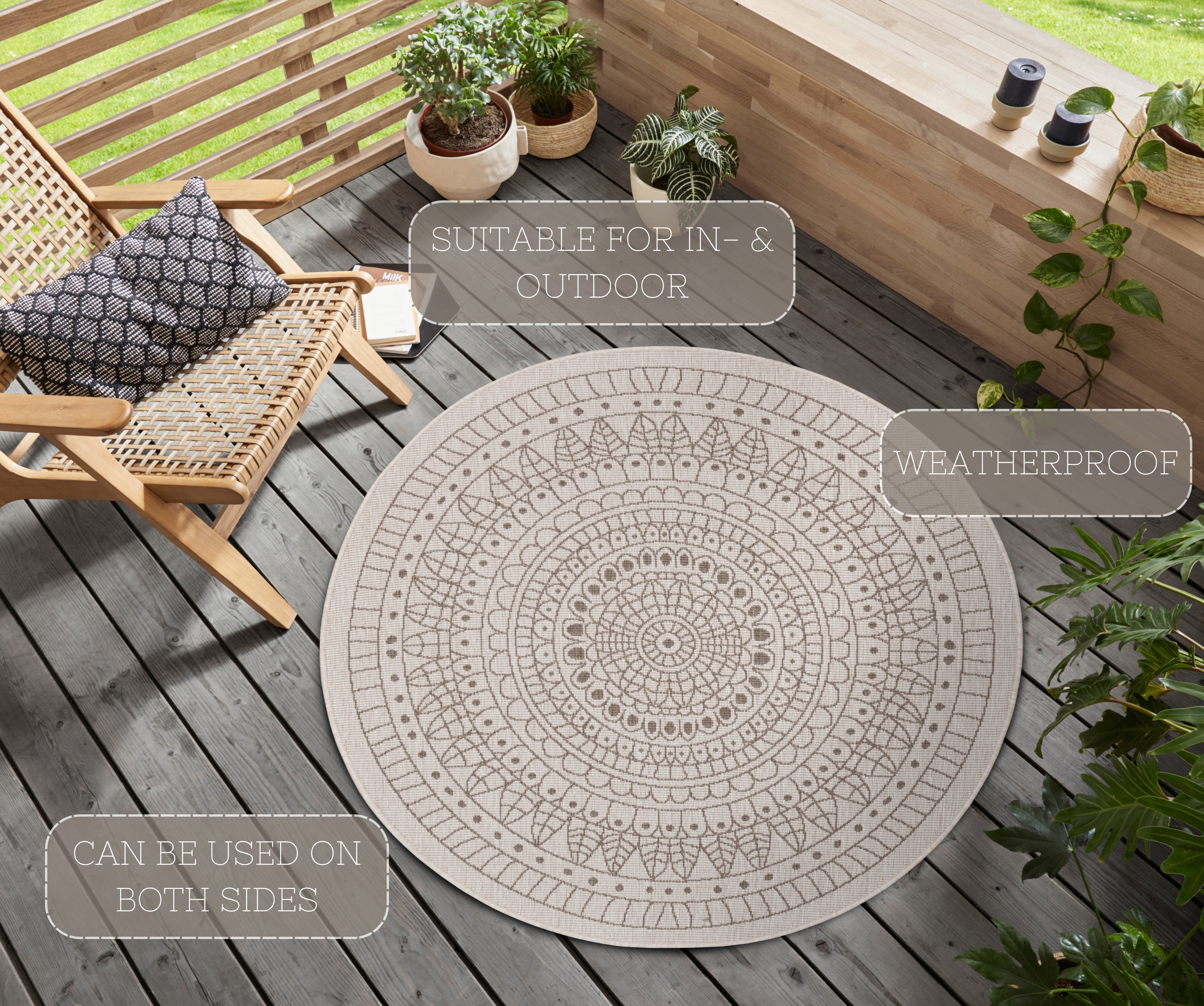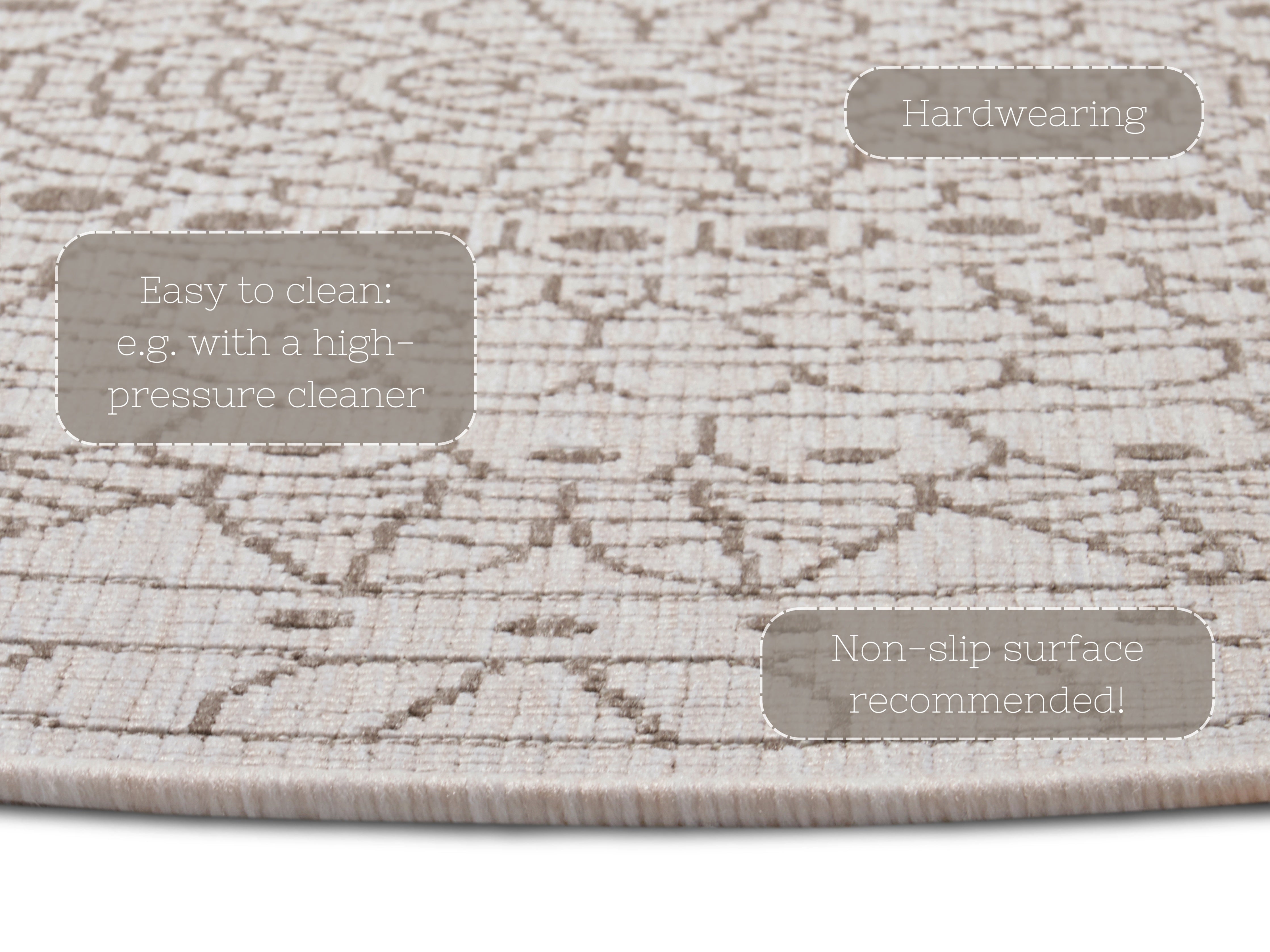 Twin tæppets moderne mandala-design er ikke kun et blikfang, men også utroligt praktisk. Det vendbare design giver dig to forskellige looks i ét tæppe, mens den robuste polypropylen bagside sikrer stabilitet og forlænger tæppets levetid. Tæppet er velegnet til alle gulvtyper, inklusive gulvvarme, og er derfor en ægte all-rounder. Det er nemt at rengøre – pletter fjernes let med en fugtig klud, hvilket gør det ideelt til travle hverdage.