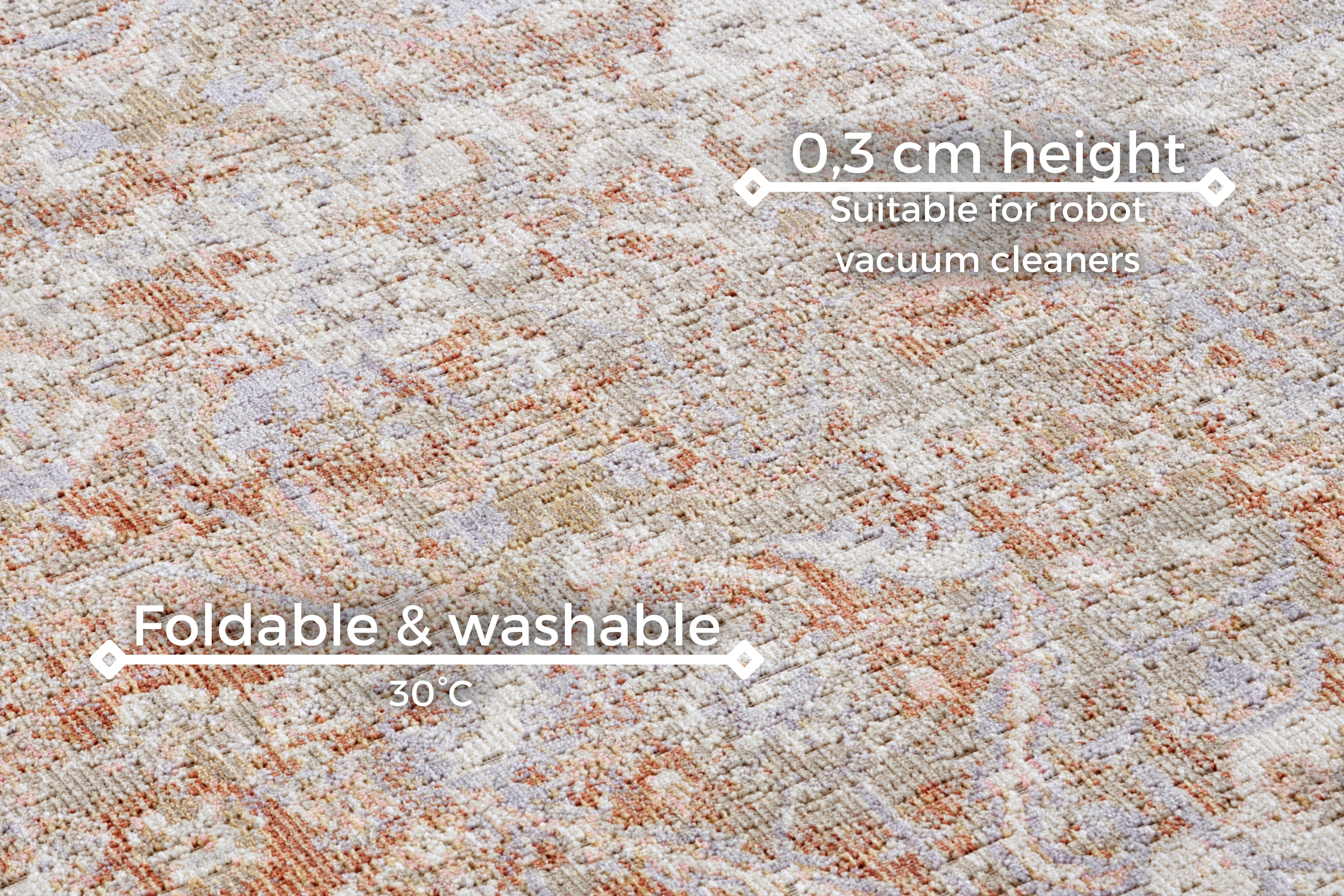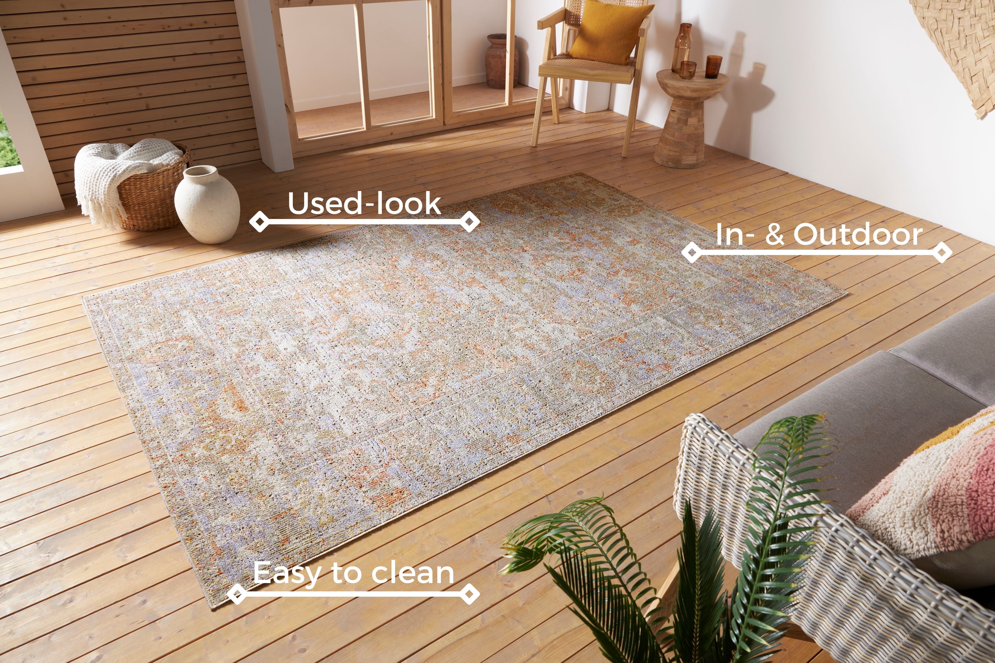 Cairo-tæppet er en sand allrounder. Det er vejrbestandigt og UV-beskyttet, hvilket gør det ideelt til både indendørs og udendørs brug. Den robuste polypropylen bagside sikrer stabilitet og forlænger tæppets levetid. Tæppet er desuden egnet til gulvvarme, så du kan nyde komforten året rundt. Og skulle uheldet være ude, kan Cairo-tæppet nemt vaskes skånsomt ved 30 grader – en sjælden luksus for et tæppe af denne kaliber.
