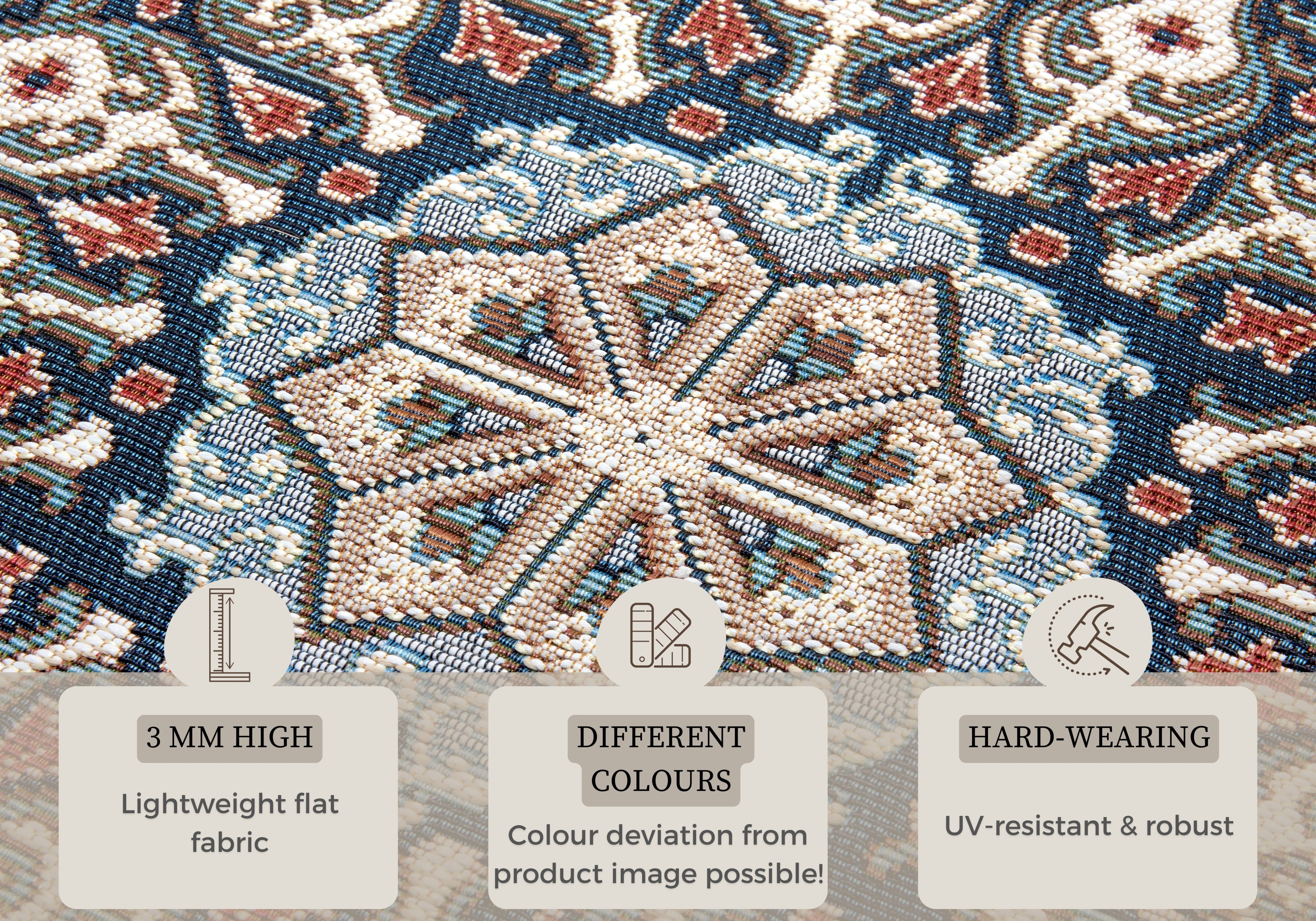 Flair tæppets fladvævede struktur giver det et moderne og elegant udtryk, samtidig med at det er utroligt praktisk. Den robuste konstruktion, kombineret med 77% polypropylen BCF, sikrer at tæppet kan modstå vind og vejr. Den latexbelagte bagside (100% latex) gør tæppet skridsikkert og beskytter underlaget mod slid. Den stilrene borderkant giver tæppet et flot finish og bidrager til dets holdbarhed. Uanset om du placerer det i stuen, på terrassen eller i haven, tilføjer Flair tæppet et strejf af elegance og komfort.
