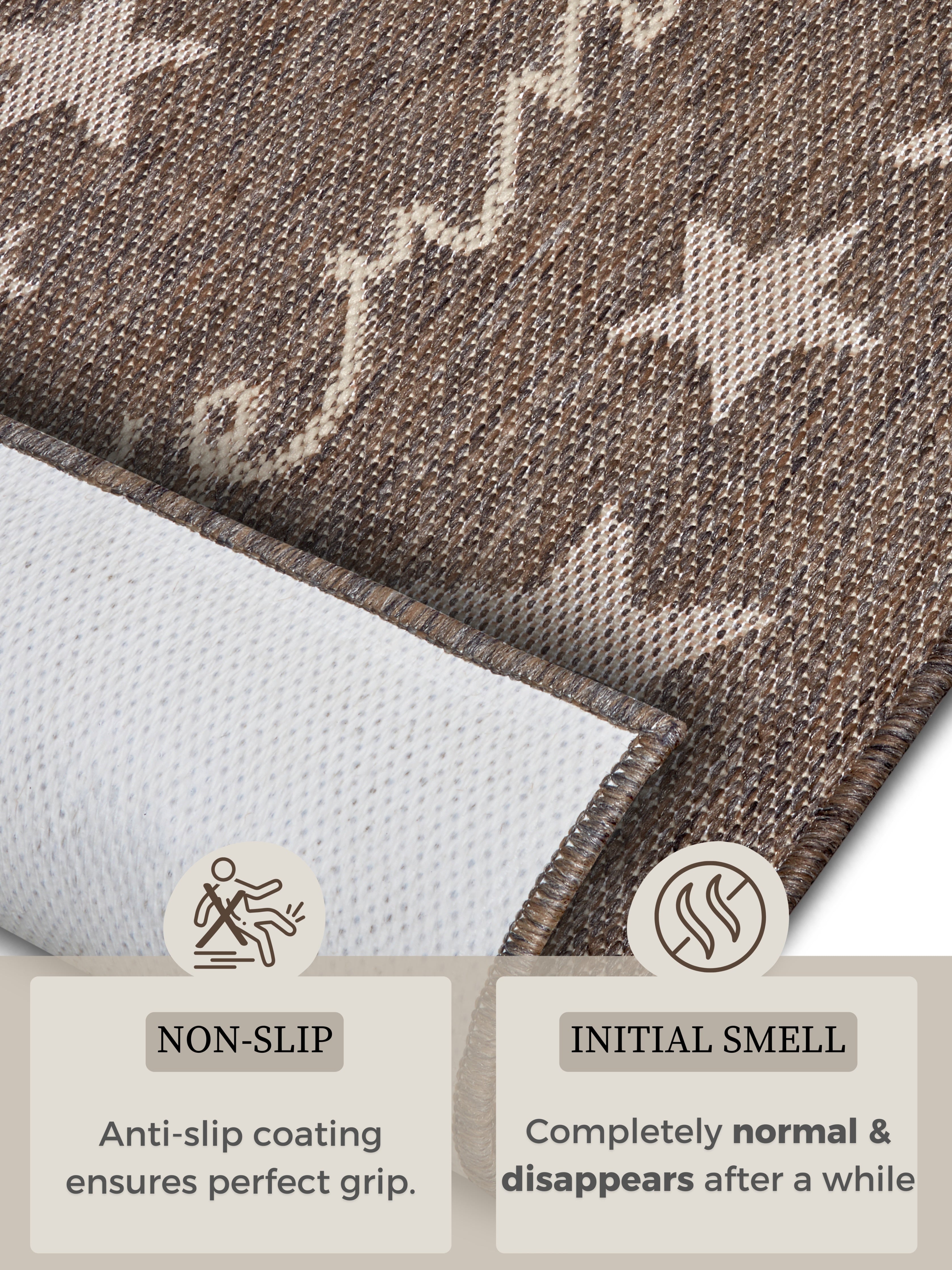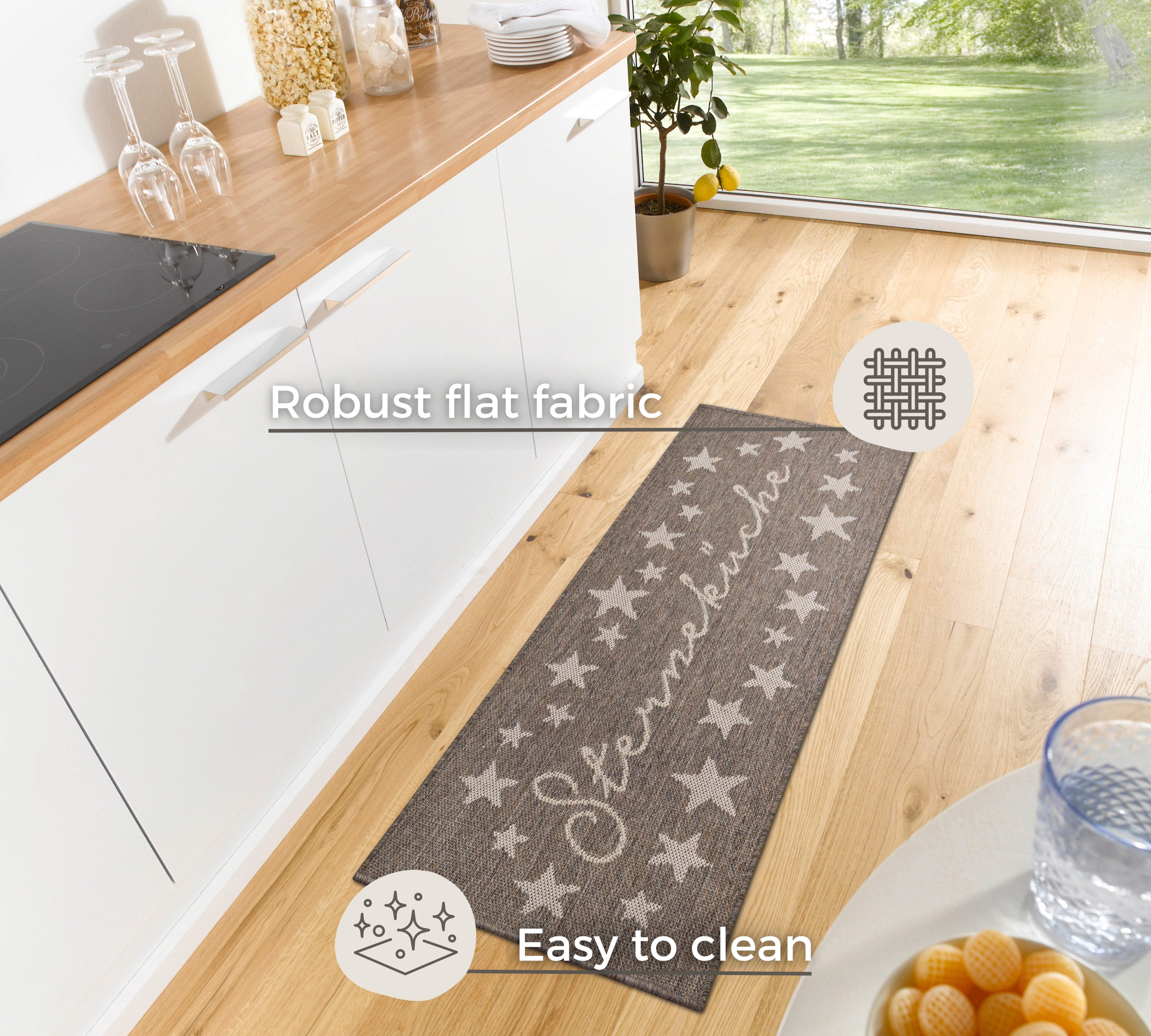 Cucina-tæppet er ikke kun smukt, det er også designet til at holde. Den robuste konstruktion i polypropylen sikrer lang holdbarhed og gør tæppet nemt at rengøre. Bagsiden i 100% latex giver et sikkert greb på alle gulvtyper, inklusive gulvvarme, så du kan nyde tæppets komfort uden at bekymre dig om, at det skrider. Det moderne, skridsikre design passer perfekt ind i enhver indretningsstil og sætter et unikt præg på dit køkken. Tæppet er et moderne tilbehør, der kan kombineres på utallige måder med forskellige møbelstile.