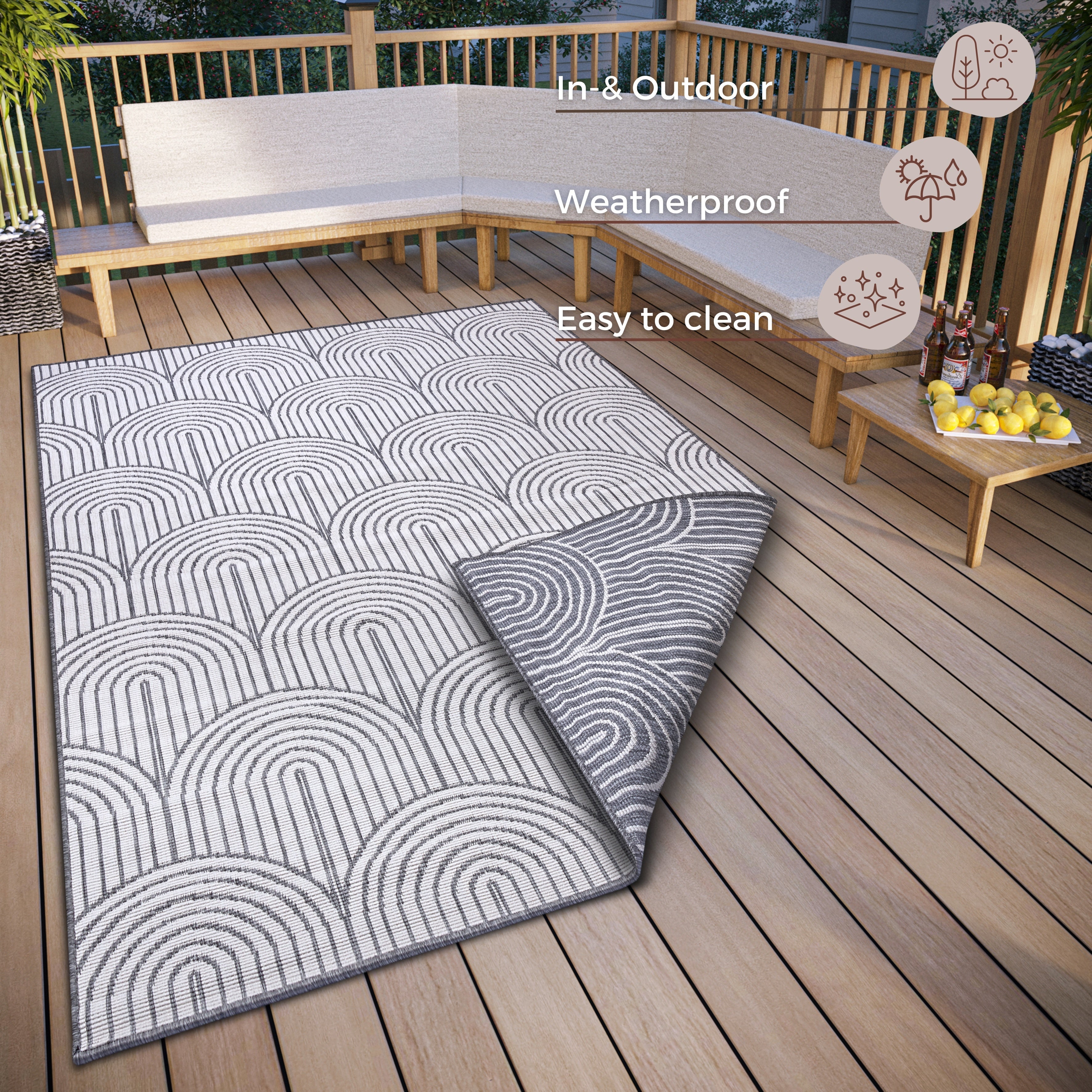 Pangli tæppet er designet til at modstå vind og vejr. Det holdbare polypropylen materiale er både vandafvisende og UV-bestandigt, hvilket sikrer, at farven forbliver intens og smuk, selv efter lang tids brug og udsættelse for sollys. Tæppets praktiske egenskaber gør det nemt at rengøre – skyl det blot med vand eller brug en mild sæbeopløsning for at holde det friskt og pænt. Den alsidige stil passer perfekt til både haven, terrassen og stuen, og tilføjer et strejf af boho-chic og skandinavisk elegance til ethvert rum. Bagsiden er også fremstillet af 100% polypropylen, hvilket bidrager til tæppets holdbarhed og stabilitet.
