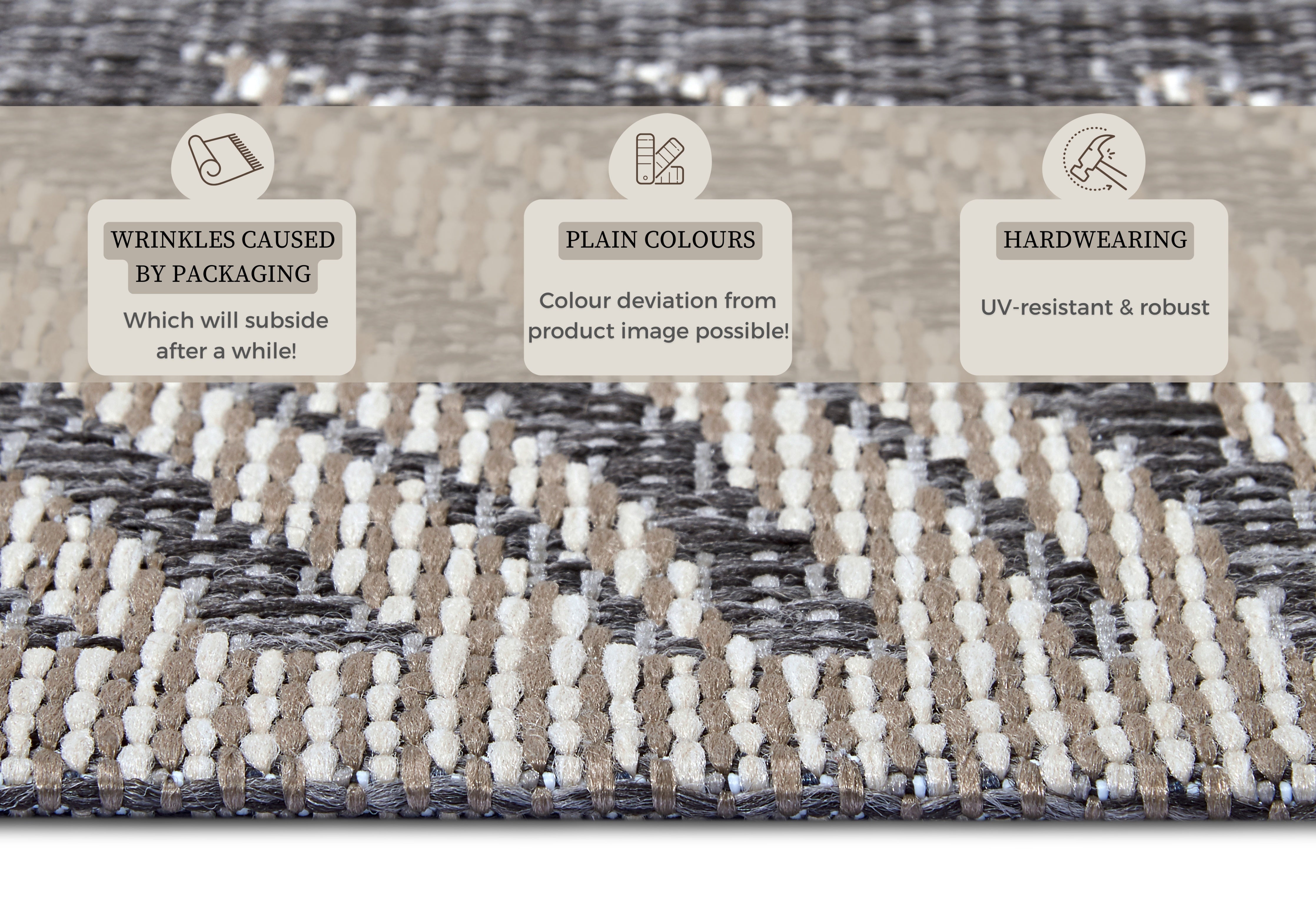 Vær opmærksom på, at nye tæpper kan have en midlertidig lugt ved udpakning, som stammer fra produktionen og indpakningen. Dette er normalt og aftager typisk inden for 1–2 uger efter udpakning, især ved god udluftning. Denne lugt betragtes ikke som en produktfejl.