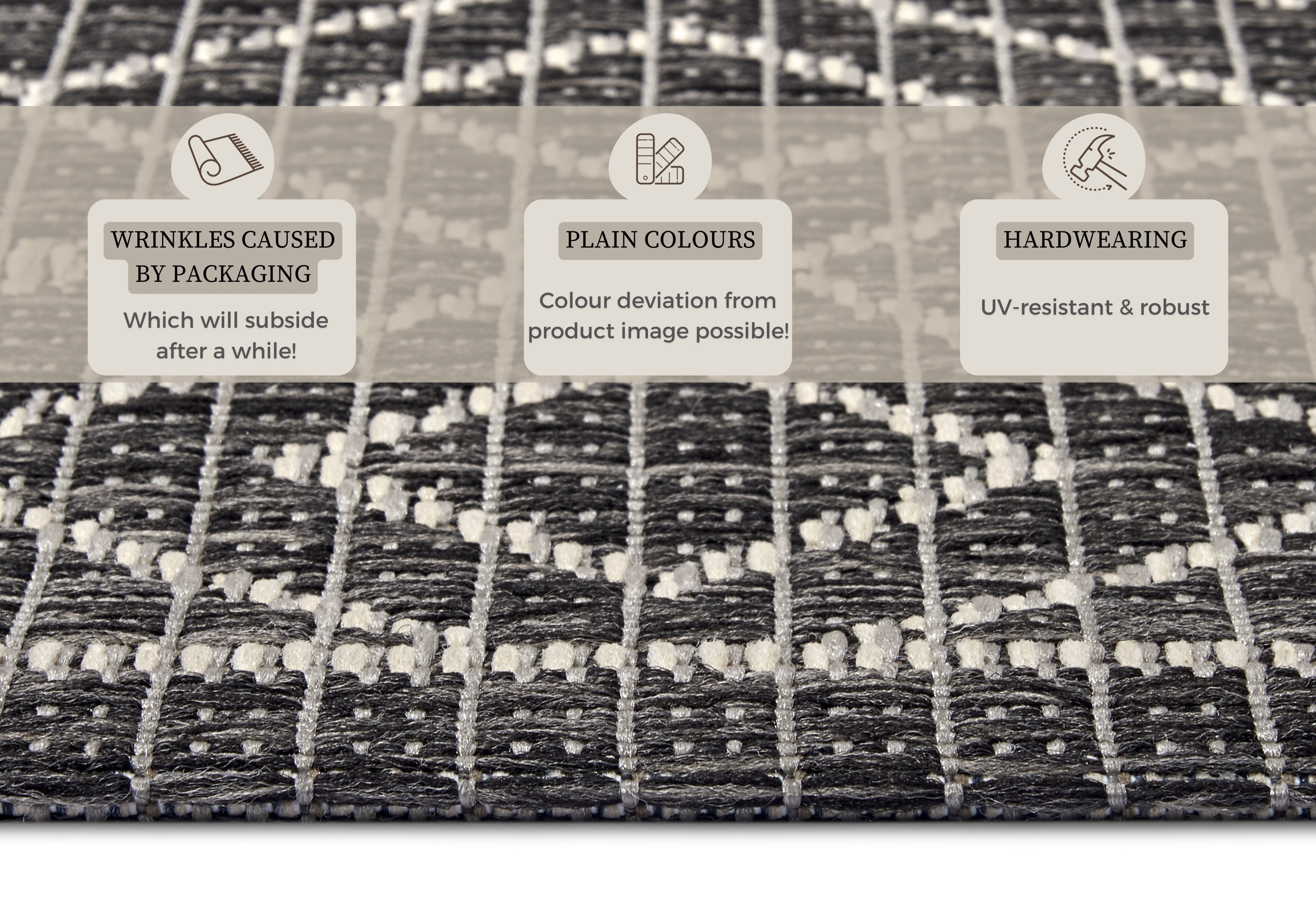 Vær opmærksom på, at nye tæpper kan have en midlertidig lugt ved udpakning, som stammer fra produktionen og indpakningen. Dette er normalt og aftager typisk inden for 1–2 uger efter udpakning, især ved god udluftning. Denne lugt betragtes ikke som en produktfejl.