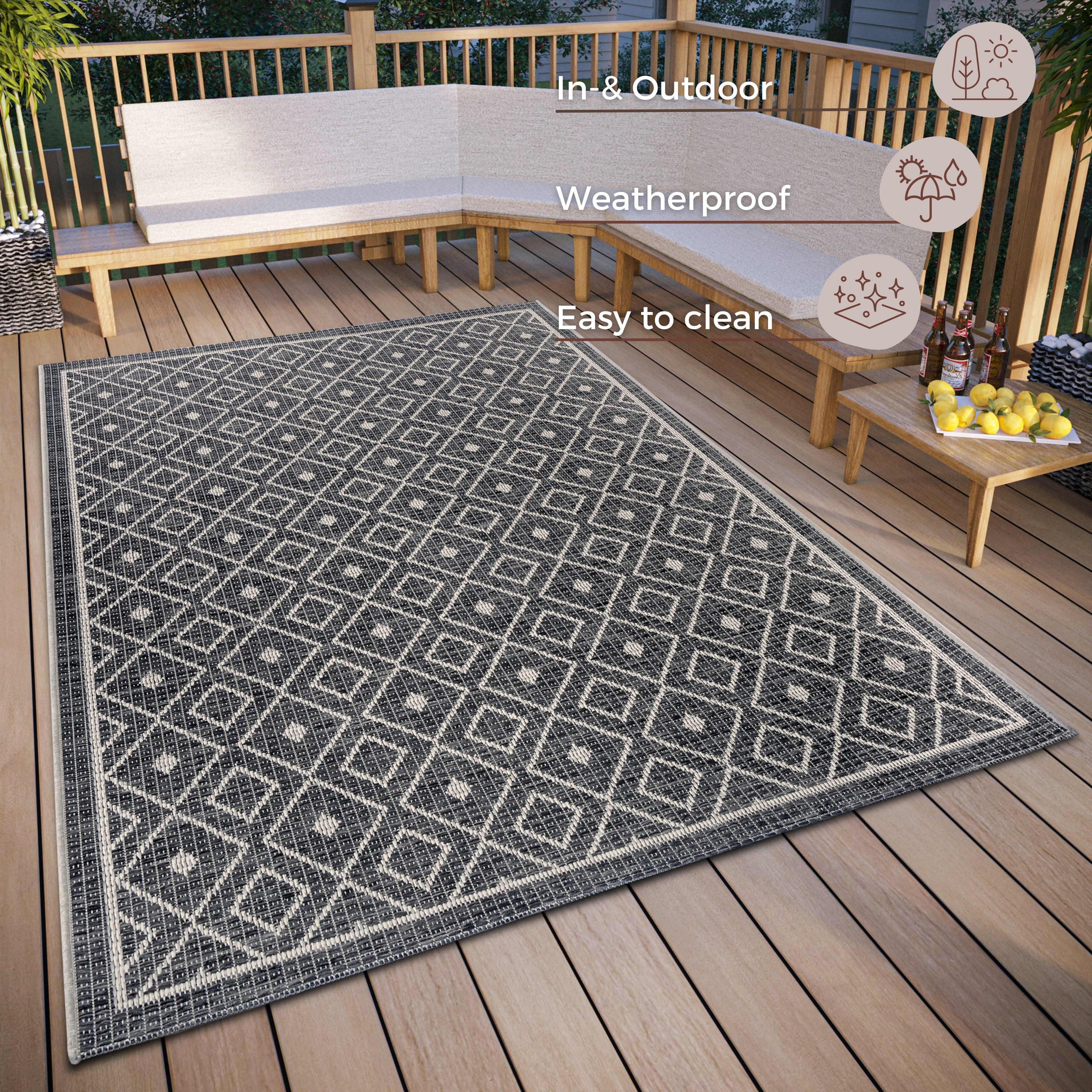 Skab en stilfuld og praktisk overgang mellem inde og ude med Clyde-tæppet fra Hanse Home. Dette slidstærke tæppe i 100% polypropylen er designet til at modstå vind og vejr og tilføjer et strejf af elegance til din terrasse, altan eller have i en smuk grå/beige farvekombination.