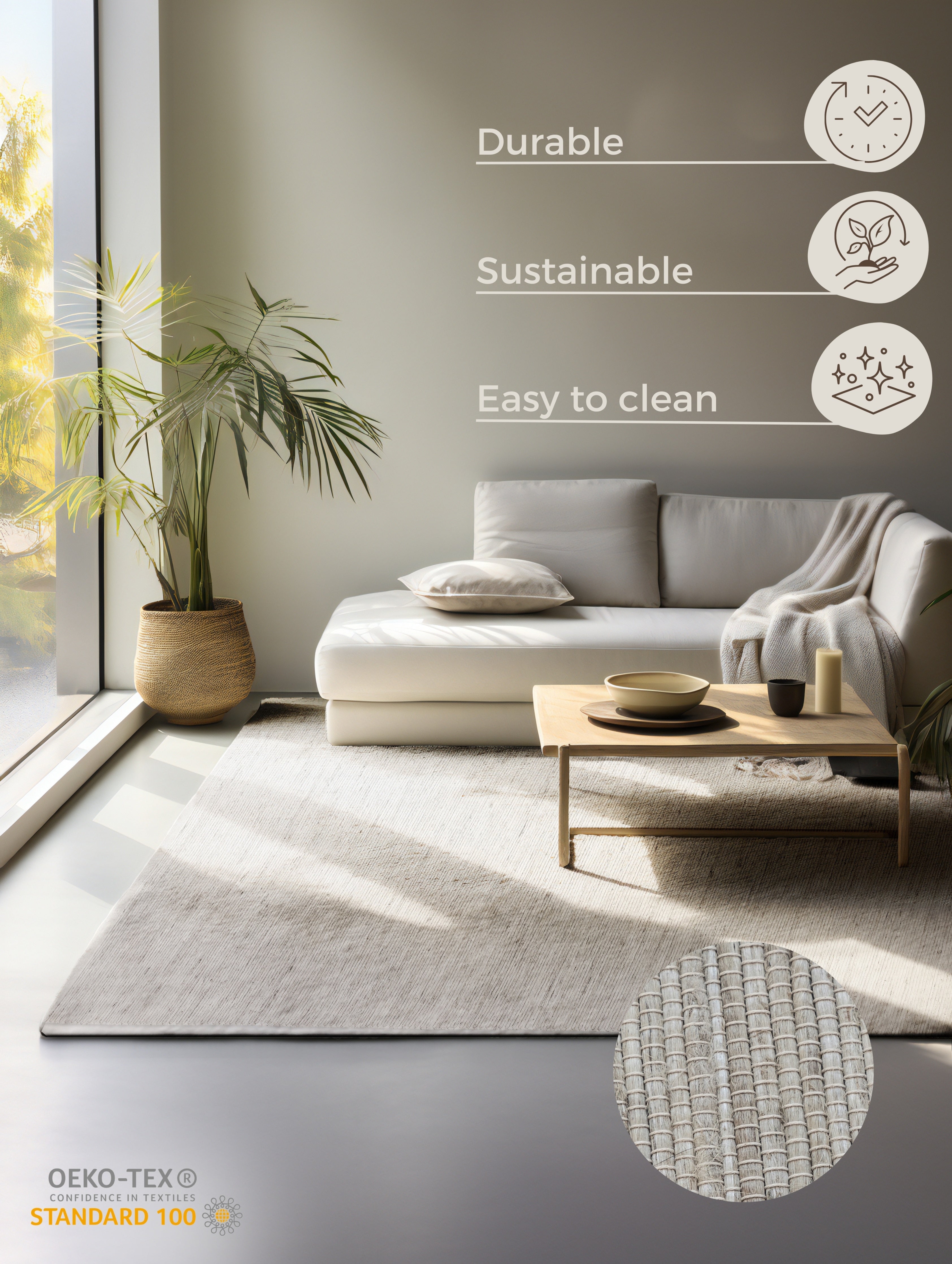 Handloom 1.0 er mere end bare et smukt tæppe; det er designet til at holde. Den robuste blanding af jute, uld og bomuld gør tæppet slidstærkt og nemt at rengøre, perfekt til hverdagens udfordringer. Den naturlige jute er kendt for sine robuste egenskaber, mens uld og bomuld tilfører en blødhed og varme. Tæppet er desuden velegnet til gulvvarme, så du kan nyde den behagelige varme under fødderne året rundt. Den smukke, naturlige farve og den håndvævede struktur giver tæppet et tidløst udtryk, der passer ind i enhver indretningsstil.